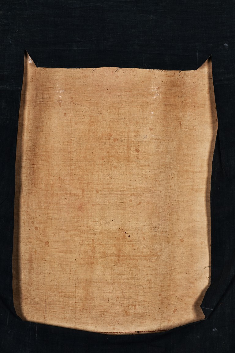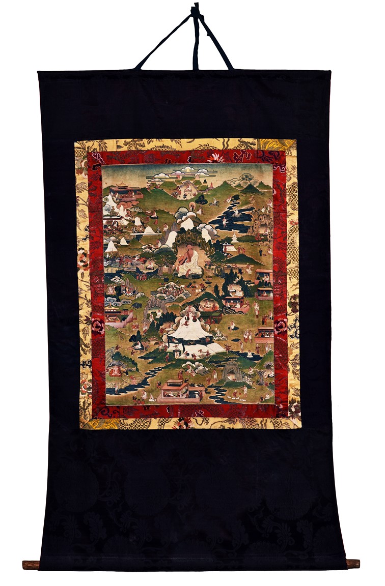 此唐卡為棉布質地,礦物色描繪,原配漢式錦裱,繪工極為精細,華貴,著色優雅至極,書畫以山巒為背景,以之字形營帳式構圖詳細的描繪了米拉日巴尊者一生事跡,為清代藏地唐卡中之極品。噶舉派上師米拉日巴(1040-1123)不僅被稱為大成就者,也因其豐富而優美的詩篇聞名遐邇,其作品有『十萬詩篇』之譽,可謂藏地最受尊崇的聖賢之一。類似風格可參閱美國紐約市Rubin Museum of Art(魯賓博物館)David Jackson所著Patron and Painter: Situ Panchen and the Revival of the Encampment Style (Masterworks of Tibetan Painting), 6.22.