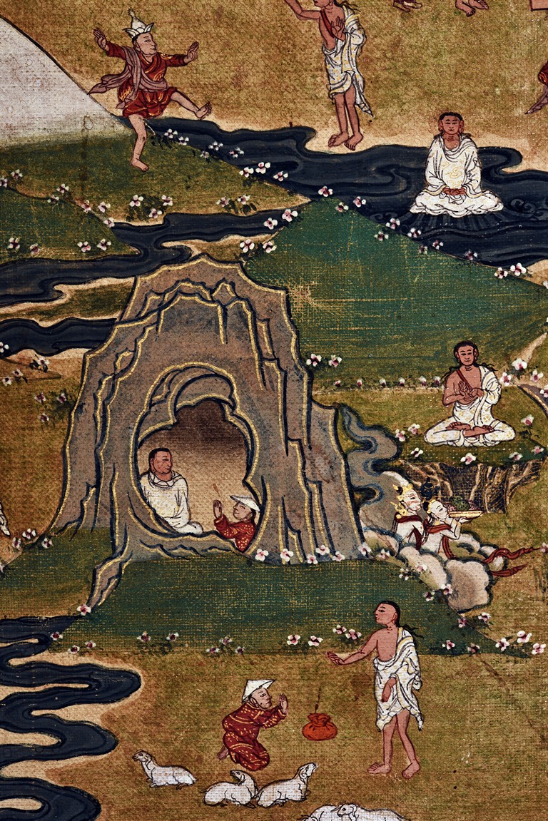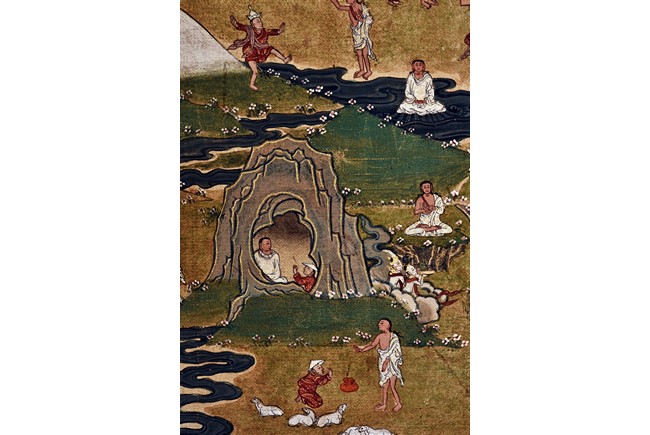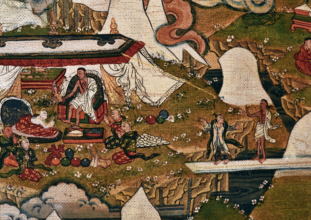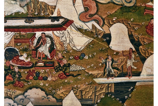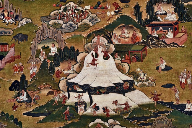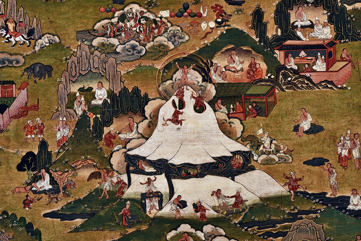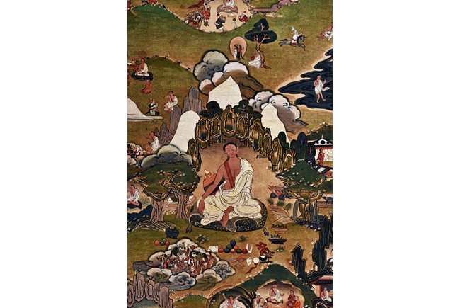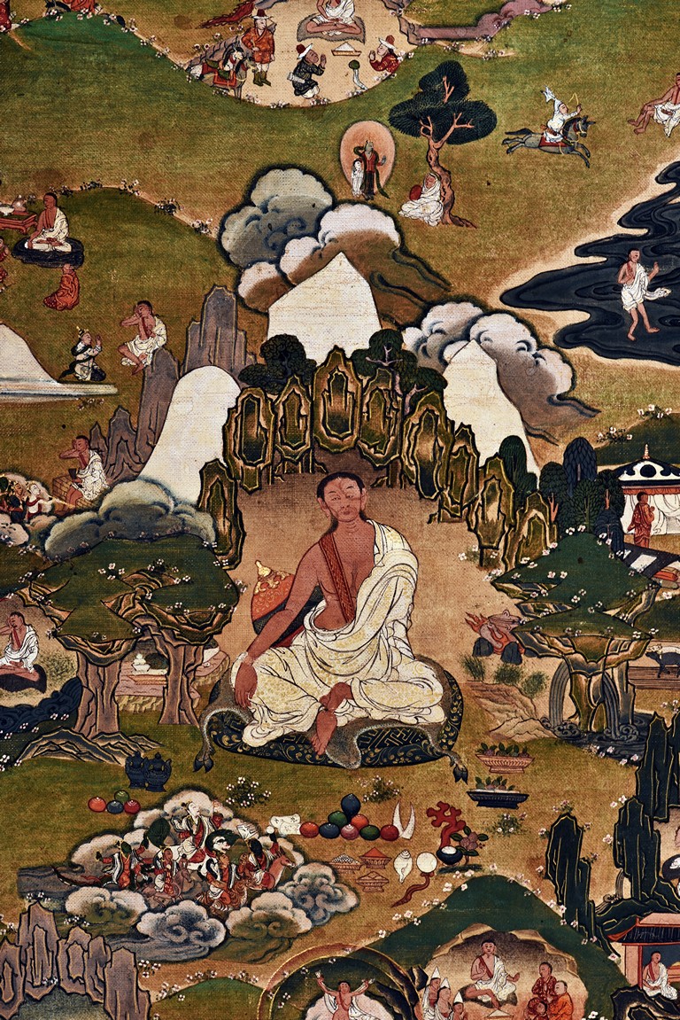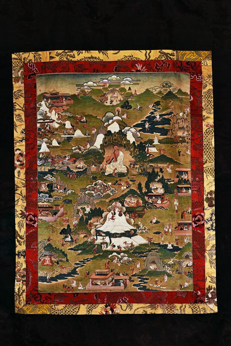 Milarepa is shown seated at center in relaxed pose on a deer skin cushion, dressed in white robe with a red belt draped across shoulder and chest, the face titled to the left with calm expression and long hair in the back, the background with sacred mountainous landscape, surrounded by various life stories of Milarepa with extremely delicate details, all set within a mountainous landscape wit auspicious clouds, river, and palace. Mineral pigments on cloth. 18th Century.