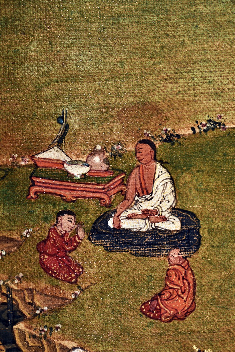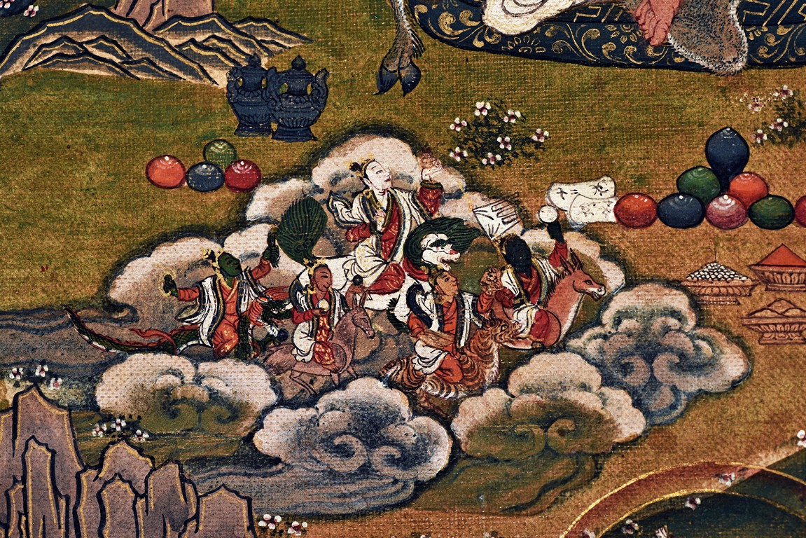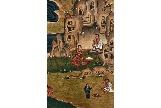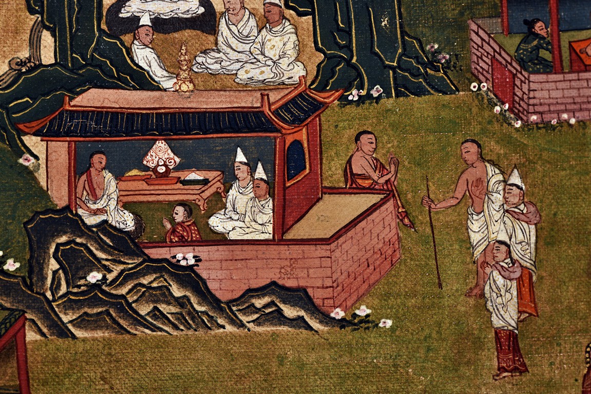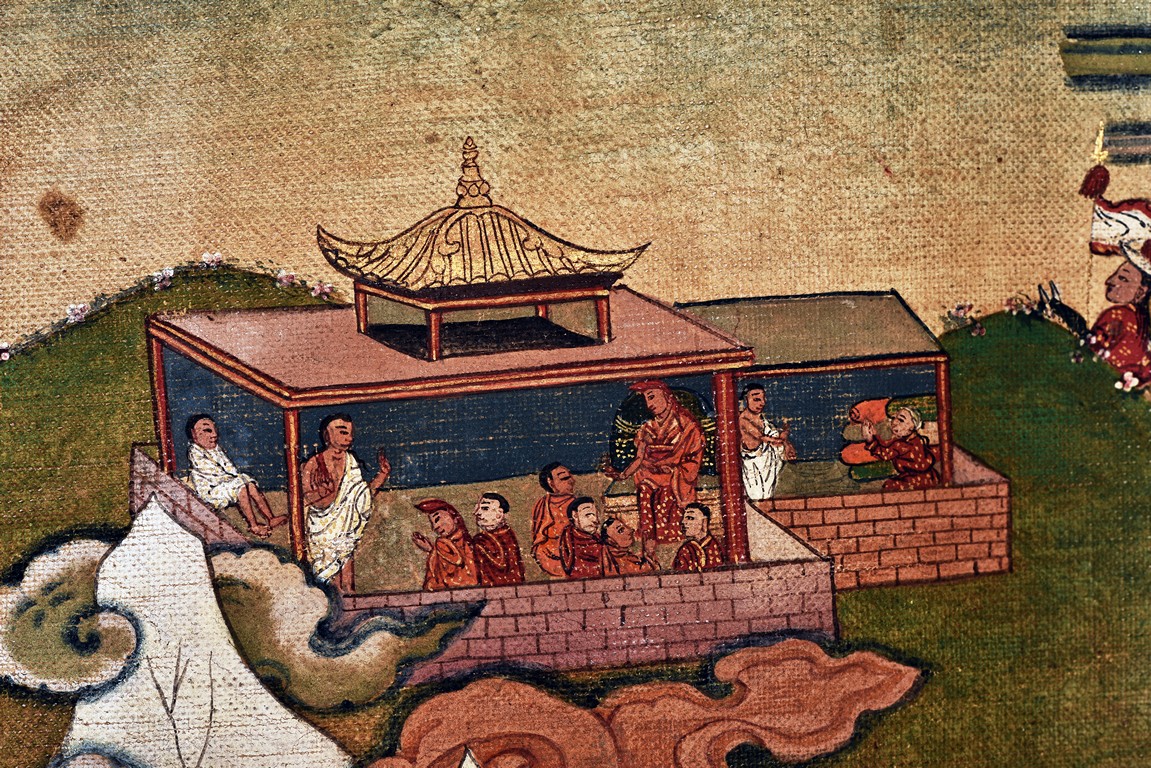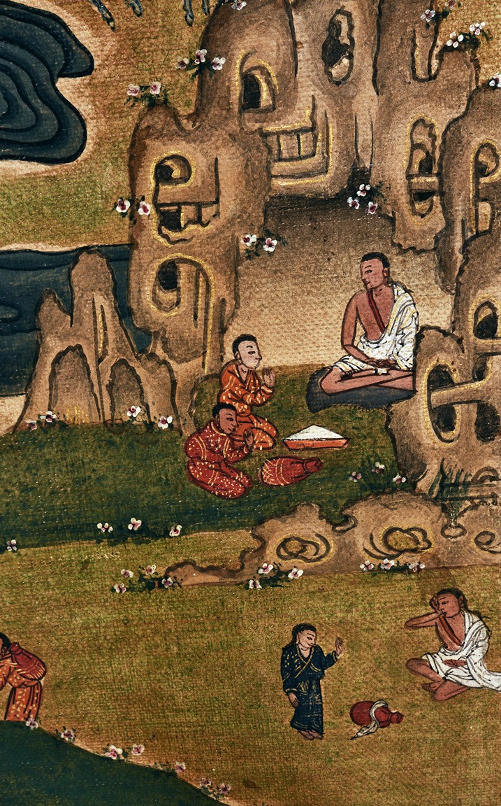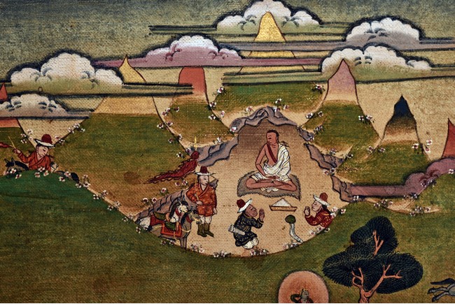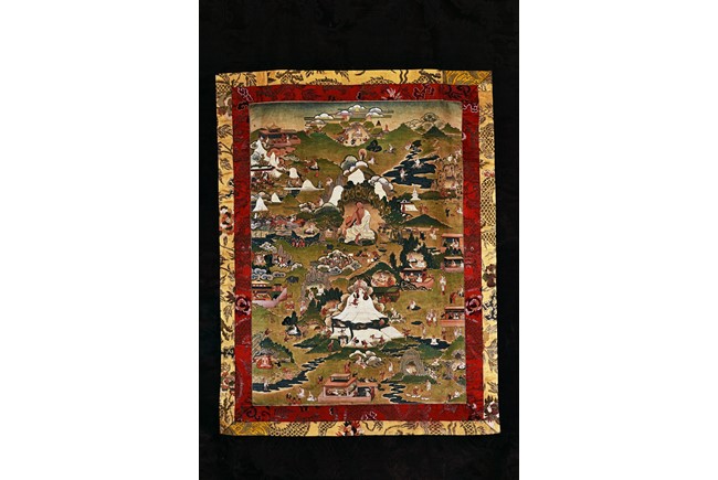 Milarepa is shown seated at center in relaxed pose on a deer skin cushion, dressed in white robe with a red belt draped across shoulder and chest, the face titled to the left with calm expression and long hair in the back, the background with sacred mountainous landscape, surrounded by various life stories of Milarepa with extremely delicate details, all set within a mountainous landscape wit auspicious clouds, river, and palace. Mineral pigments on cloth. 18th Century.