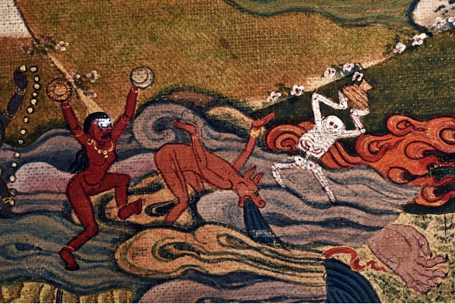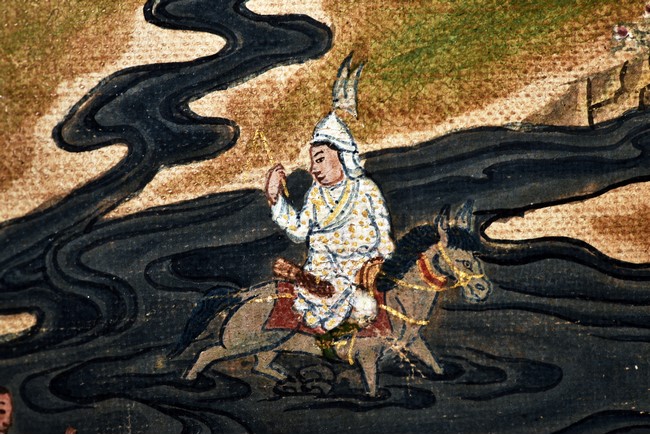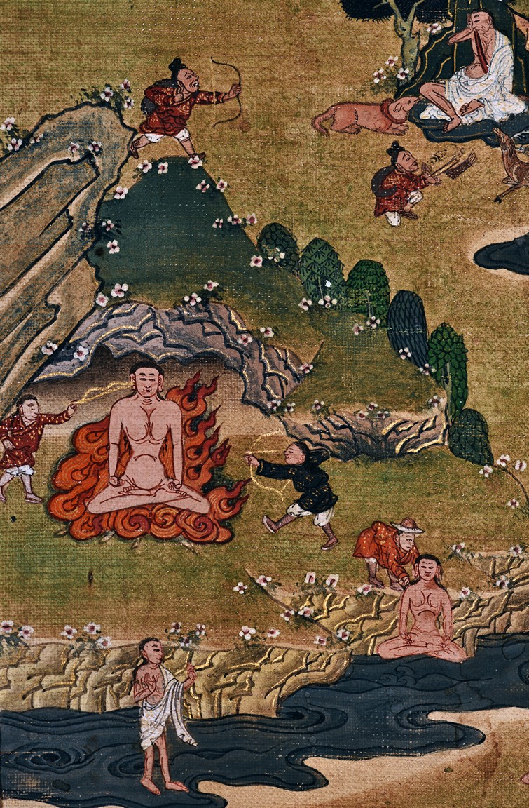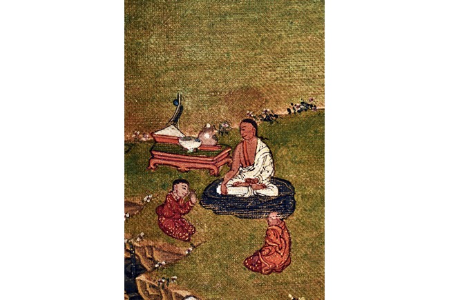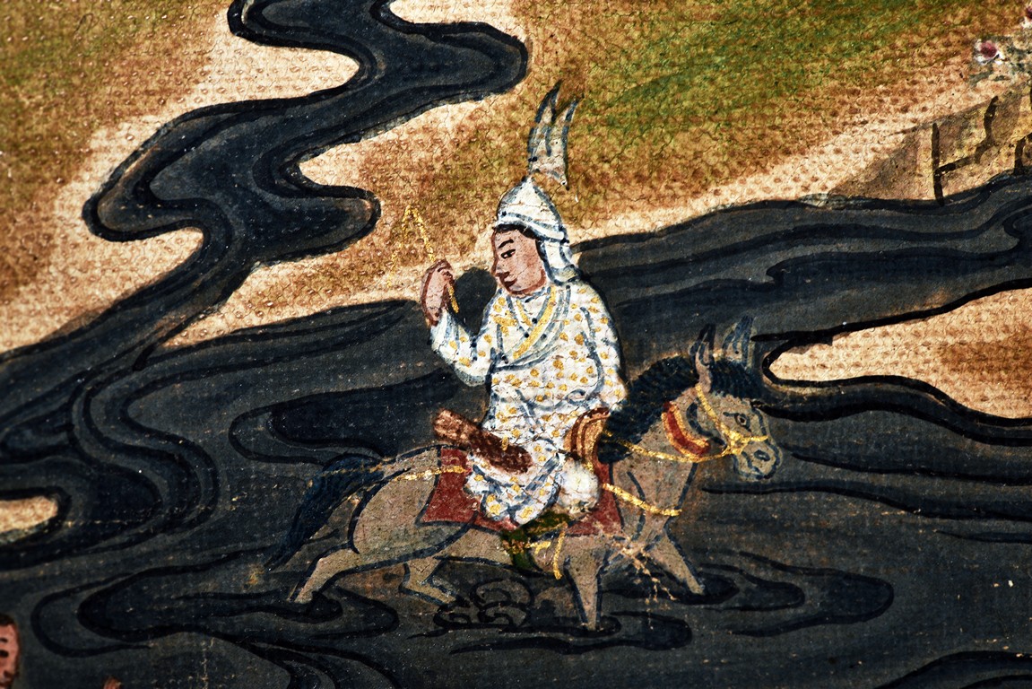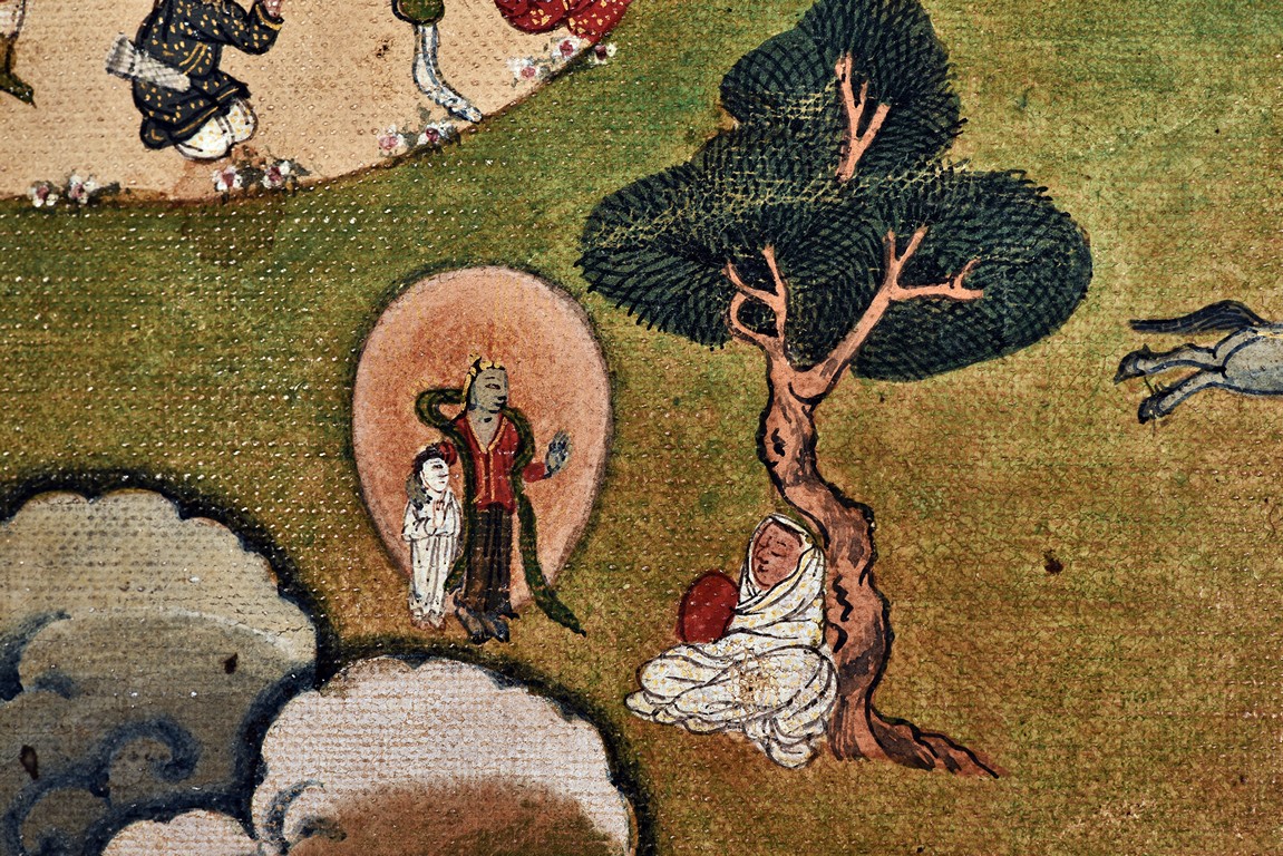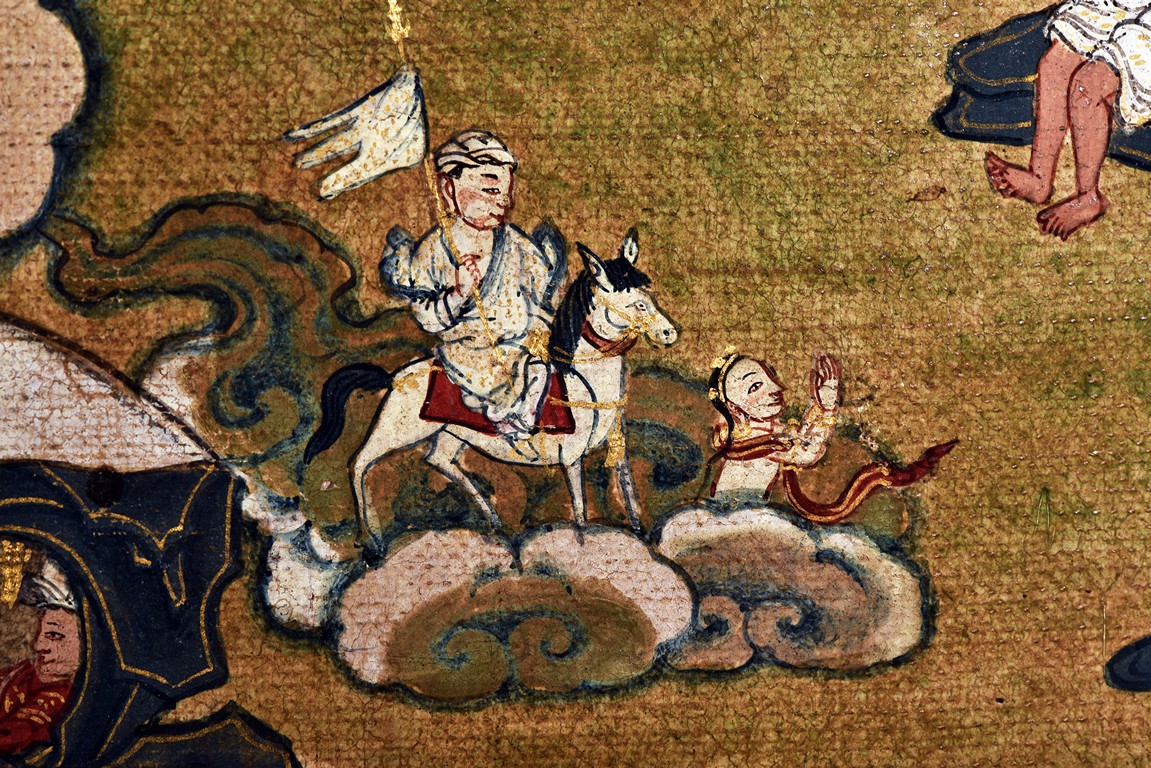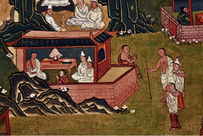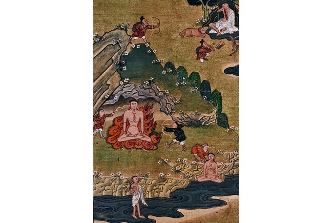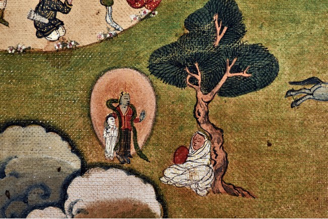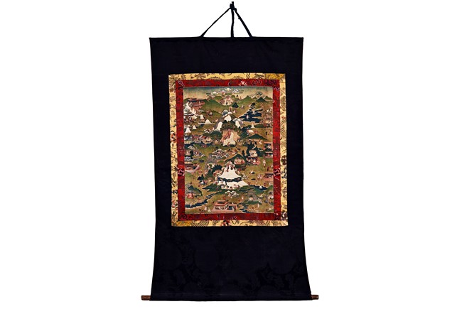 Milarepa is shown seated at center in relaxed pose on a deer skin cushion, dressed in white robe with a red belt draped across shoulder and chest, the face titled to the left with calm expression and long hair in the back, the background with sacred mountainous landscape, surrounded by various life stories of Milarepa with extremely delicate details, all set within a mountainous landscape wit auspicious clouds, river, and palace. Mineral pigments on cloth. 18th Century.