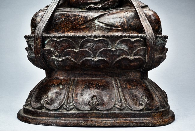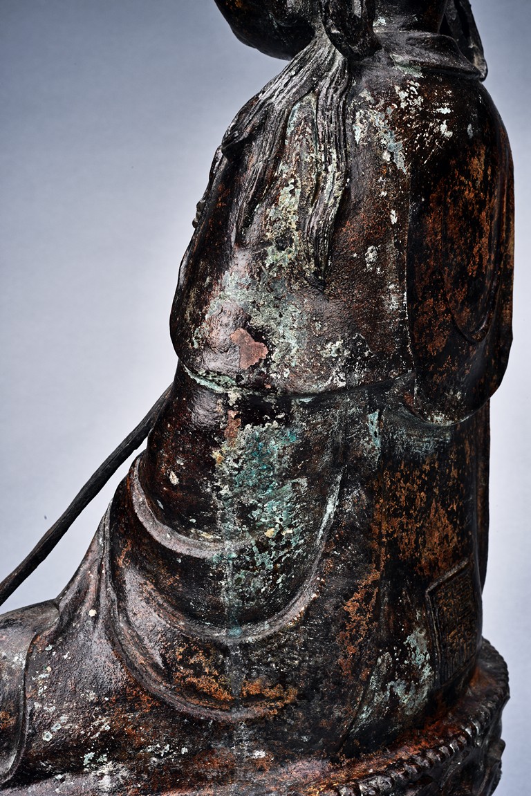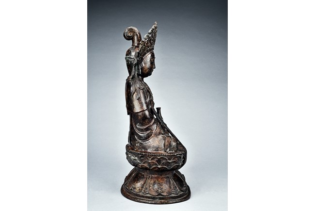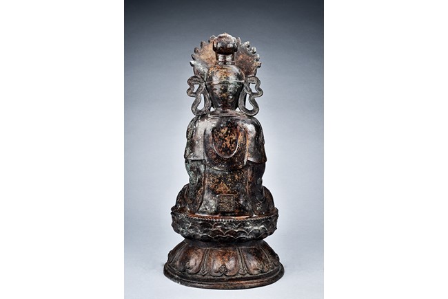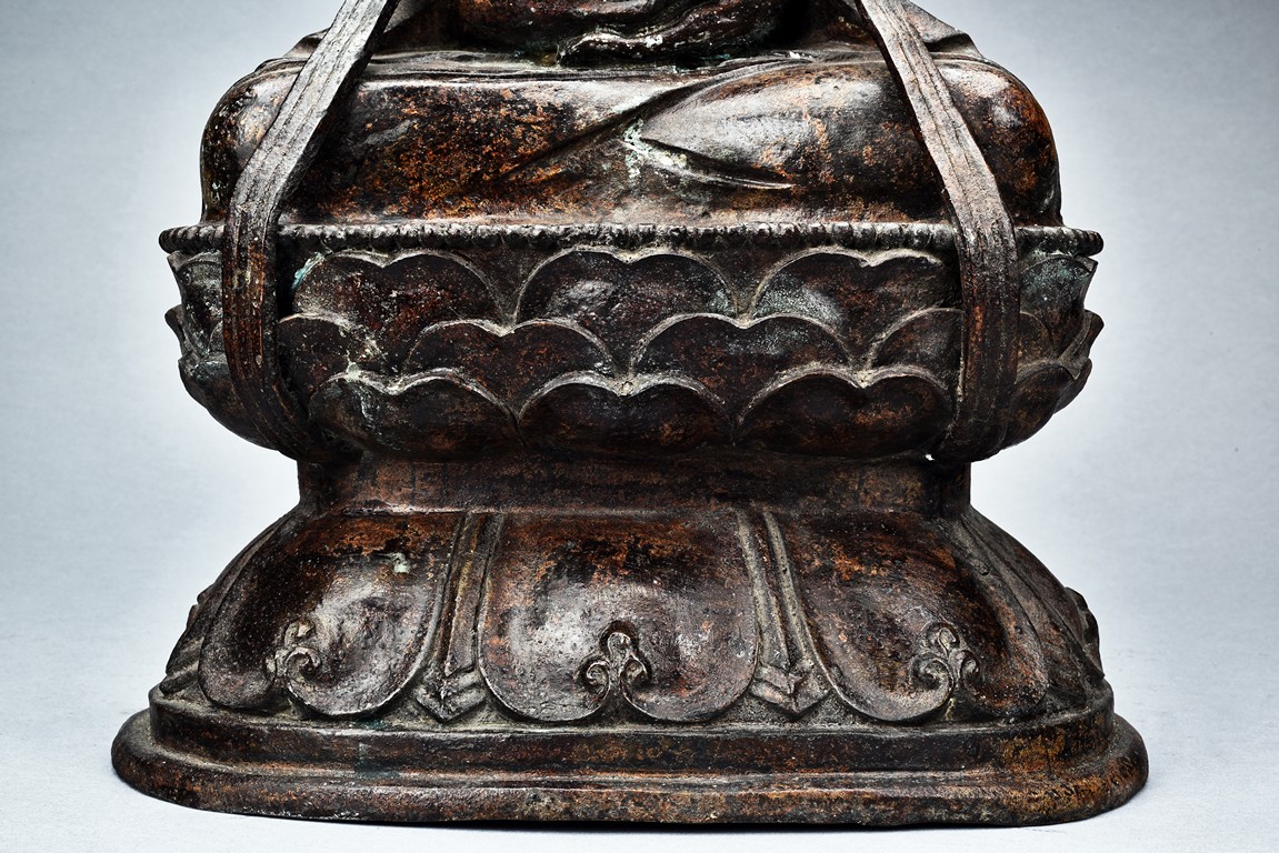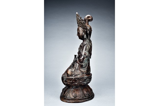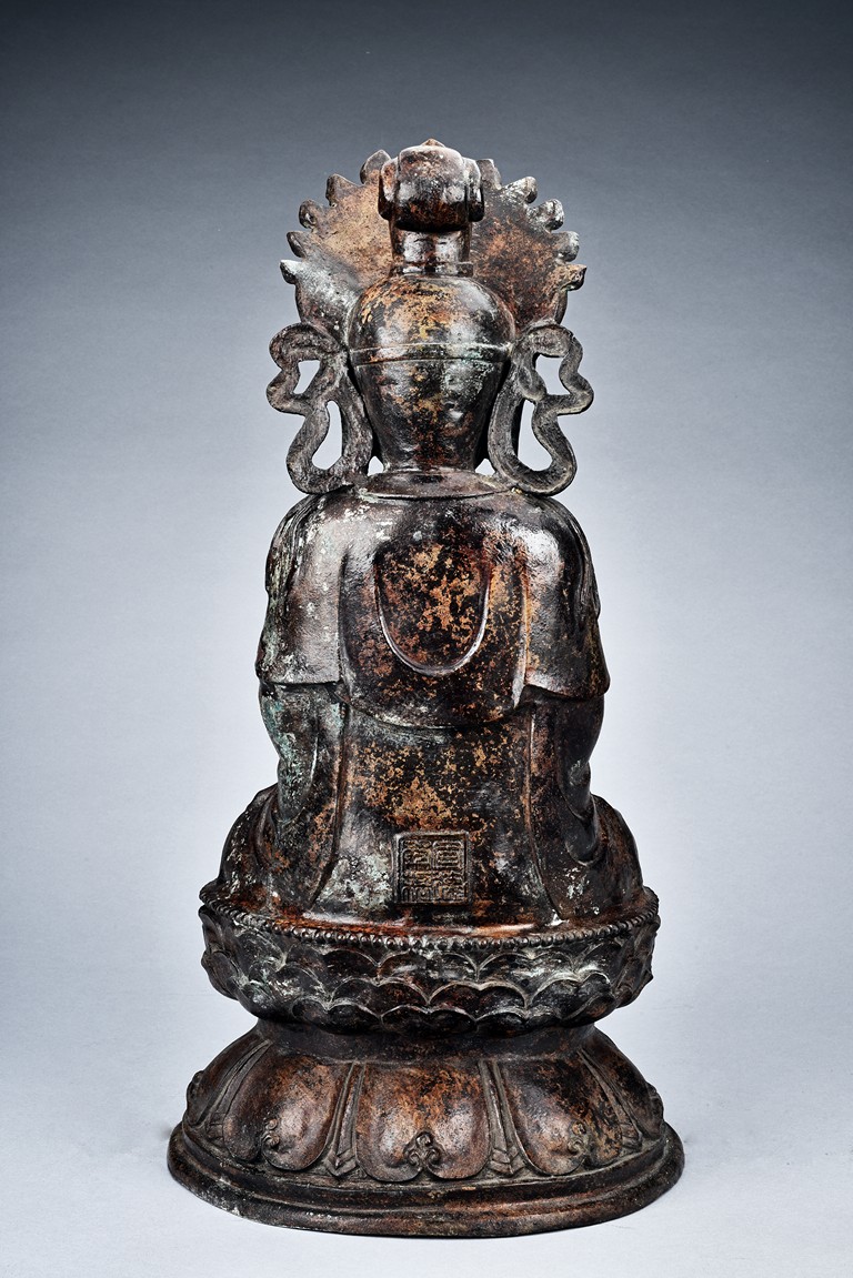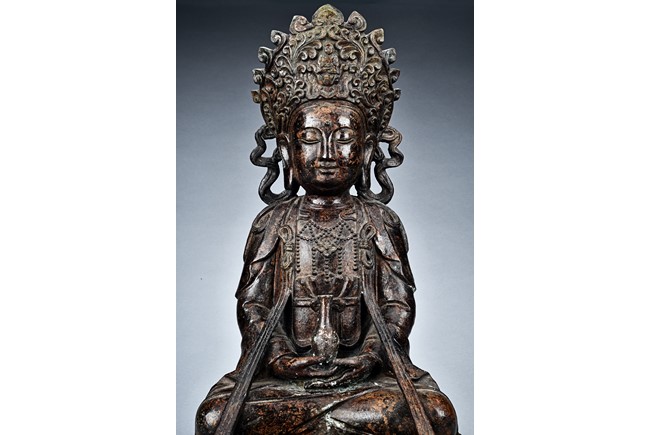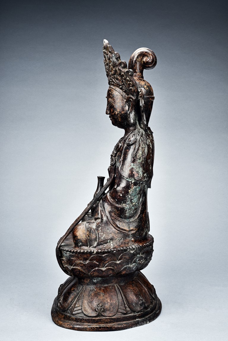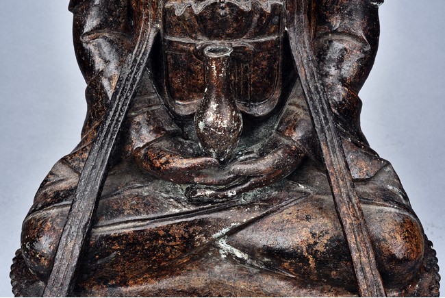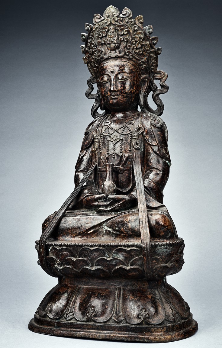 Shown seated in padmasana on a double lotus base, with both hands holding a vase, adorned with muliple beaded necklace, the face with meditative expression and wearing a delicate crown with a Amitabha figure and tied with ribbon. The back impressed with a four character Xuande mark. Ming Dynasty period.