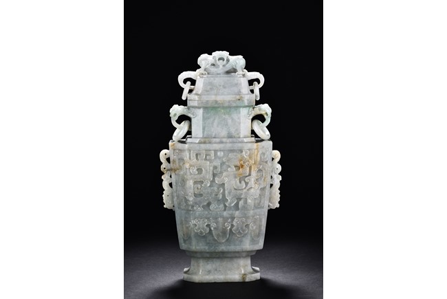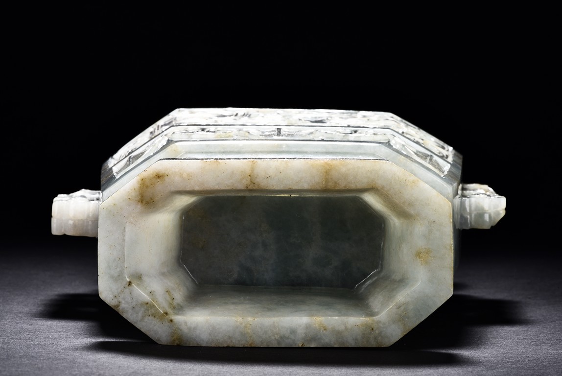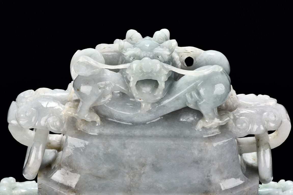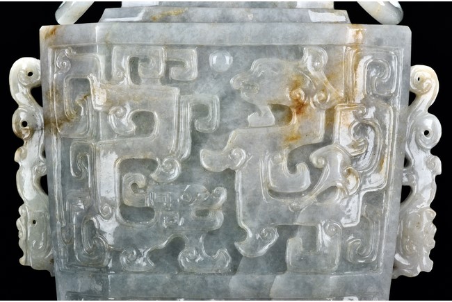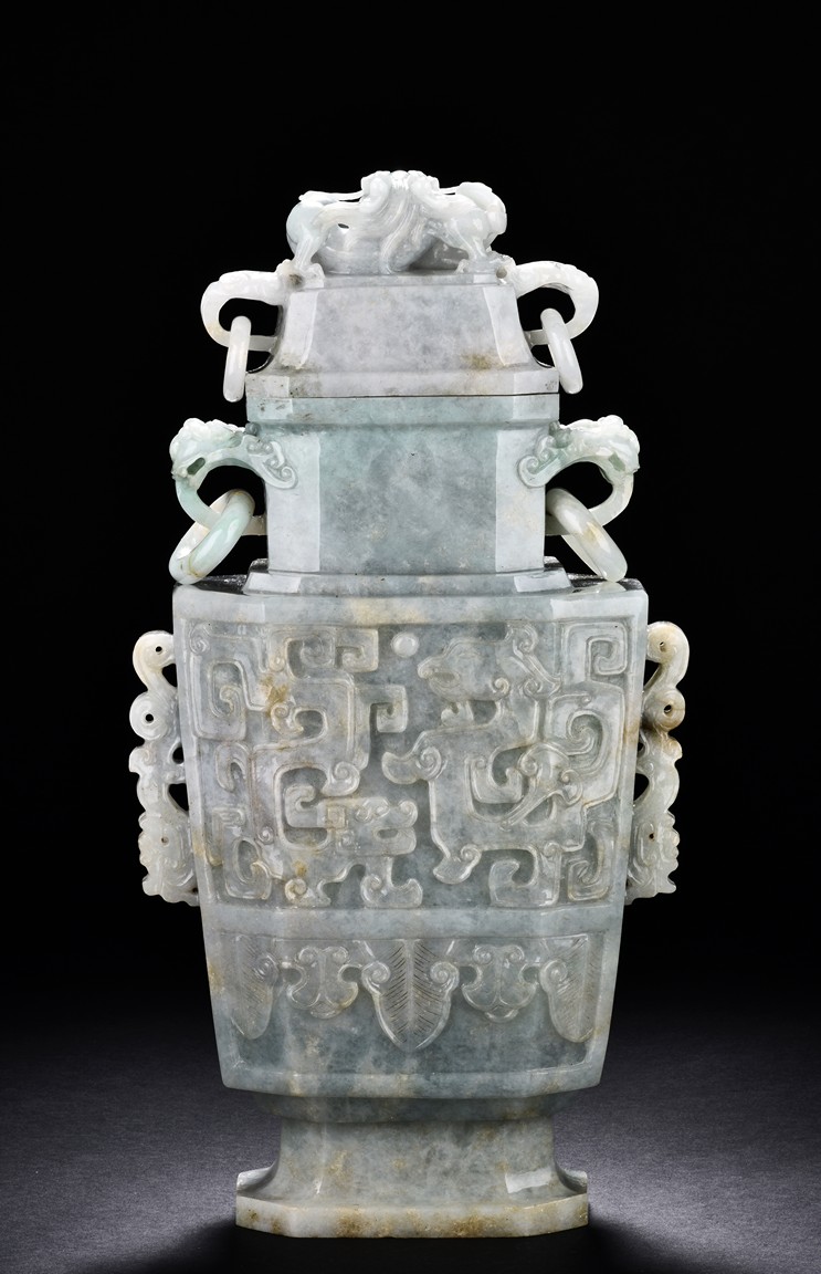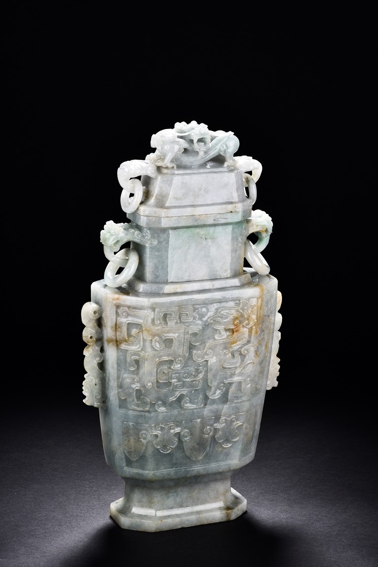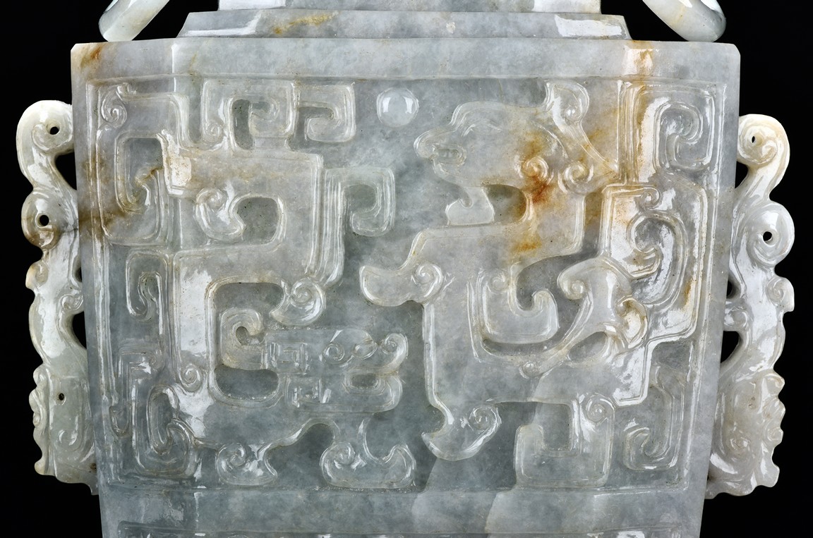 Of flattened square hu form, the jadeite vase is carved raised on a splayed foot, the body carved in relief with two confronting archaistic dragon motif, with a narrow band of leaves below, flanked by scroll lugs, the waisted neck flanked by dragon-head handles suspended with rings. The cover further surmounted by a carved coiling dragon. The stone is of translucent white and green tone with russet markings and skins. Qing Dynasty period.