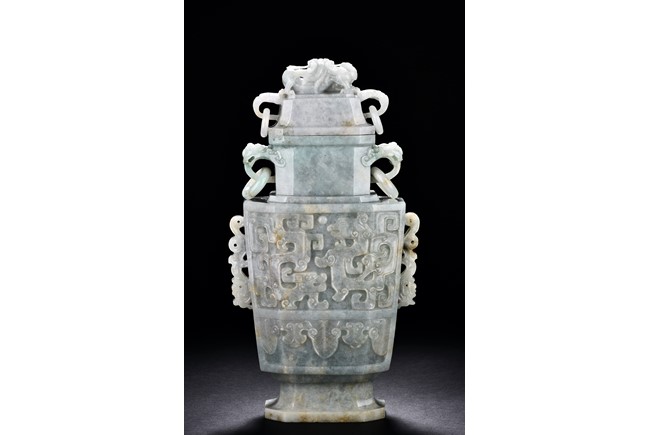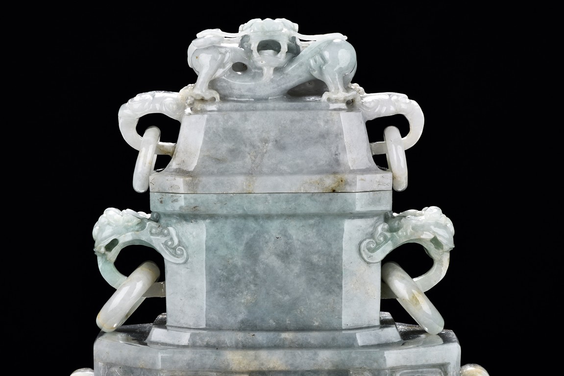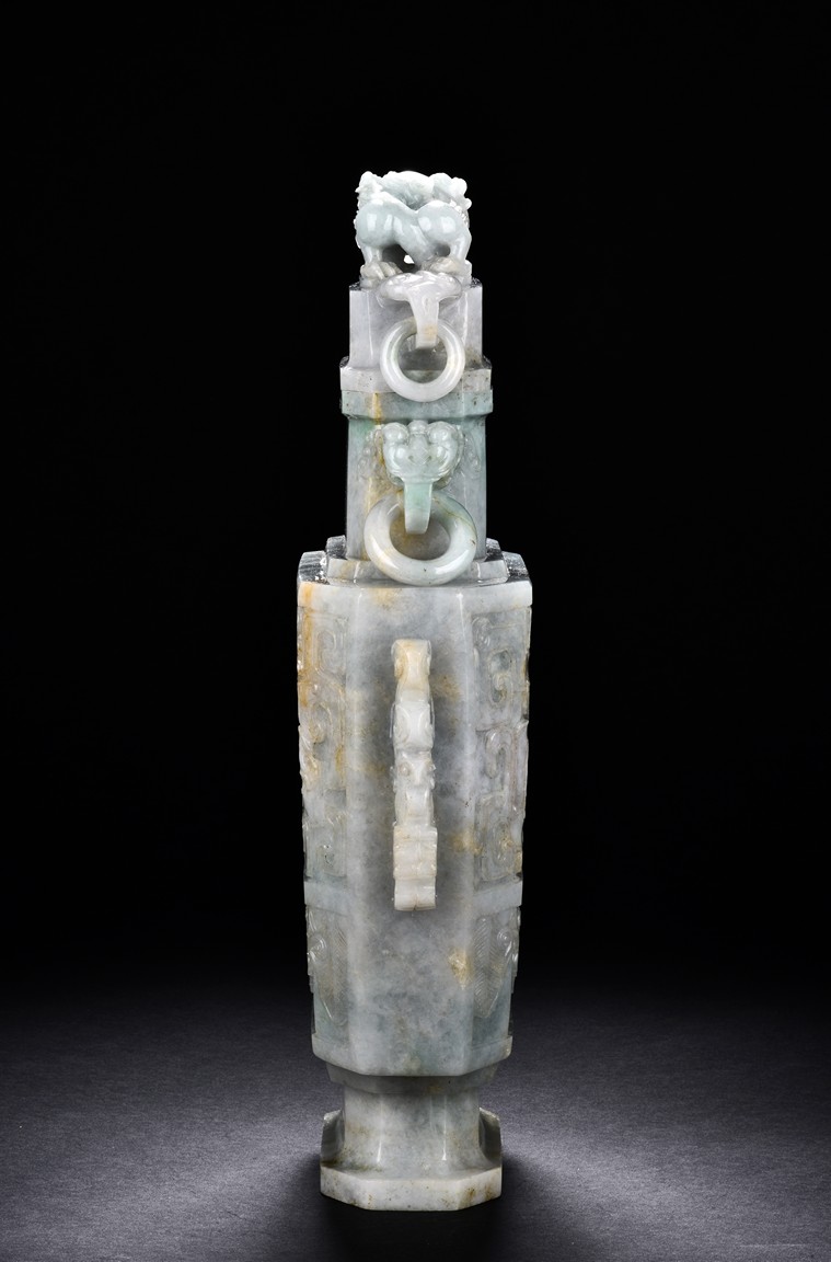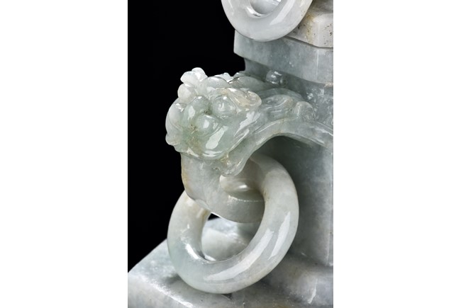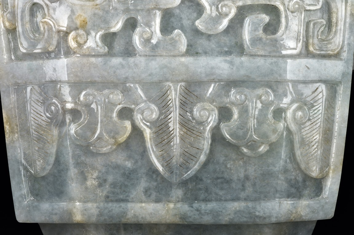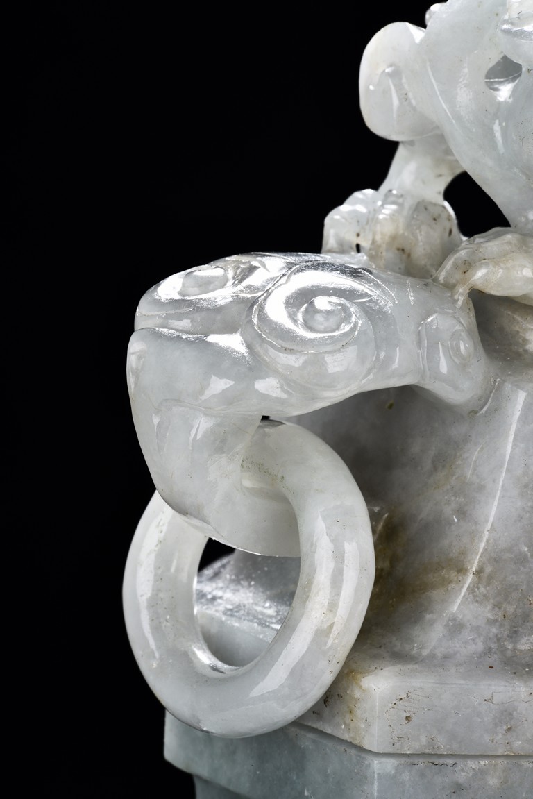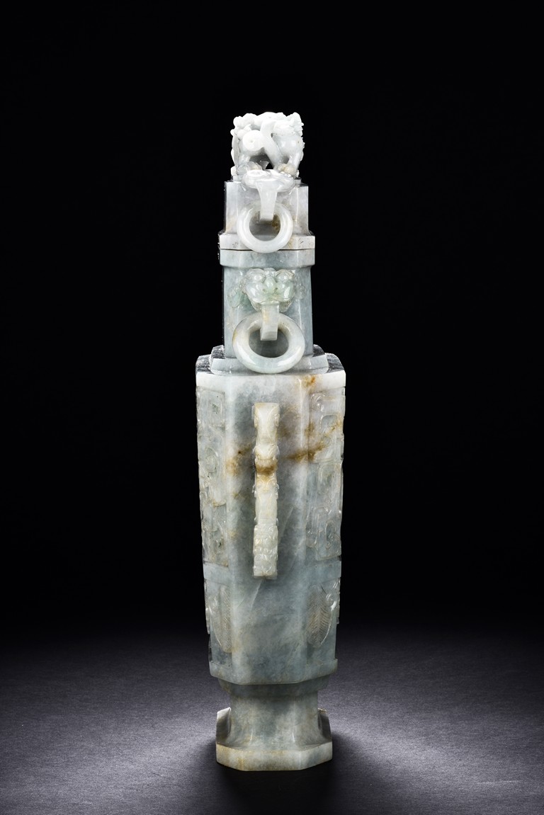 Of flattened square hu form, the jadeite vase is carved raised on a splayed foot, the body carved in relief with two confronting archaistic dragon motif, with a narrow band of leaves below, flanked by scroll lugs, the waisted neck flanked by dragon-head handles suspended with rings. The cover further surmounted by a carved coiling dragon. The stone is of translucent white and green tone with russet markings and skins. Qing Dynasty period.