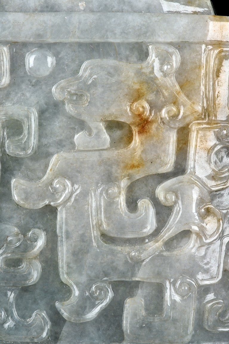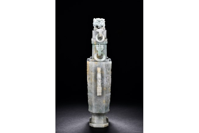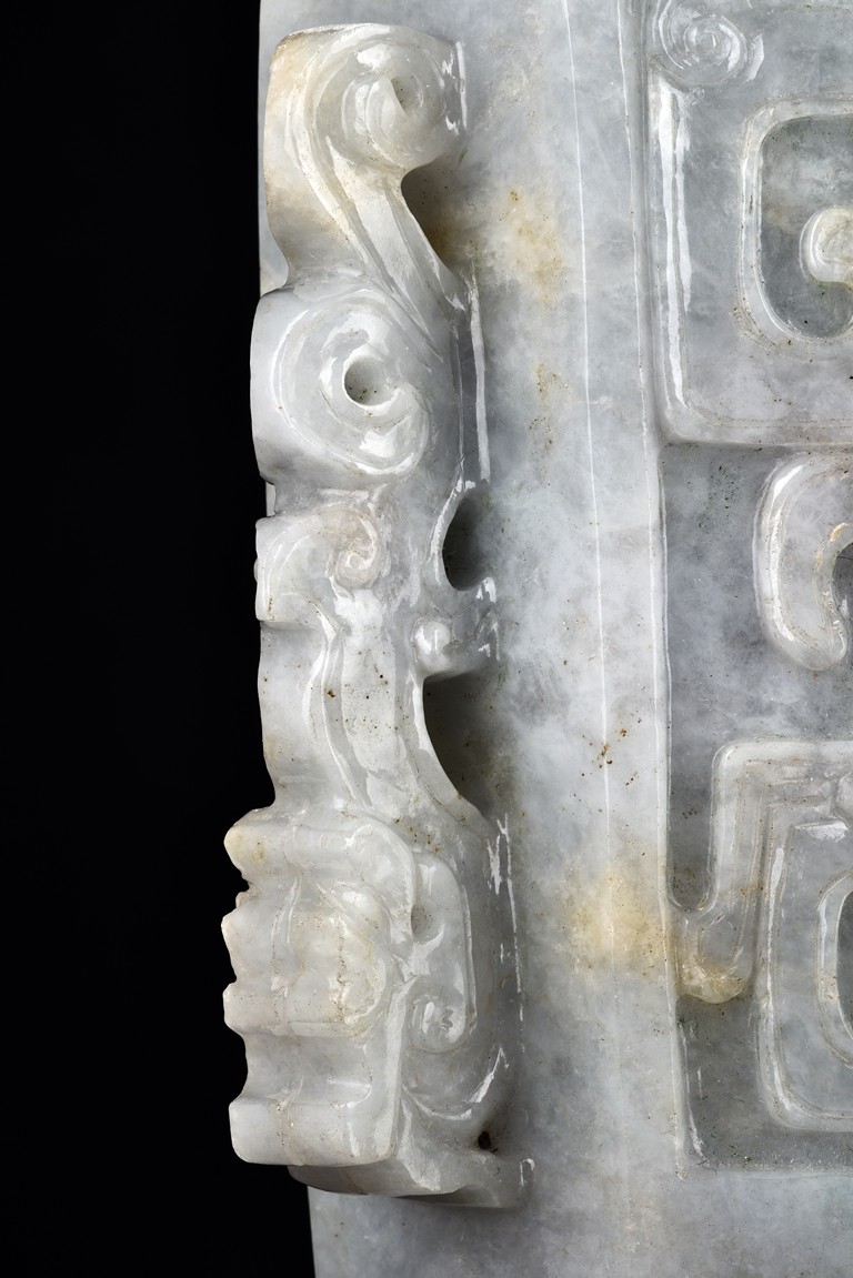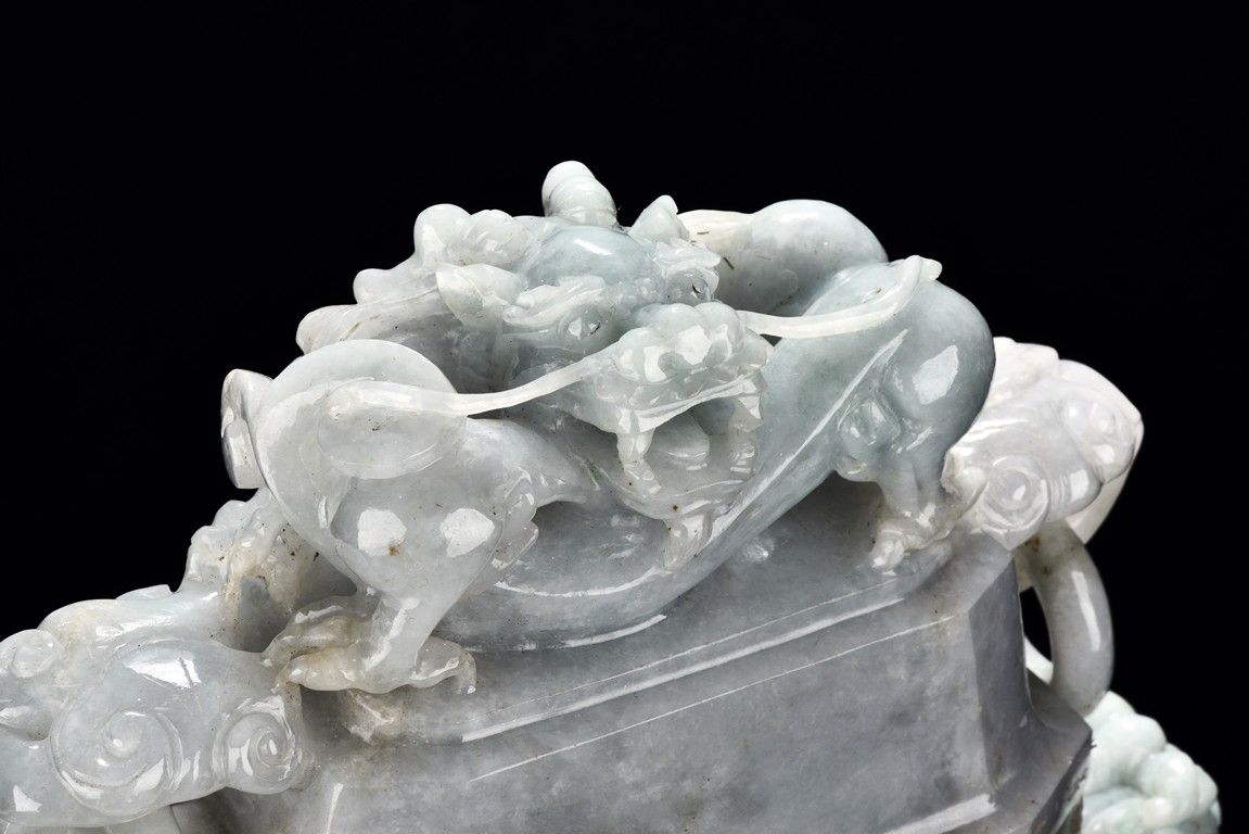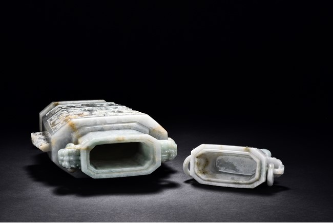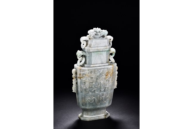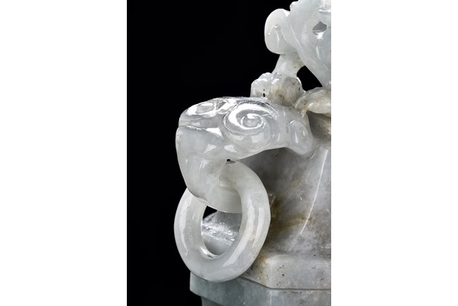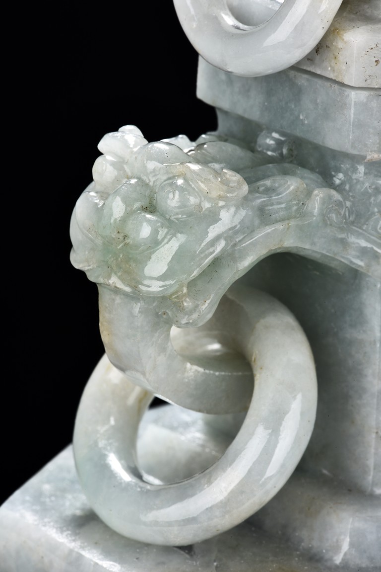 Of flattened square hu form, the jadeite vase is carved raised on a splayed foot, the body carved in relief with two confronting archaistic dragon motif, with a narrow band of leaves below, flanked by scroll lugs, the waisted neck flanked by dragon-head handles suspended with rings. The cover further surmounted by a carved coiling dragon. The stone is of translucent white and green tone with russet markings and skins. Qing Dynasty period.