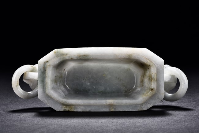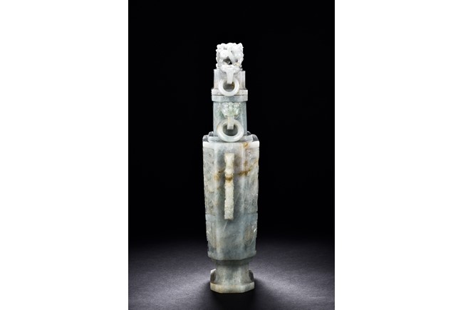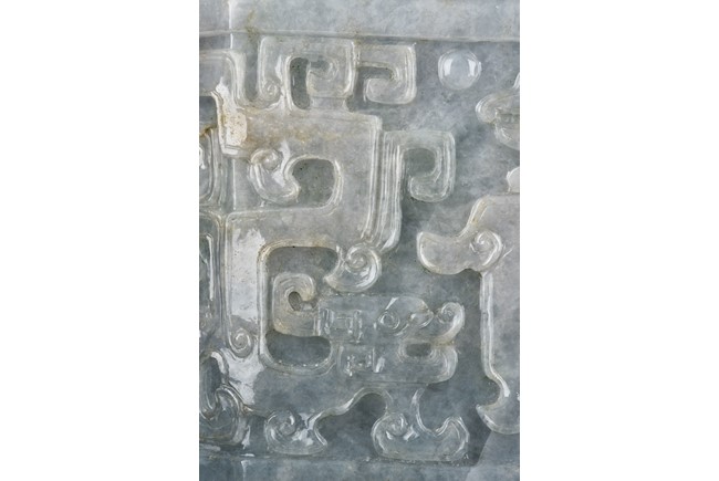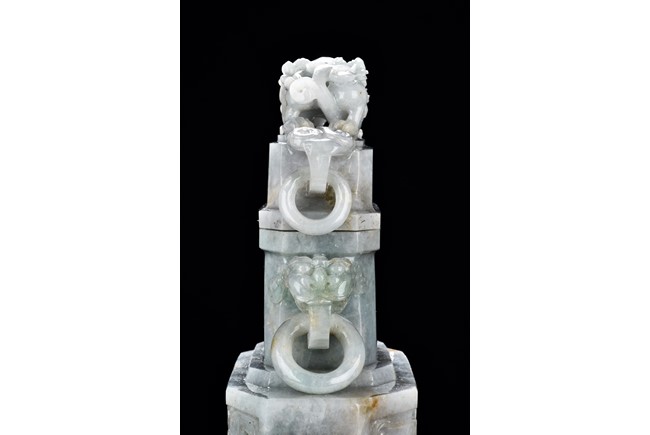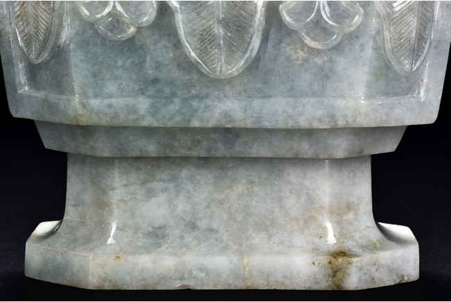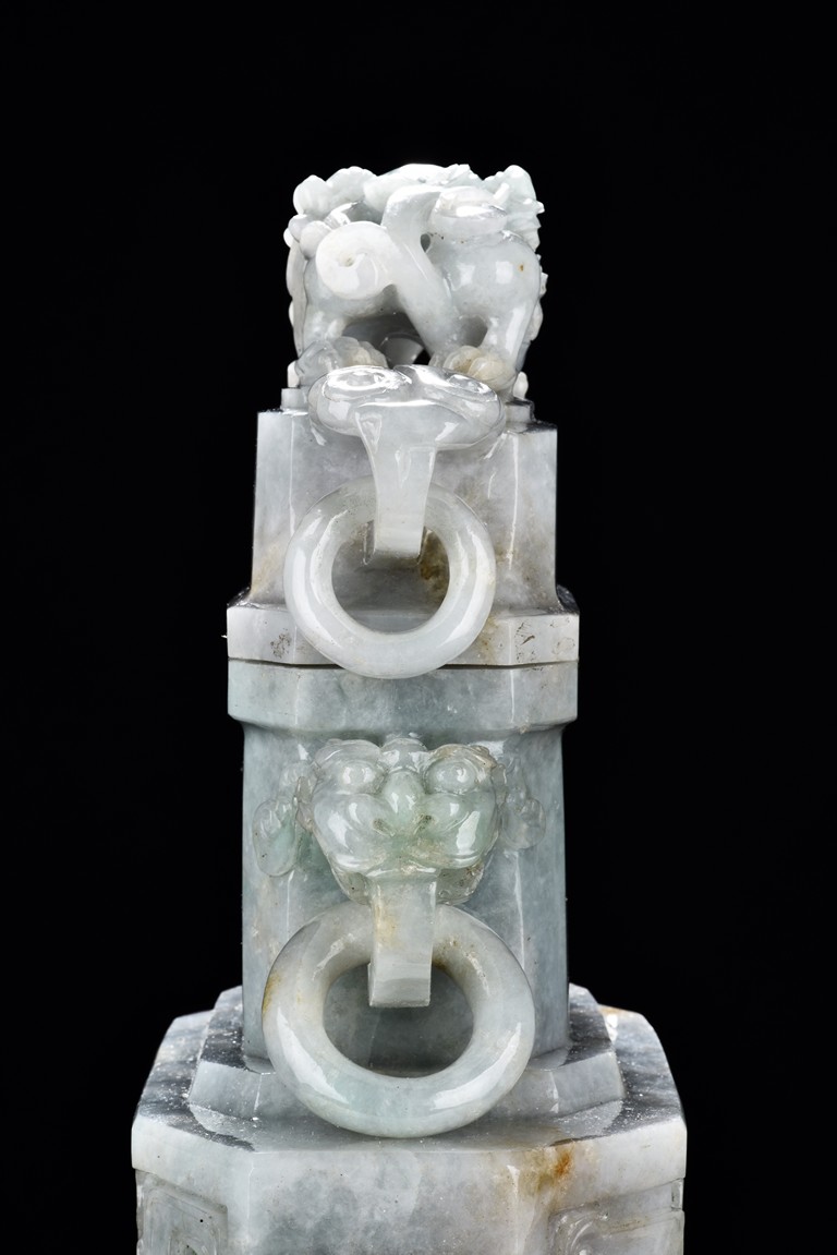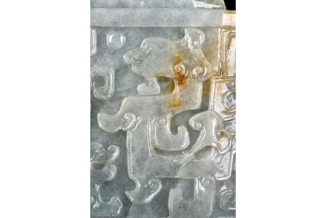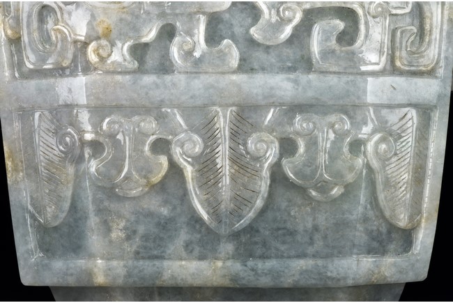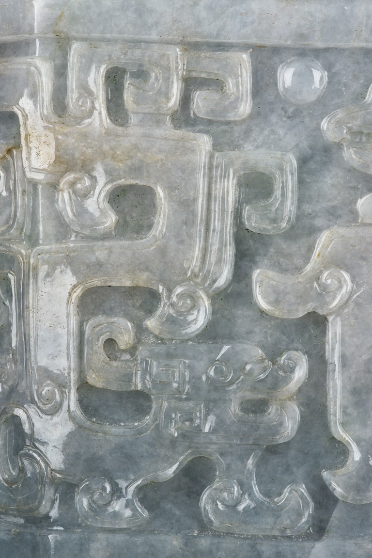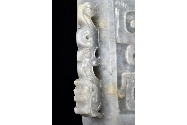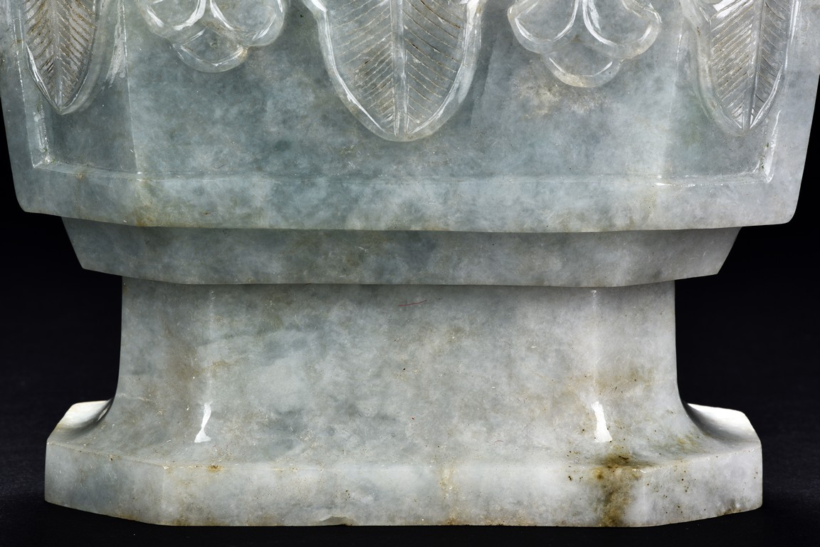 Of flattened square hu form, the jadeite vase is carved raised on a splayed foot, the body carved in relief with two confronting archaistic dragon motif, with a narrow band of leaves below, flanked by scroll lugs, the waisted neck flanked by dragon-head handles suspended with rings. The cover further surmounted by a carved coiling dragon. The stone is of translucent white and green tone with russet markings and skins. Qing Dynasty period.