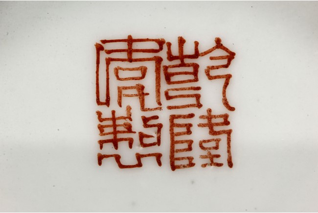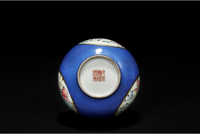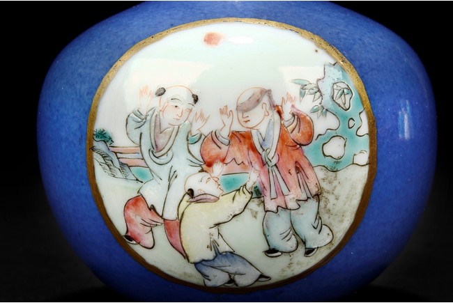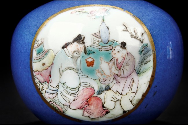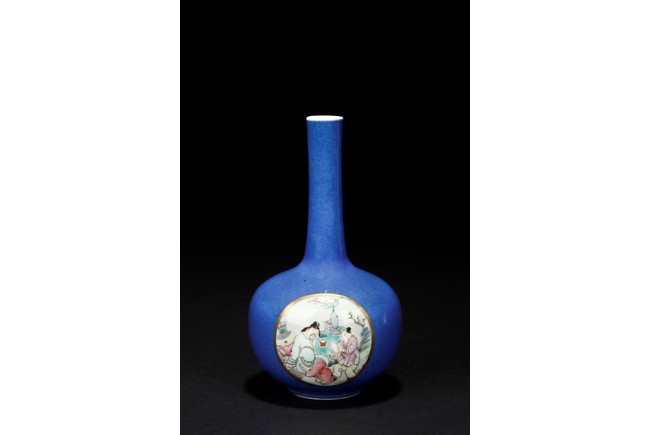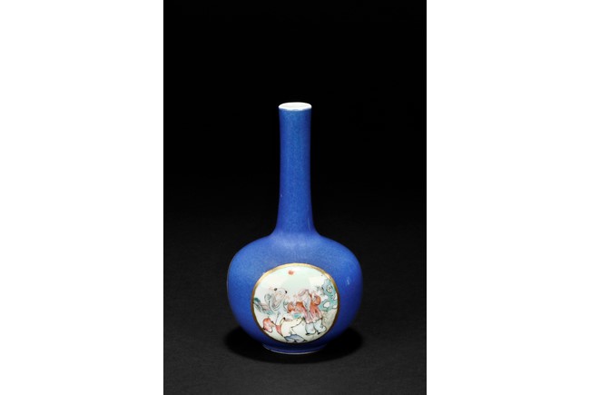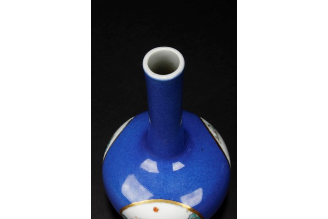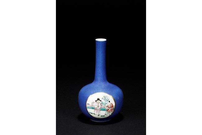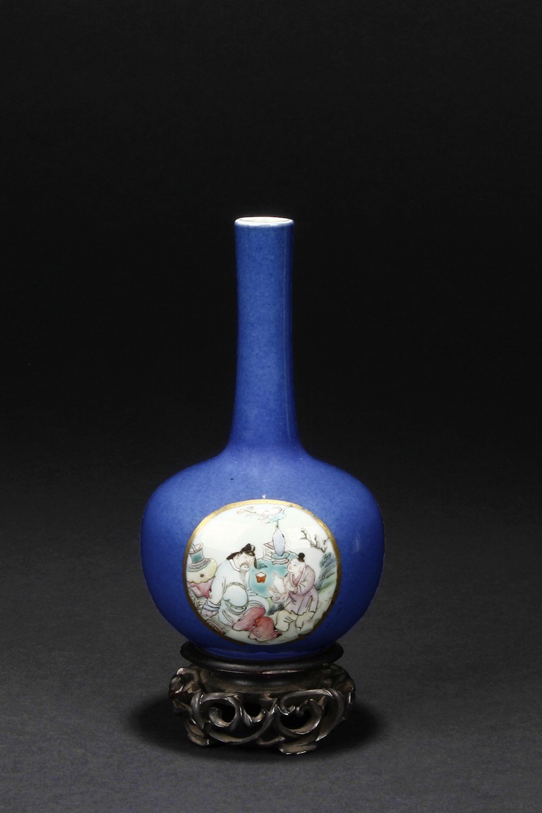 The small vase is enamelled with a gilt medallion enclosing figures in garden setting on both sides, all against the blue ground. The vase rises to a long and cylindrical neck and the bottom bears a four character 'QIANLONG' mark. Qing Dynasty period.