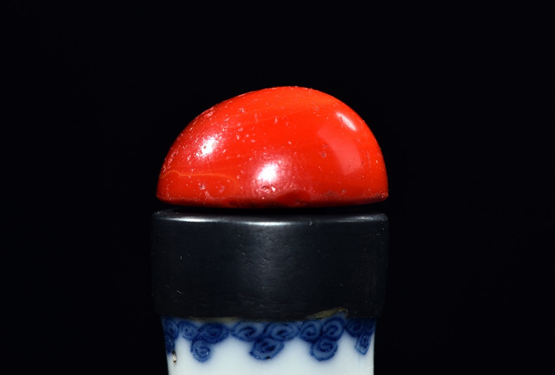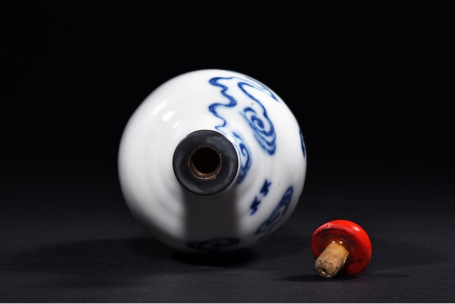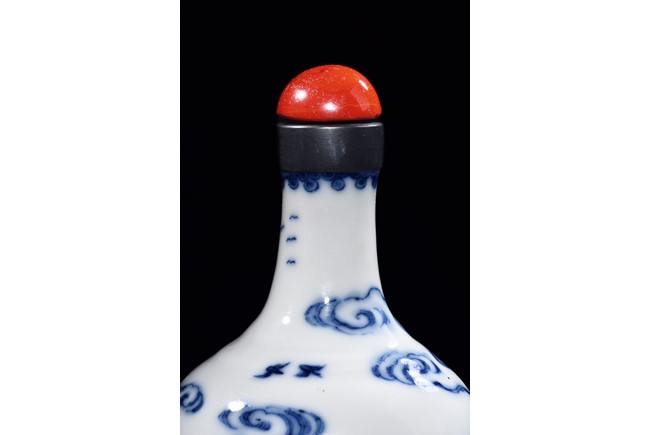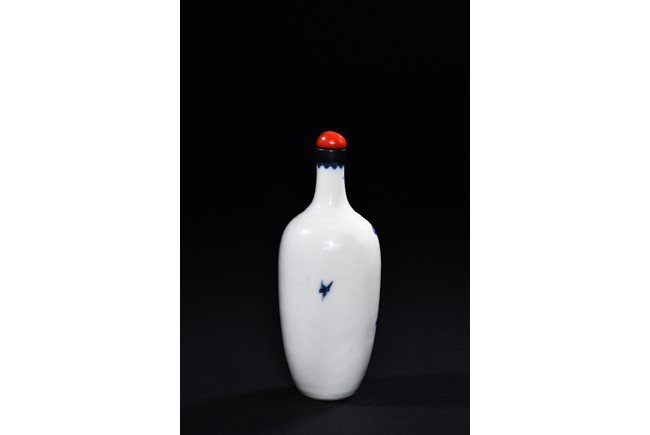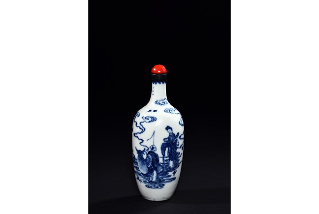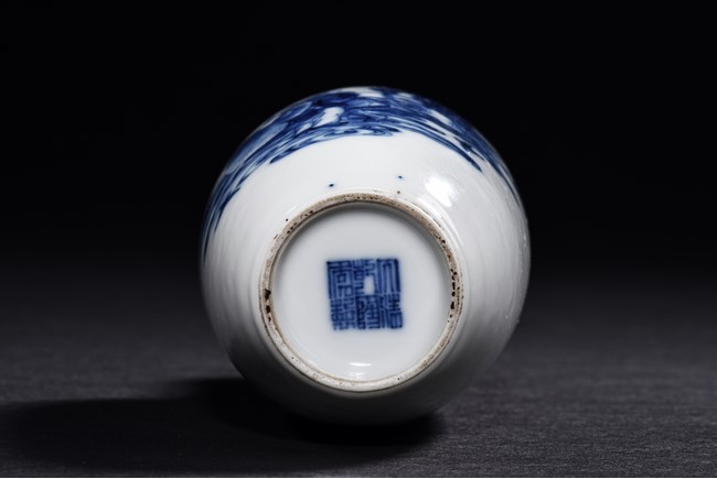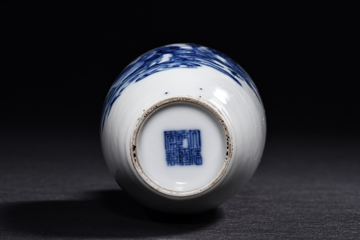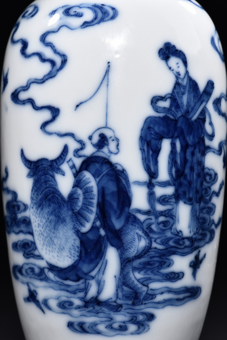 The vase is delicately painted in cobalt blue with the scene of Zhinu the Spinning Maid and Niulang the Herdboy at their annual meeting on the night of the seventh day of the seventh lunar month, the body raisesto a slender neck , the bottom bears six character 'Qianlong' mark. Qing Dynasty period.