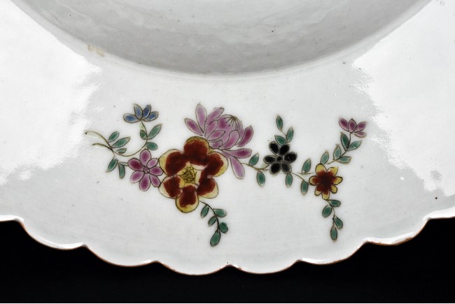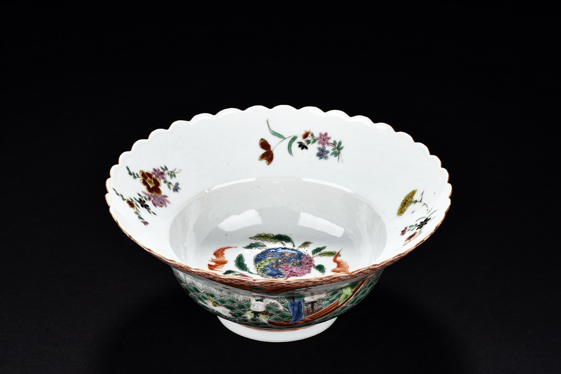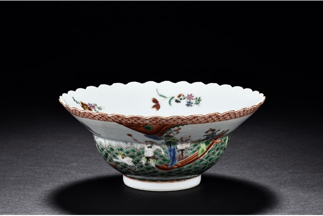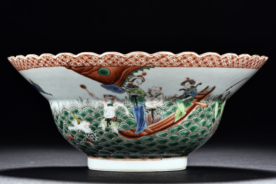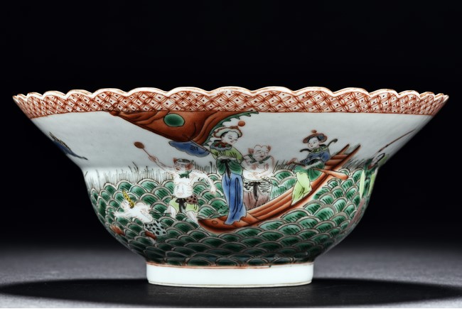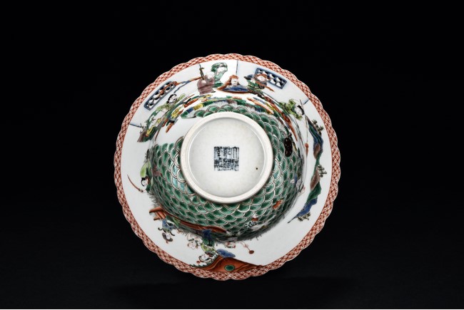 Potted with sides rising to widely flared rim, the body finely enamelled with continous scene of historical stories, the bottom bears apocryphal six character 'Qianlong' mark. Qing Dynasty period.