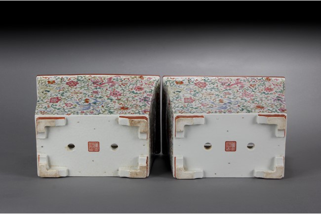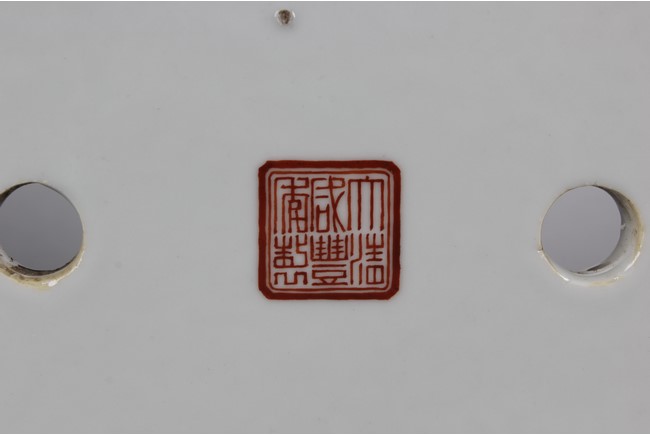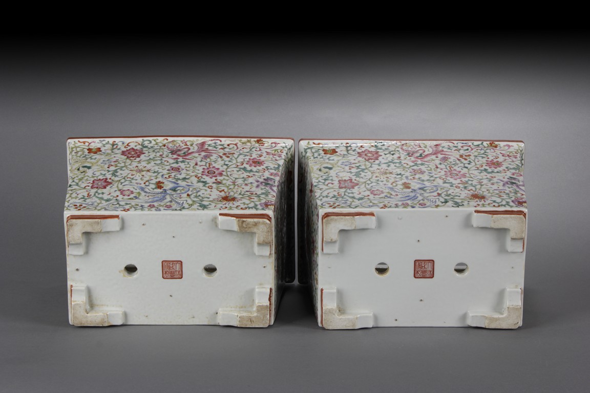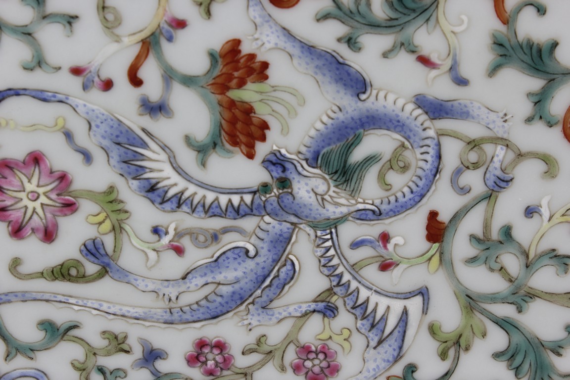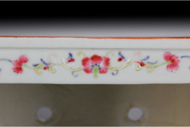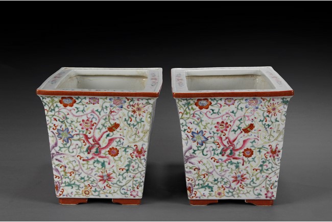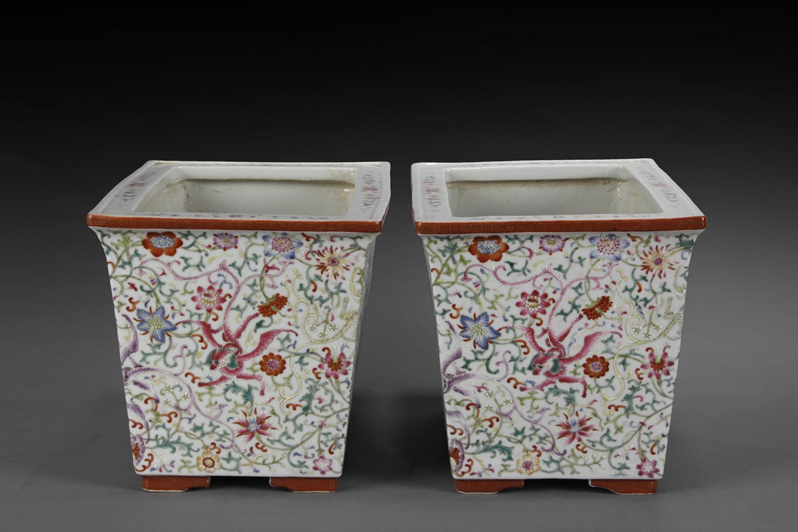Of tapering rectangular form, the body painted with colorful dragons amidst dense lotus flowers and vines, the lipped rim painted with peony flowers and vines, the bottom bears six characters 'XIANFENG' mark. Qing Dynasty period