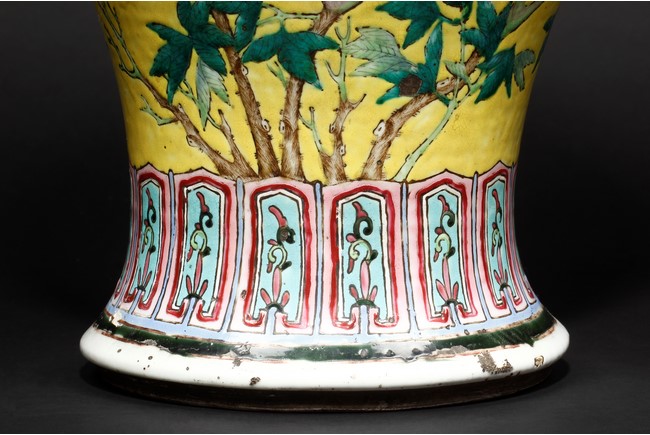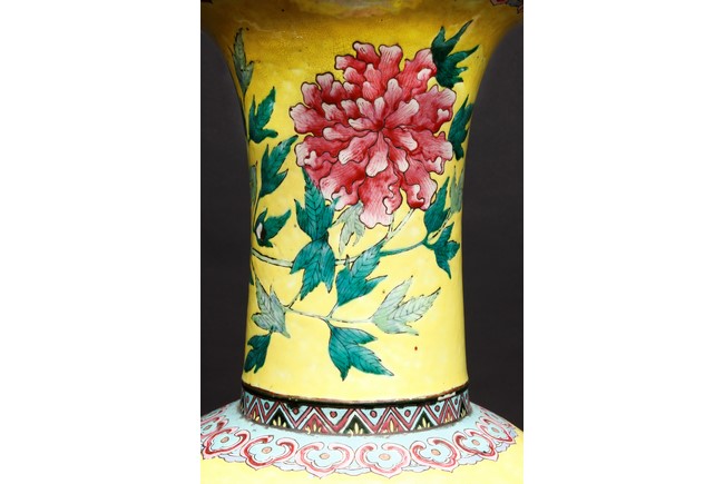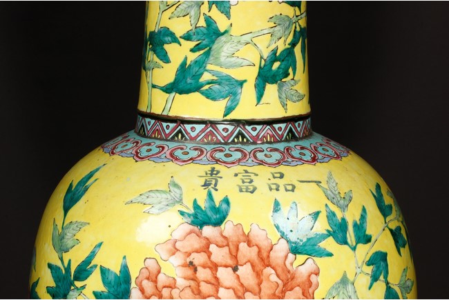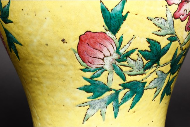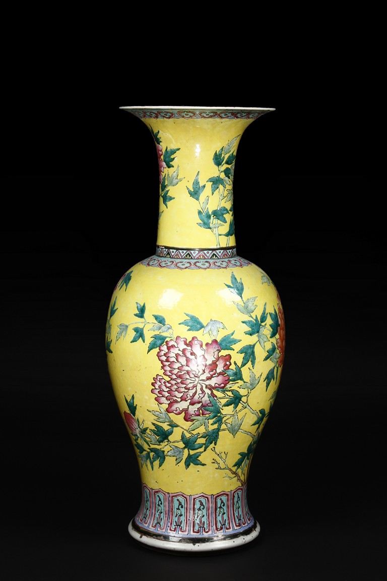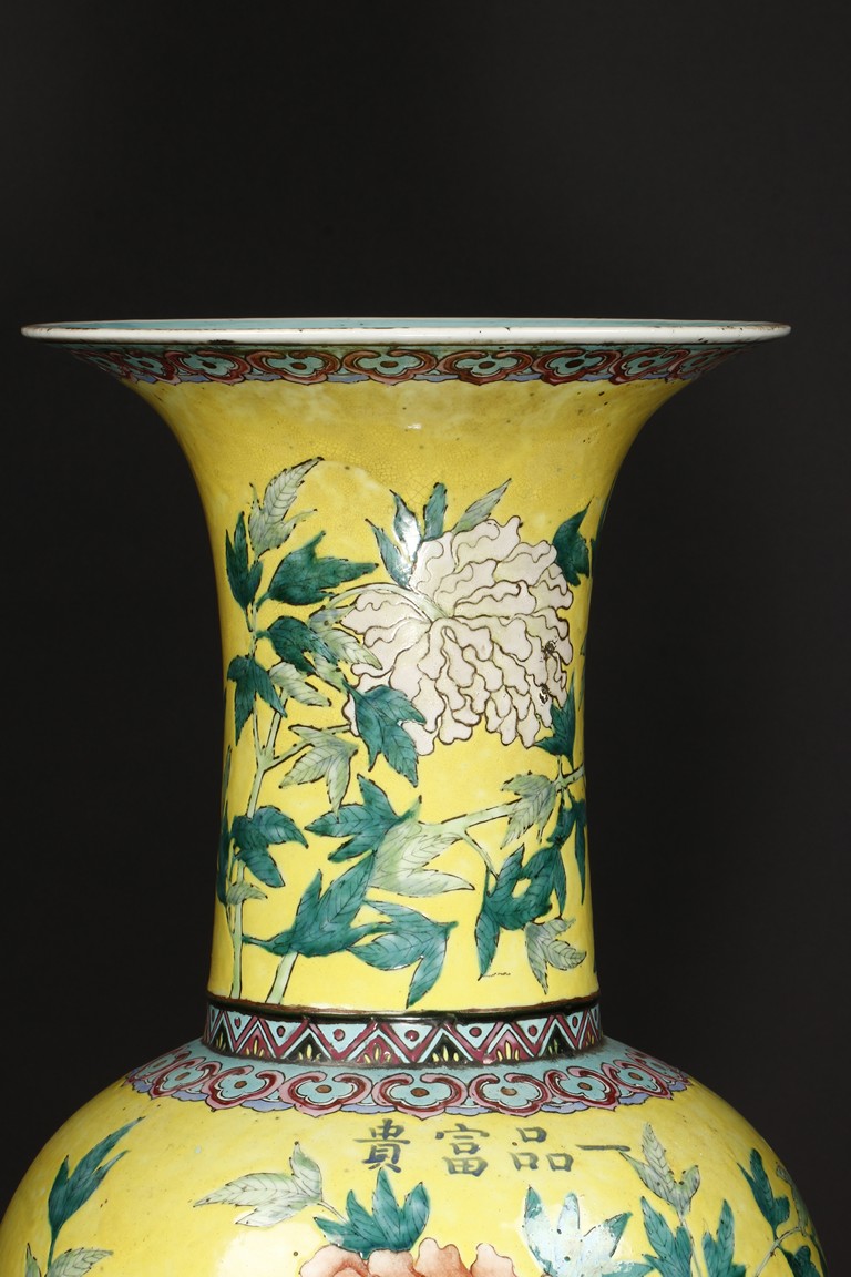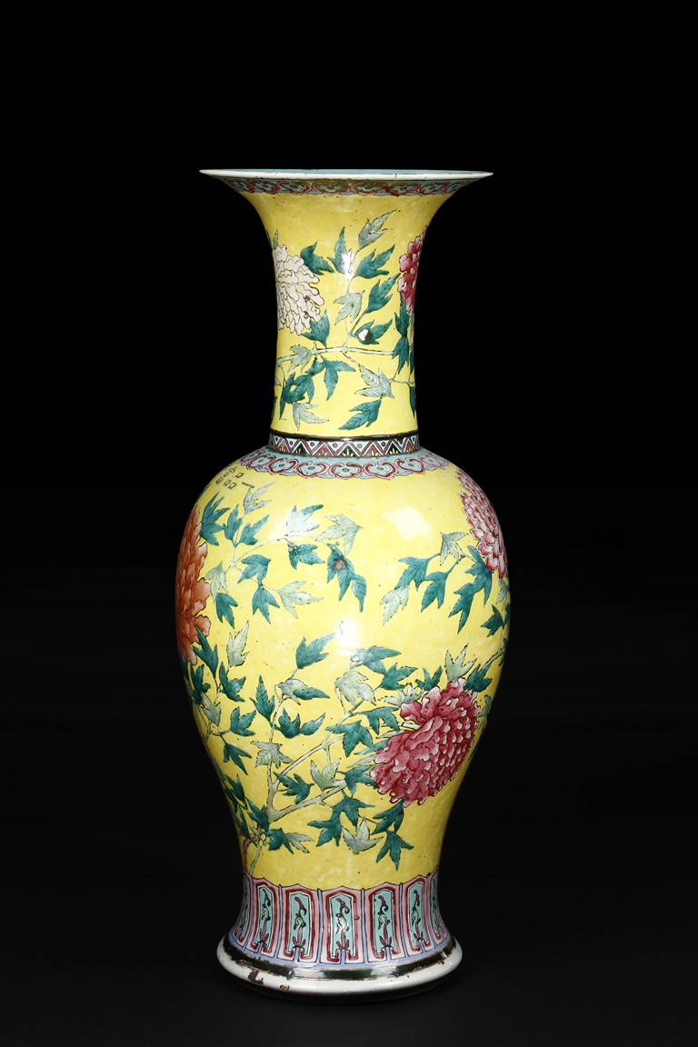Of baluster form, the vase is brightly painted around the body with red, orange-glazed chrysanthemum flowers amongst leafy branches and four characters 'Yi Pin Fu Gui' all against yellow-glazed background. The long flaring neck is decorated in similar manner with chrysanthemum design. The neck and body are bordered between a key-fret and a ruyi-motif band. Qing Dynasty Period.