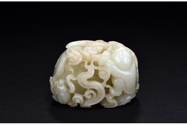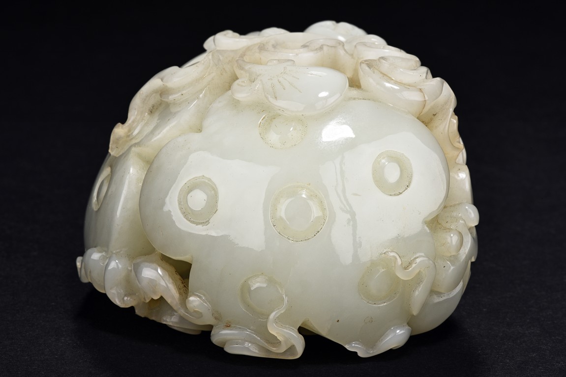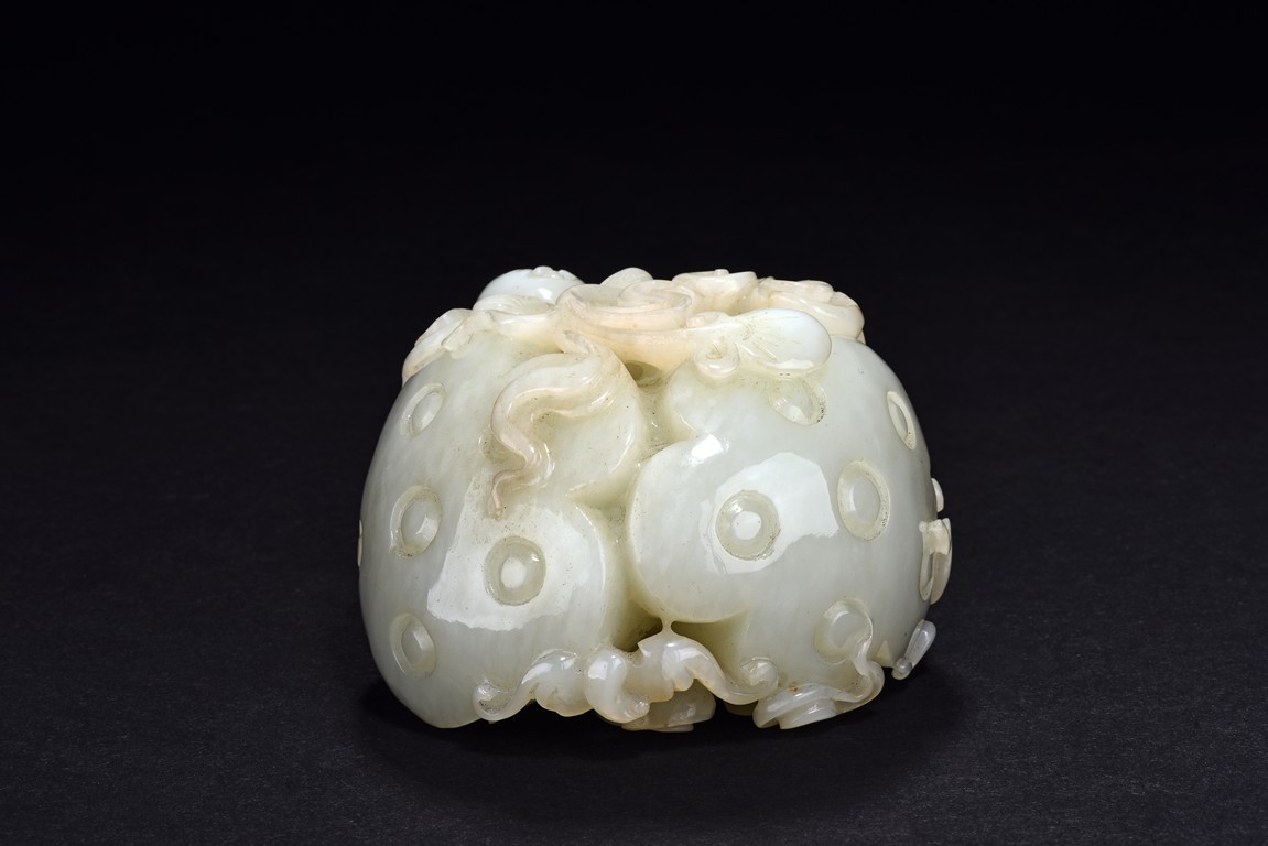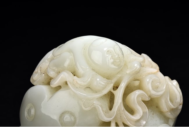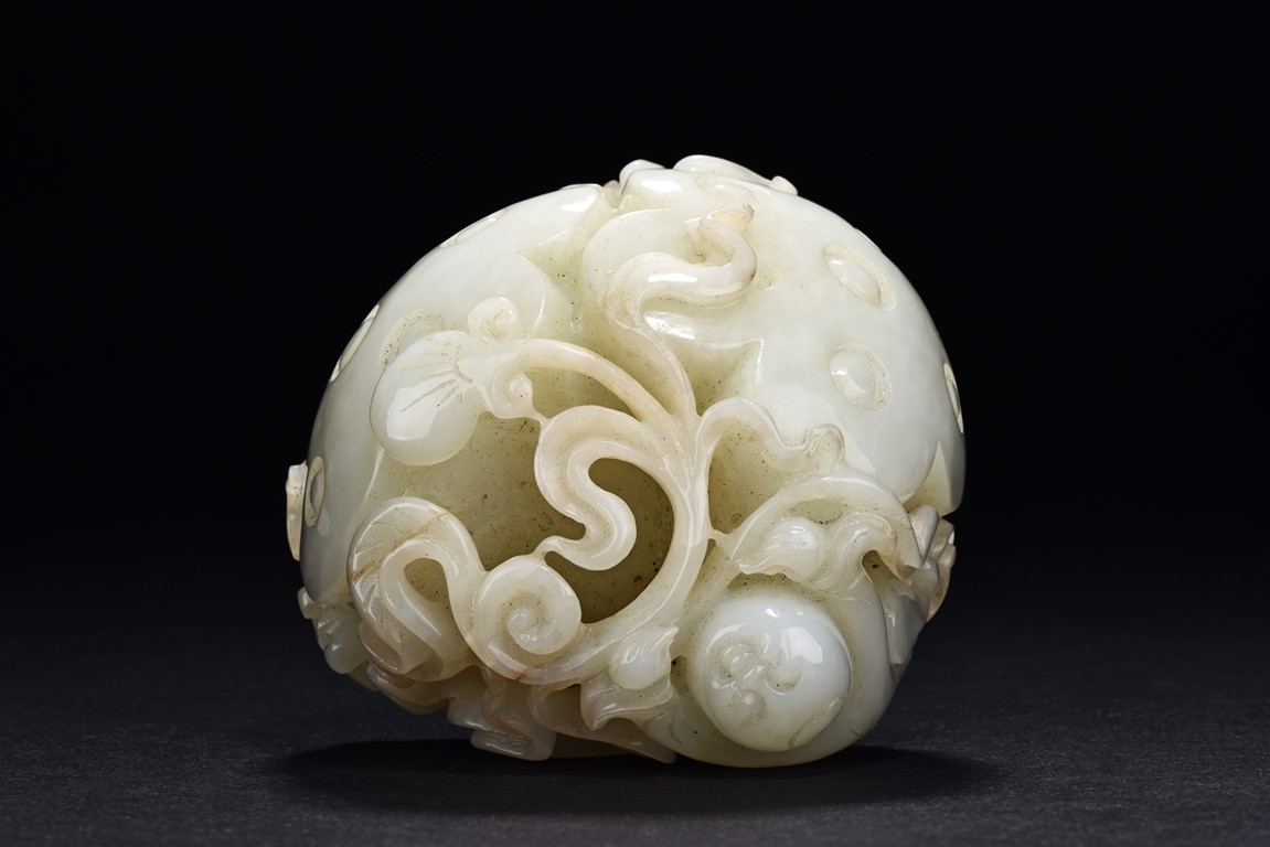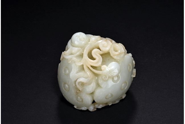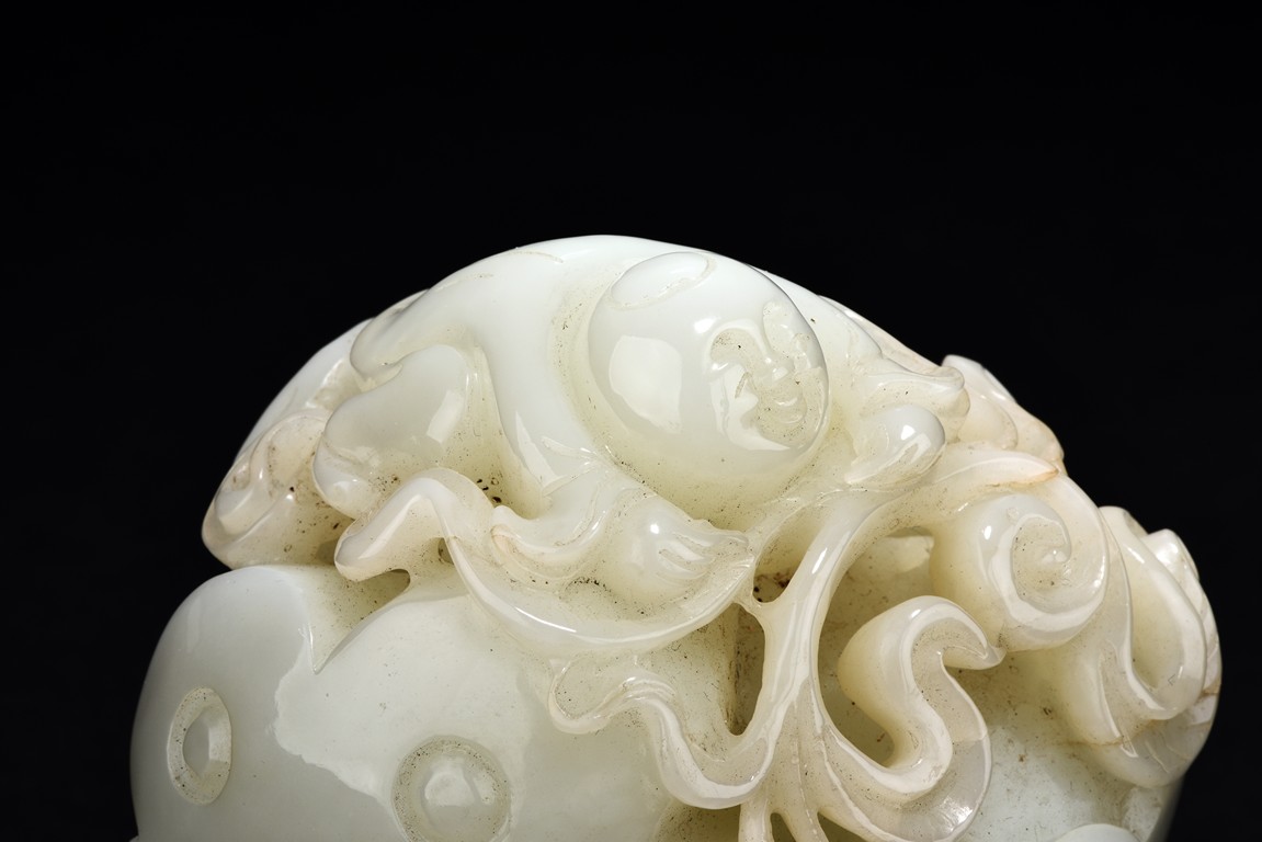 Of globular form, the jade is carved with a smilling boy lying upon two large lotus seedpods in openwork with scrolling leafy branches. Qing Dynasty period.