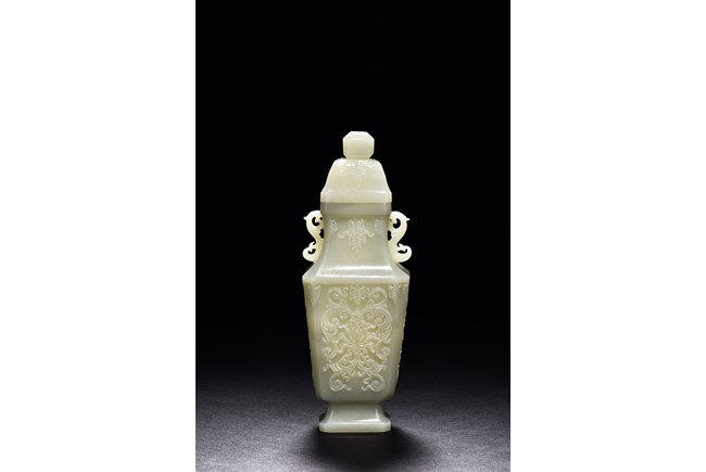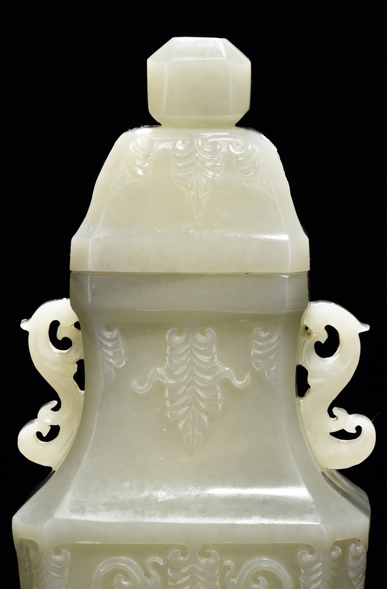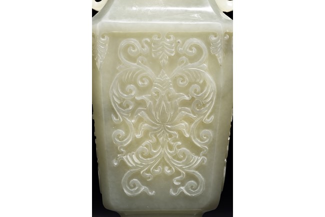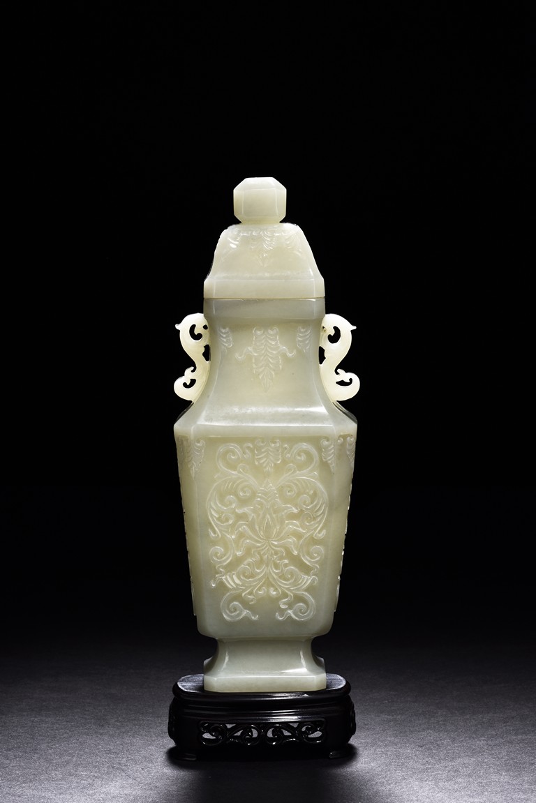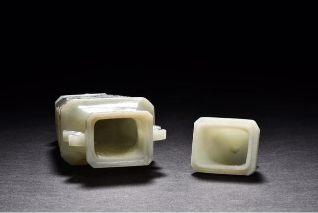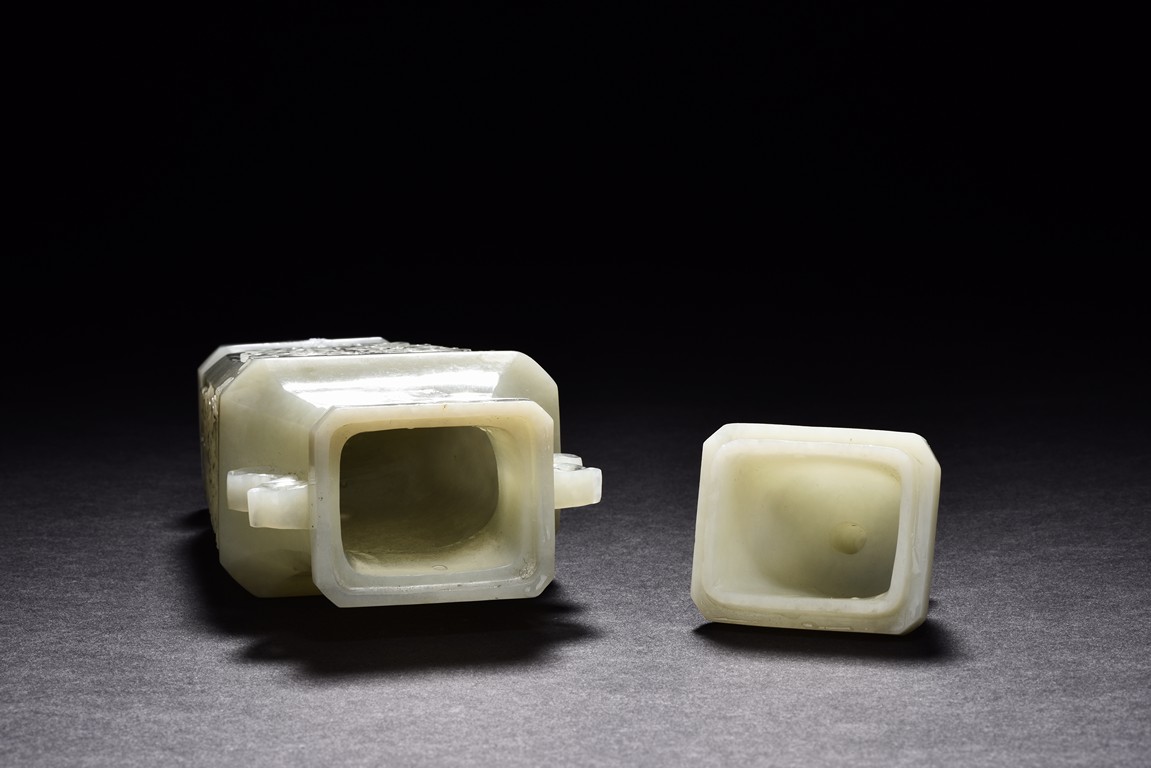 Of flattened baluster form and rectangular section, the body decorated with scrolling foliate motif in shallow relief, rising from a deeply recessed foot, the neck flanked by reticulated strap handles, topped by a knopped domical cover. Qing Dynasty period.