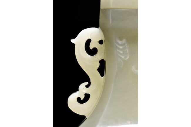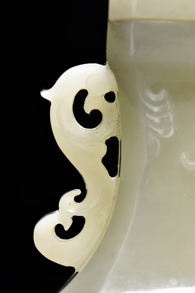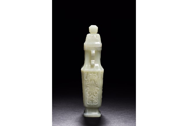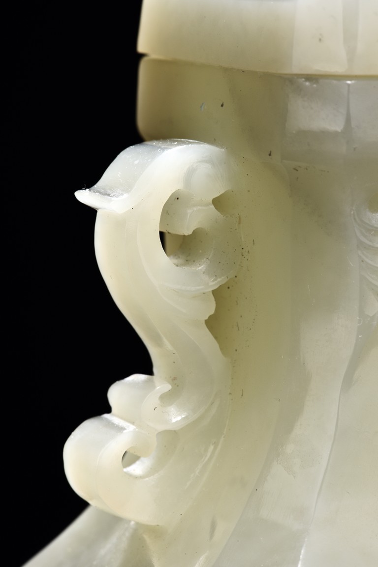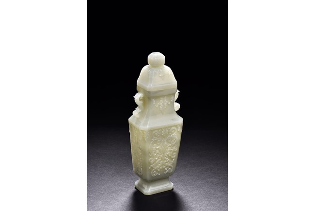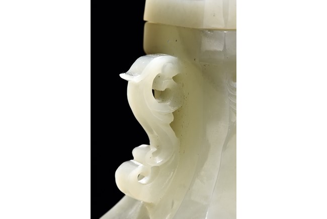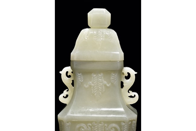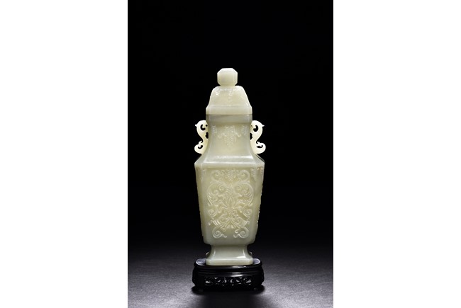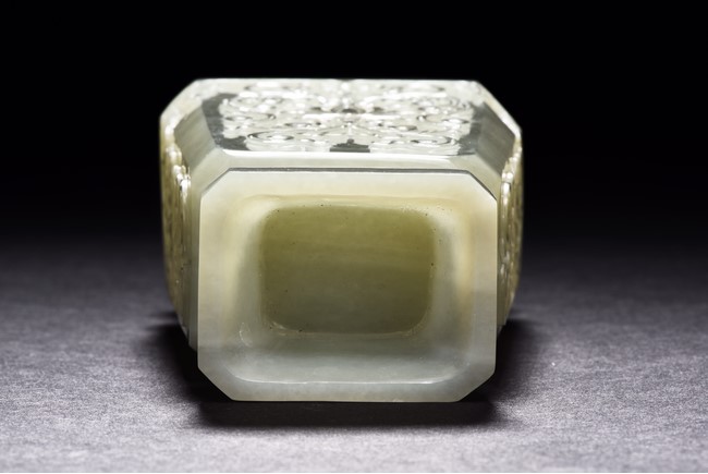 Of flattened baluster form and rectangular section, the body decorated with scrolling foliate motif in shallow relief, rising from a deeply recessed foot, the neck flanked by reticulated strap handles, topped by a knopped domical cover. Qing Dynasty period.