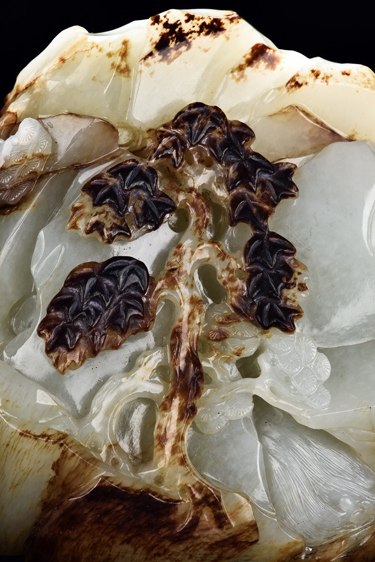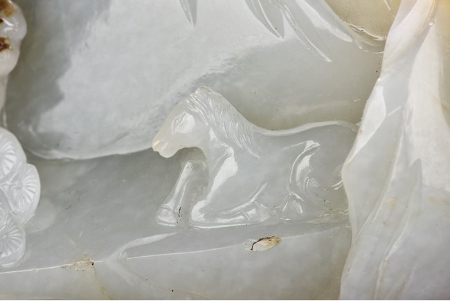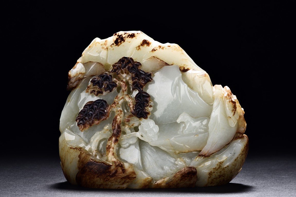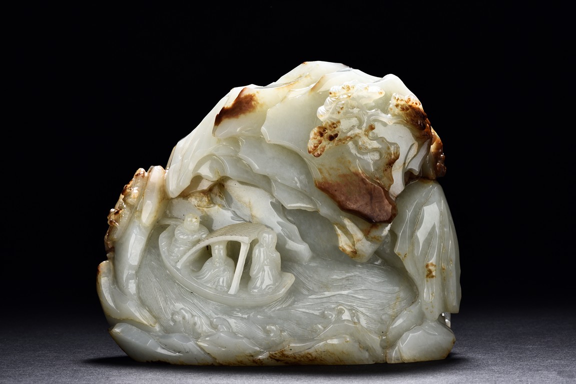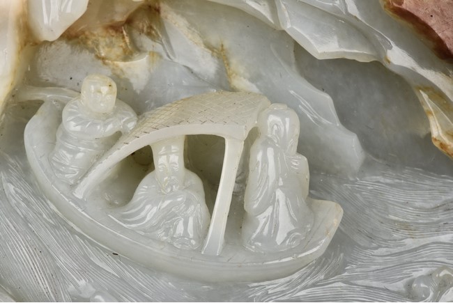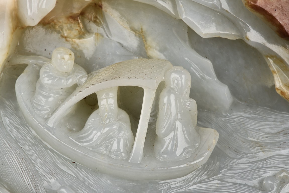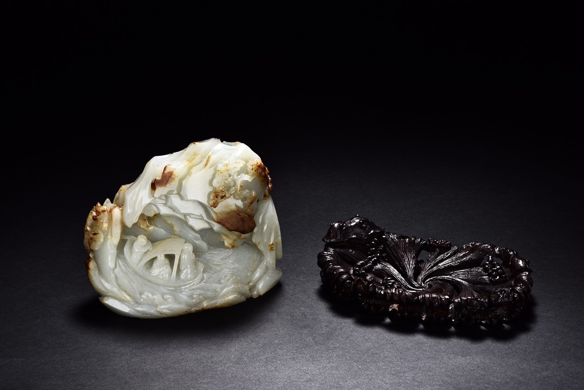 The boulder exquisitely carved to one side with three figures in a boat going through turbulent waves, with overhanging rocky outcrops behind, the pines issuing from the surface, the reverse carved with a scene of a recumbent horse within a mountainous landscape with gnarled trees and river stream. The wooden stand is modelled in the form of dense waves spiralling from center detailed with incised lines. The stone is of white tone with russet skin and inclusion. Qing Dynasty period.