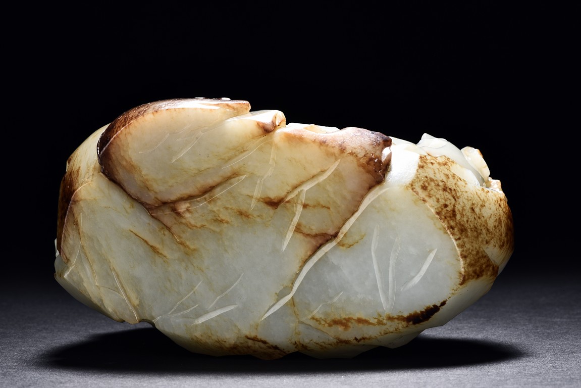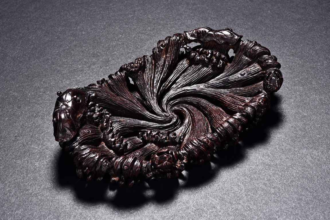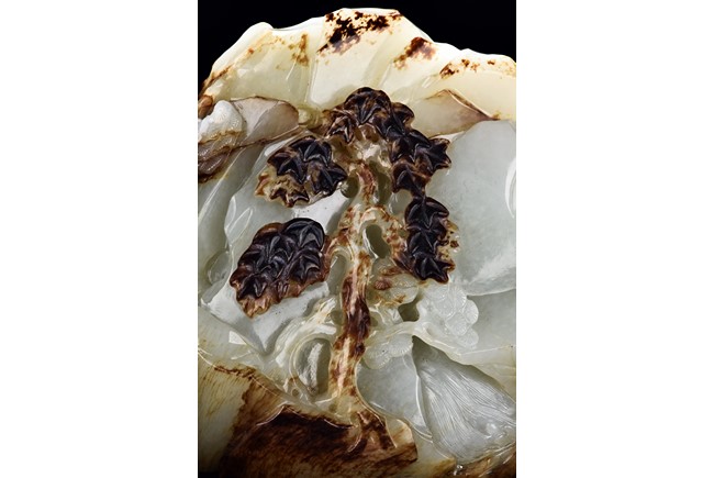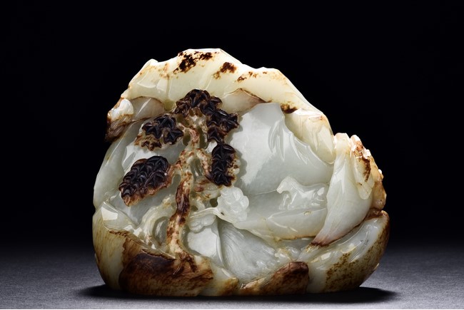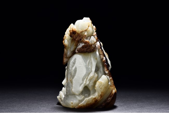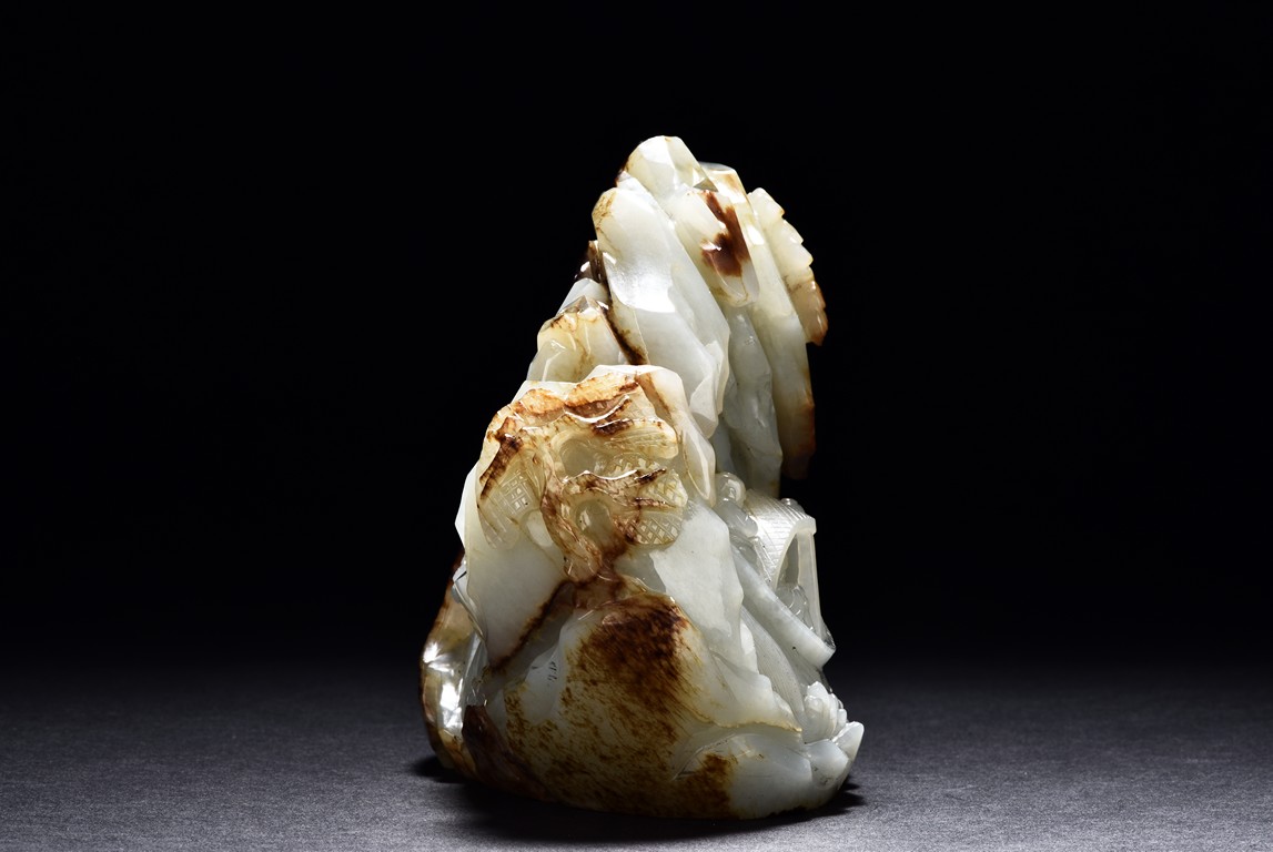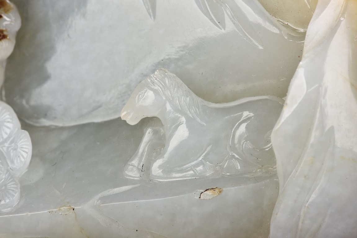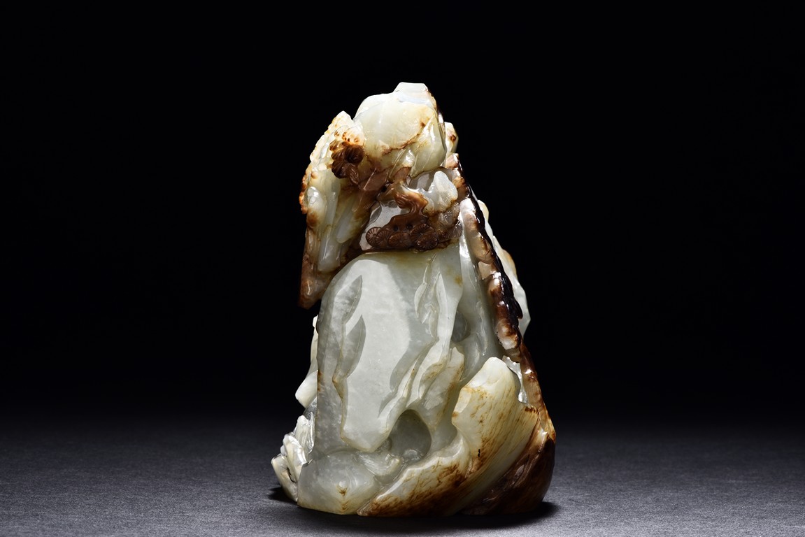 The boulder exquisitely carved to one side with three figures in a boat going through turbulent waves, with overhanging rocky outcrops behind, the pines issuing from the surface, the reverse carved with a scene of a recumbent horse within a mountainous landscape with gnarled trees and river stream. The wooden stand is modelled in the form of dense waves spiralling from center detailed with incised lines. The stone is of white tone with russet skin and inclusion. Qing Dynasty period.