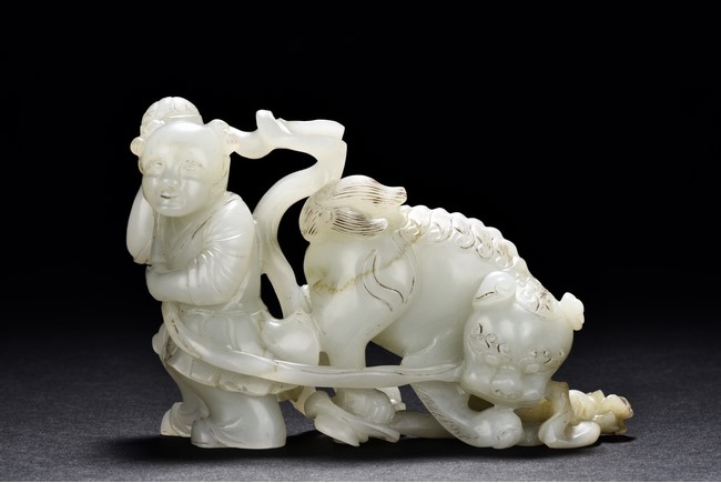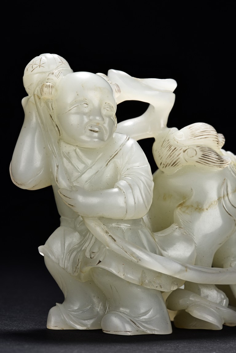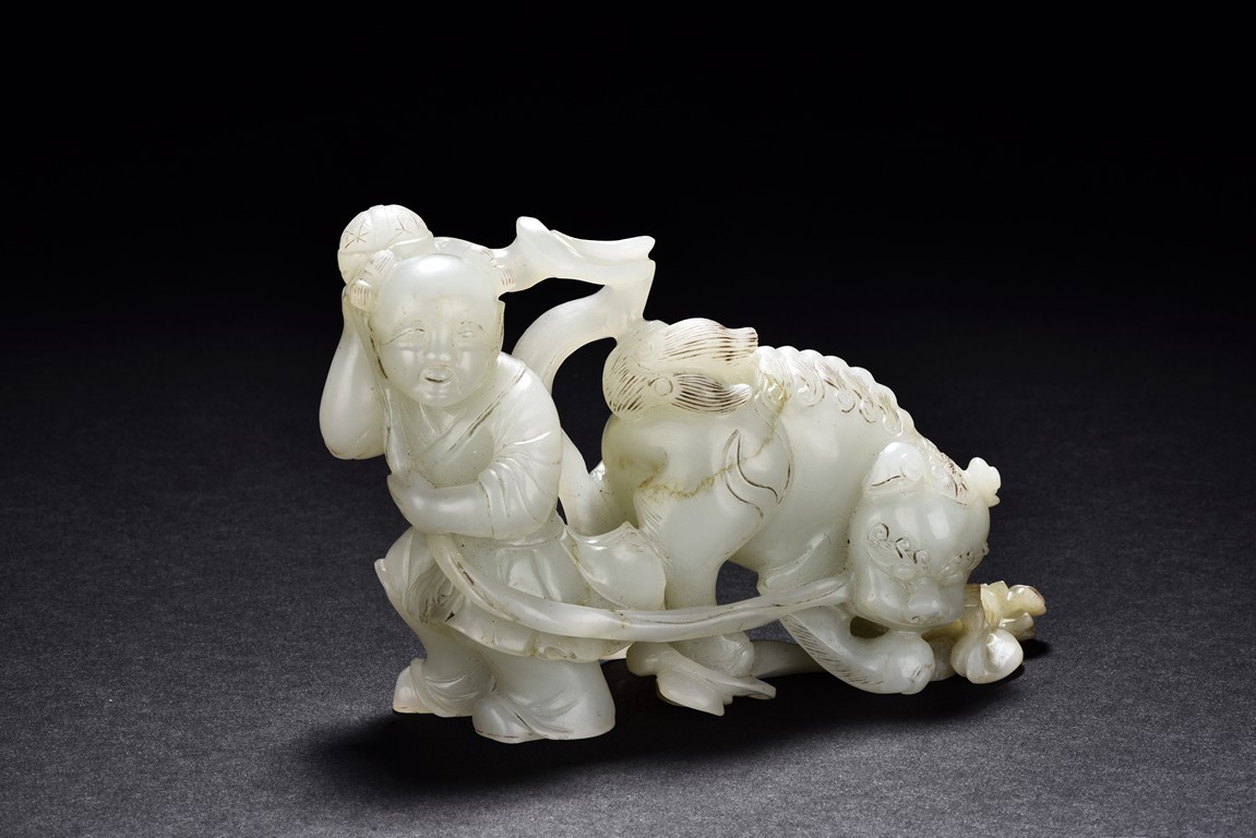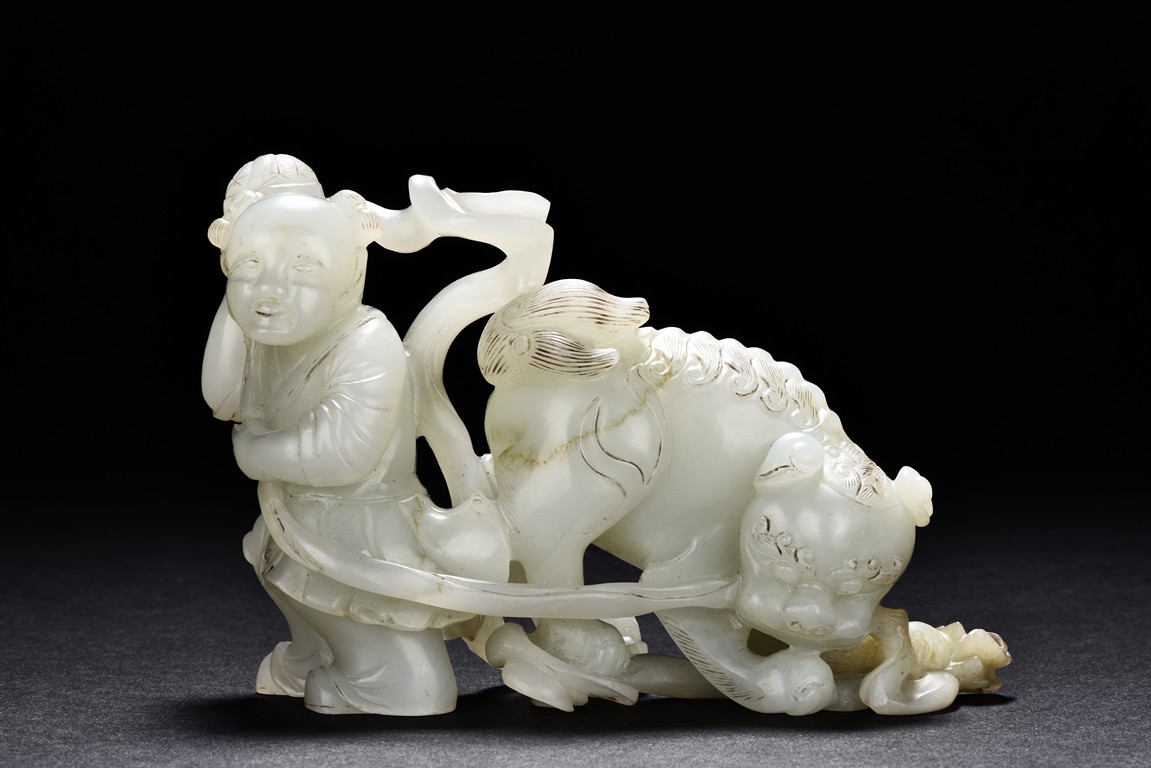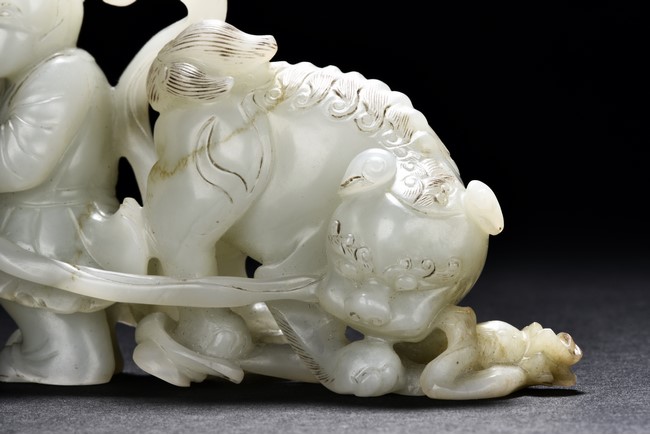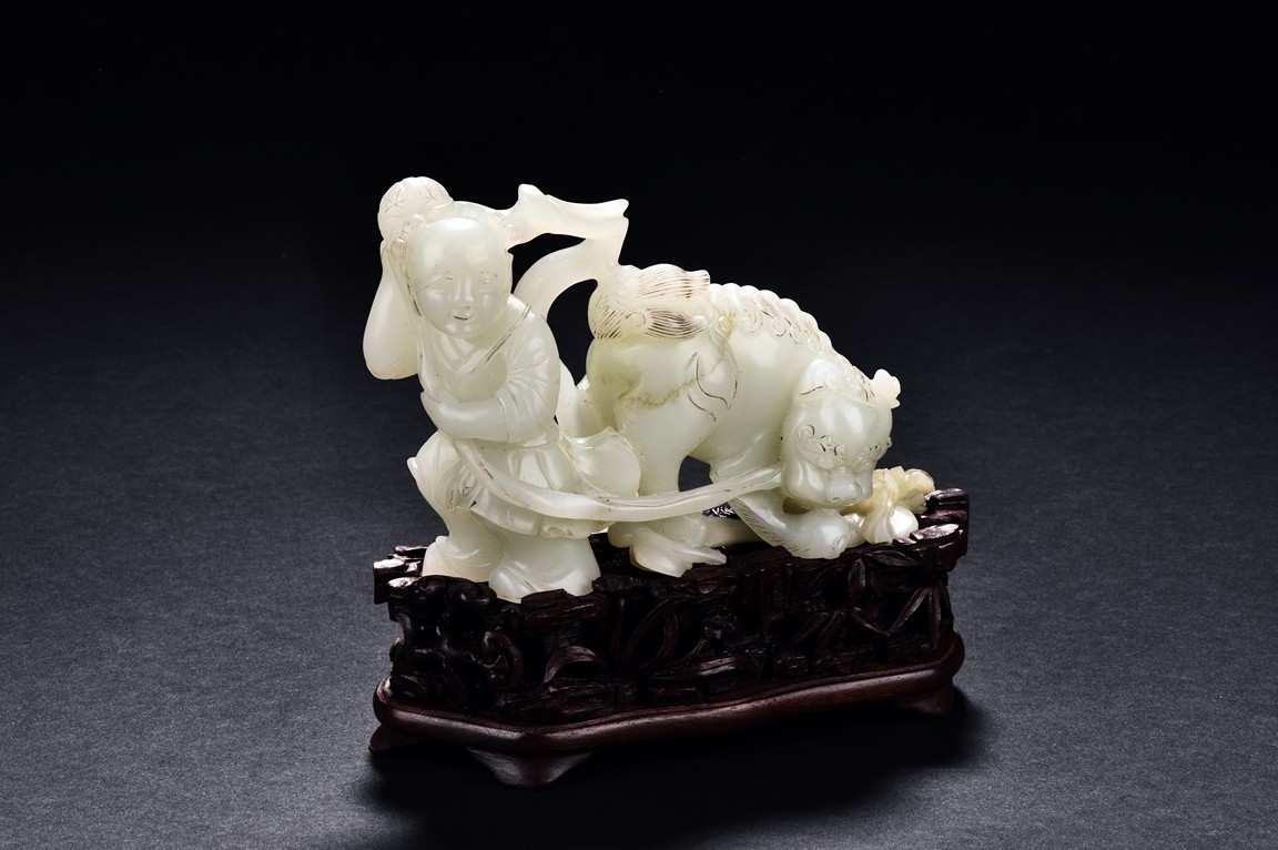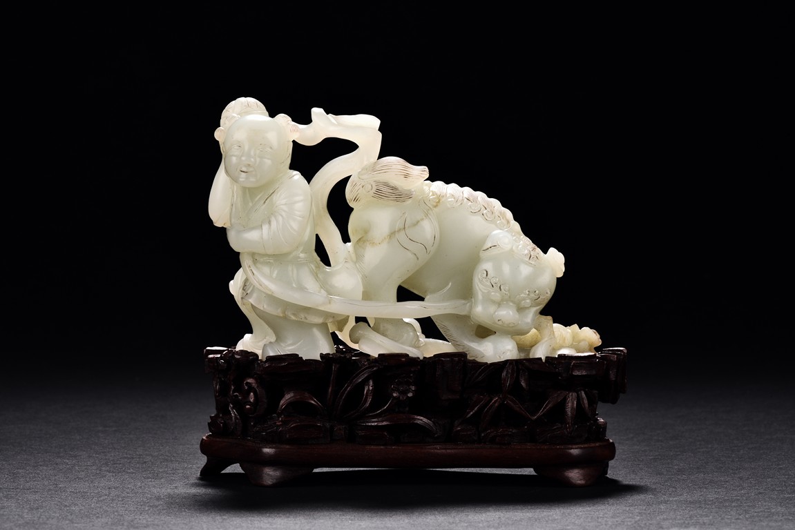 Exquisitely carved in the form of a boy, the face with joyful expression, holding a long ribbon tied to a brocade ball grasped by a buddhist lion in the rear, the lion finely detailed with incised mane and tail, the face with bulging eyeball. The stone is of translucent white tone. The wooden stand is finely pierced and carved with openwork rocky outcrop and leafy flowers. Qing Dynasty period.