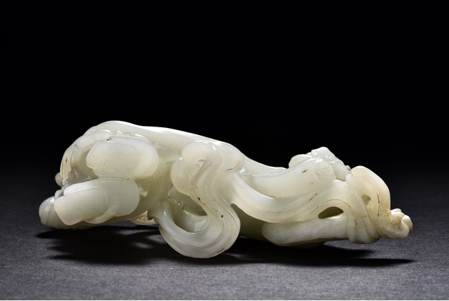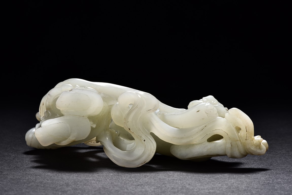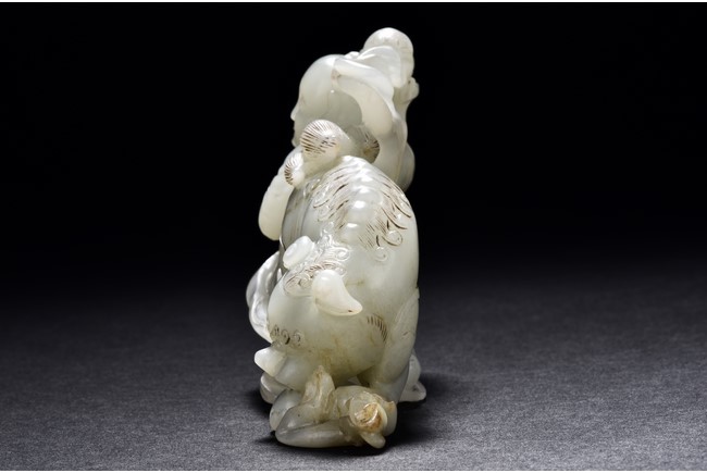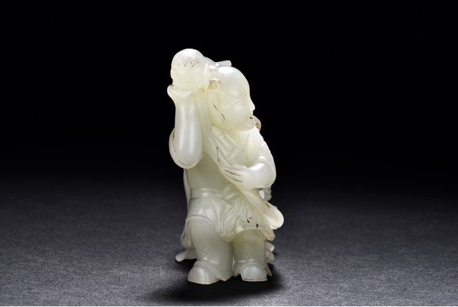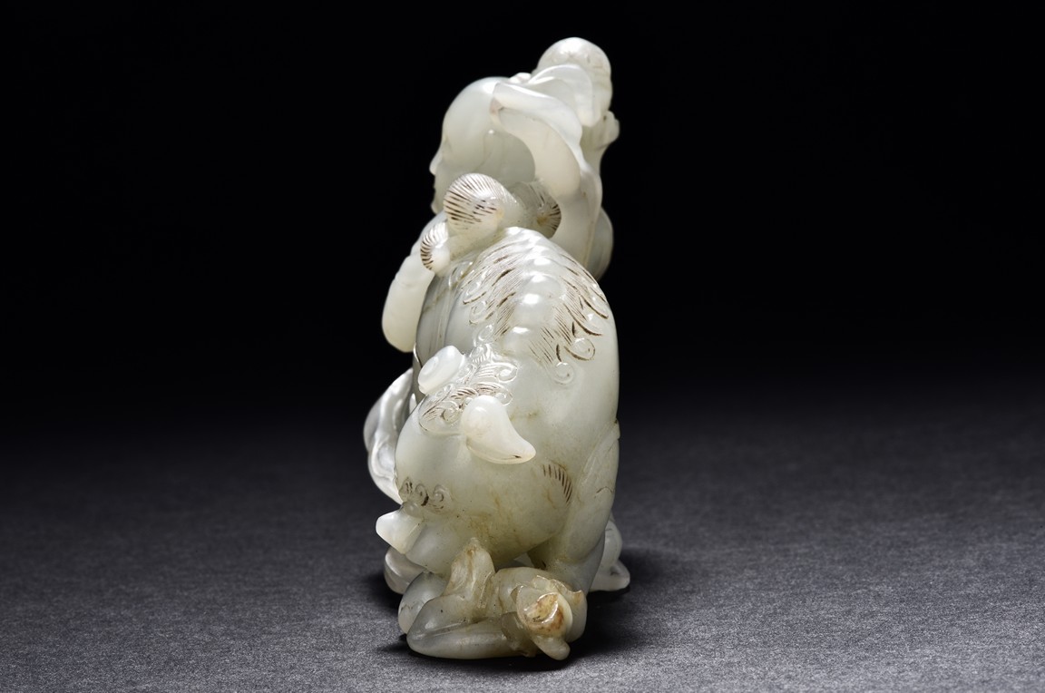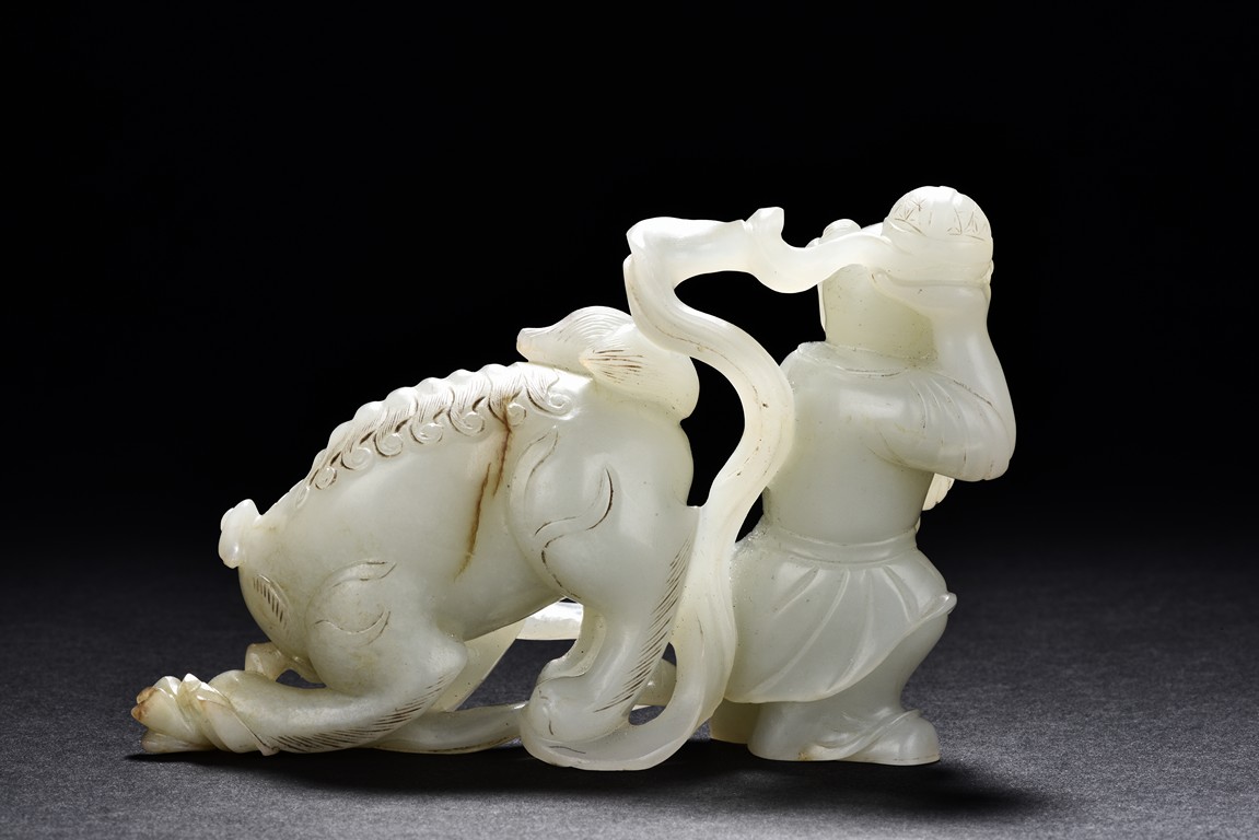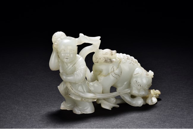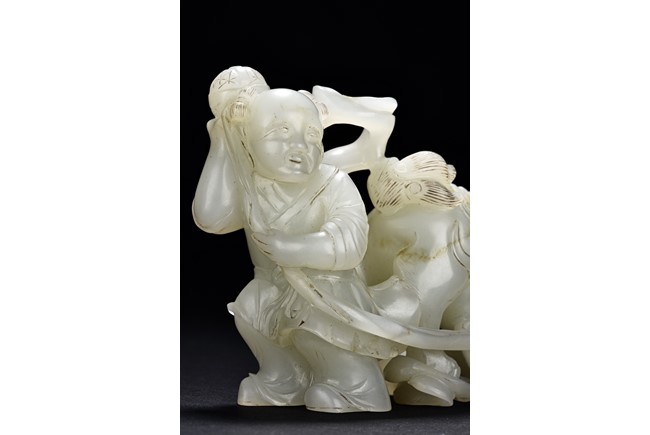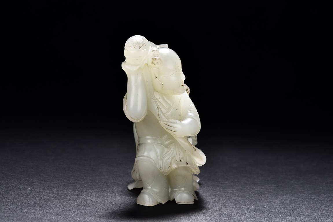 Exquisitely carved in the form of a boy, the face with joyful expression, holding a long ribbon tied to a brocade ball grasped by a buddhist lion in the rear, the lion finely detailed with incised mane and tail, the face with bulging eyeball. The stone is of translucent white tone. The wooden stand is finely pierced and carved with openwork rocky outcrop and leafy flowers. Qing Dynasty period.