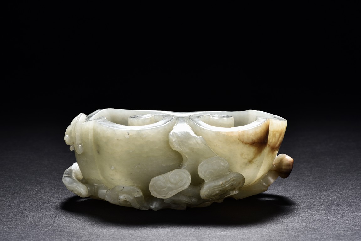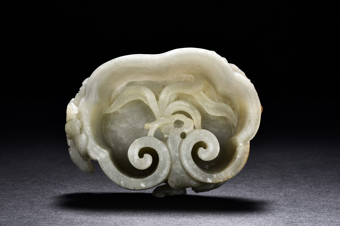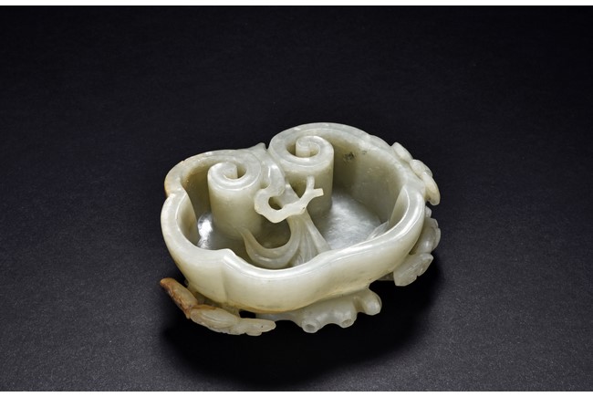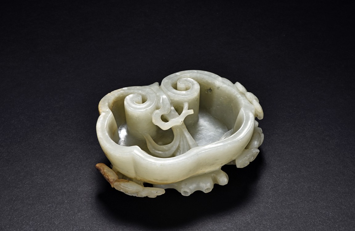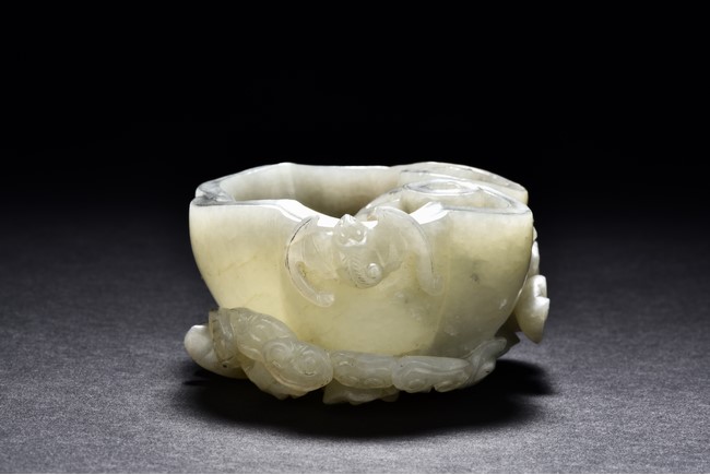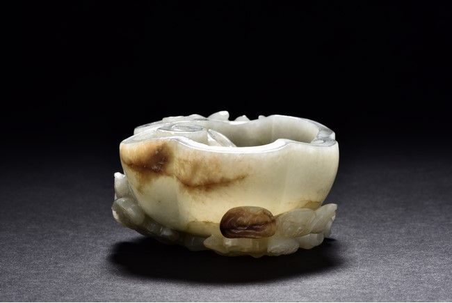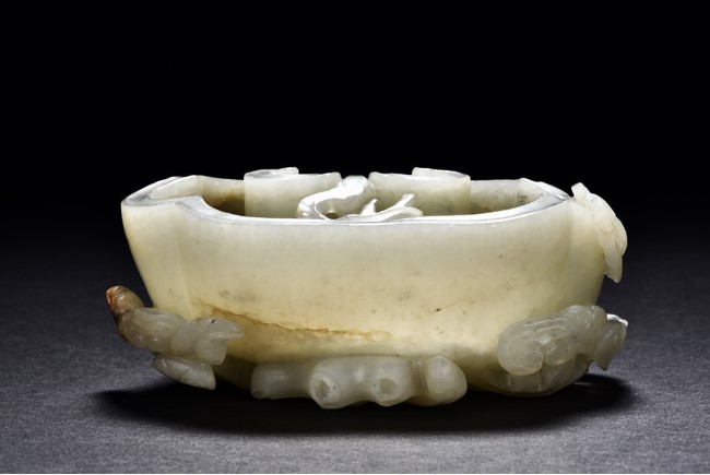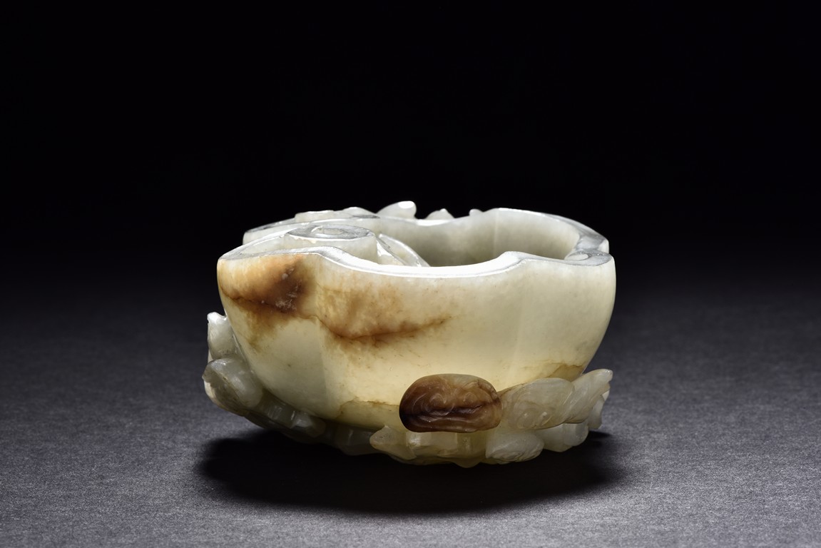Modelled in the form of lingzhi head, the waterpot well-hollowed and the interior finely carved with leaves, the exterior with smaller lingzhi fungus and intertwined leafy branches in relief; The side finely carved with an auspicious bat. Qing Dynasty period.