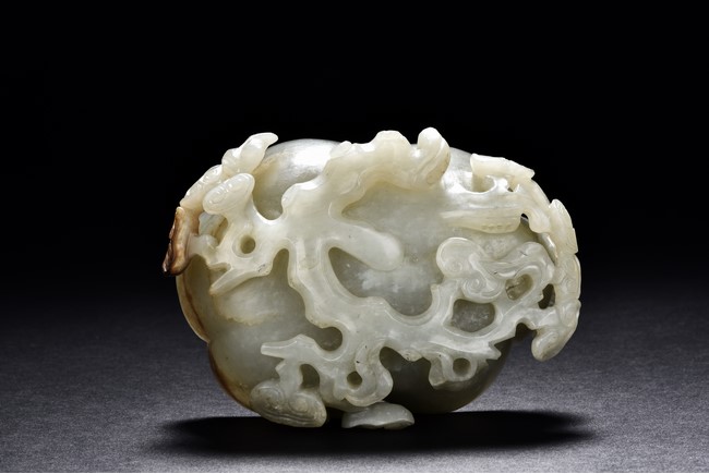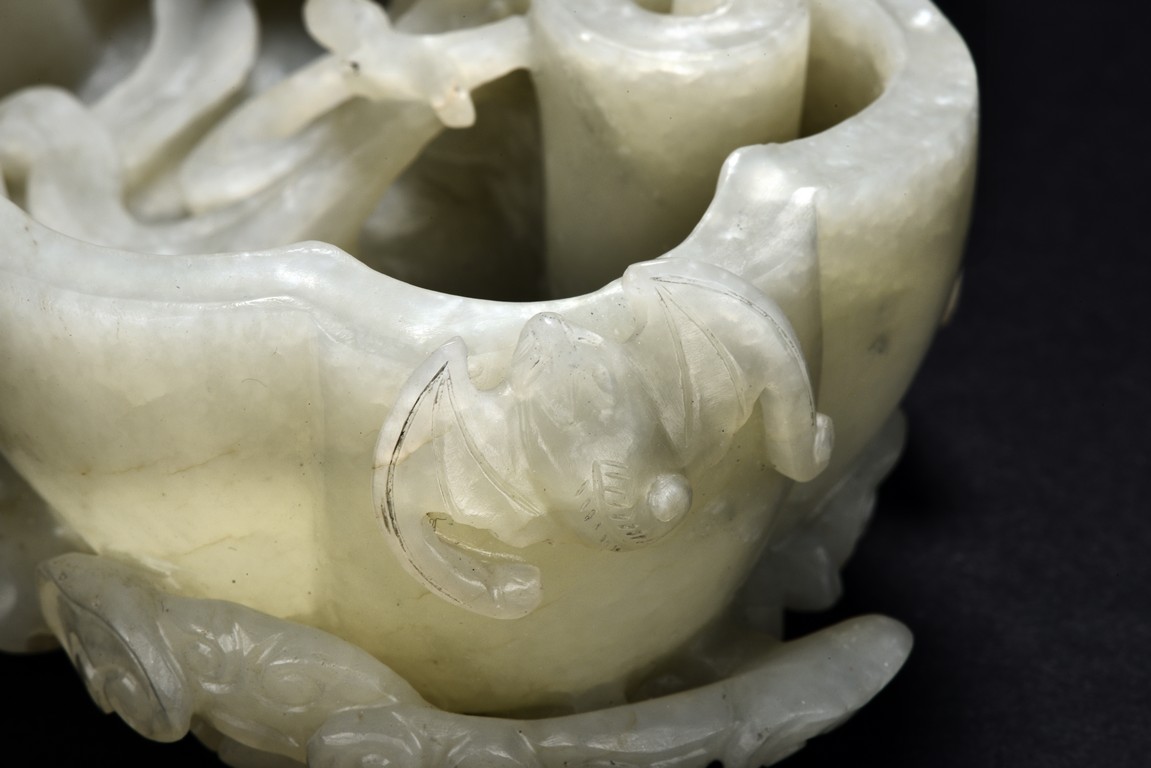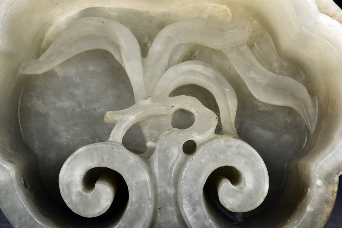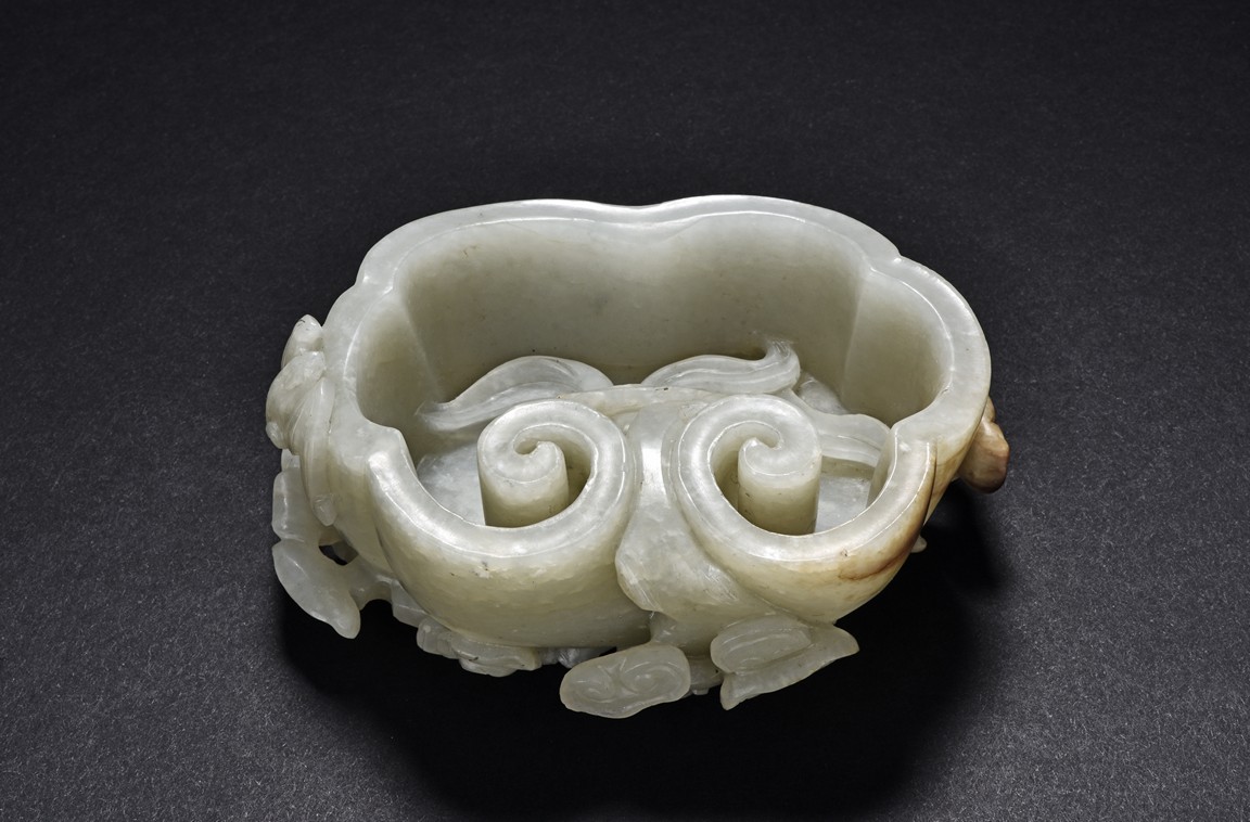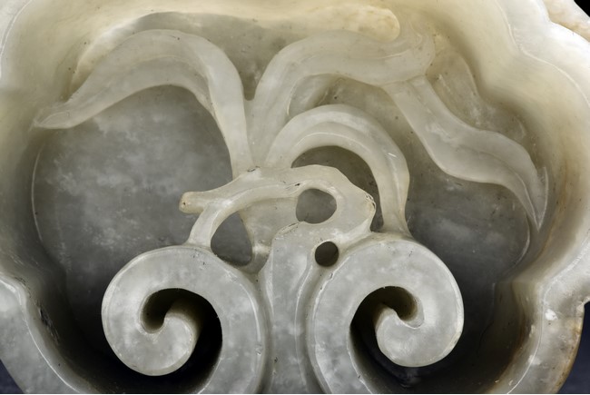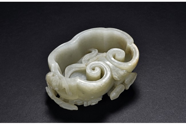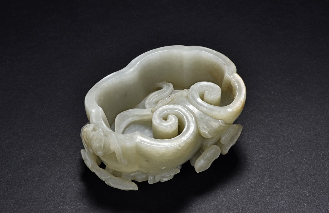 Modelled in the form of lingzhi head, the waterpot well-hollowed and the interior finely carved with leaves, the exterior with smaller lingzhi fungus and intertwined leafy branches in relief; The side finely carved with an auspicious bat. Qing Dynasty period.