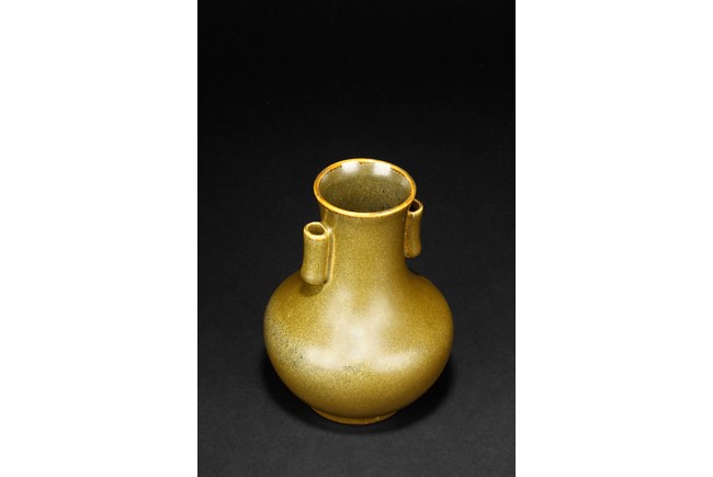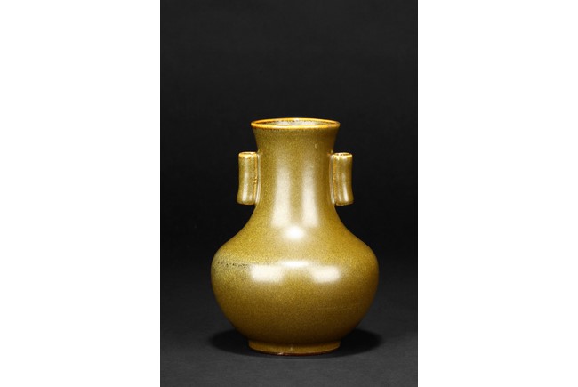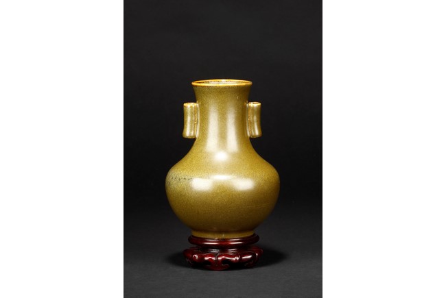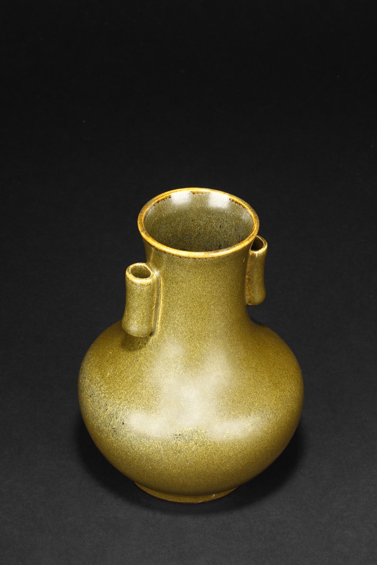 Of hu form, the vase is well potted with a compressed globular body, rising to a broad cylindrical neck, flanked by a pair of cylindrical lug handles. It is overall covered with in attractive opaque tea-dust green tone. The base bears a four character 'Daoguang' mark. Qing Dynasty period.