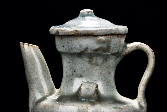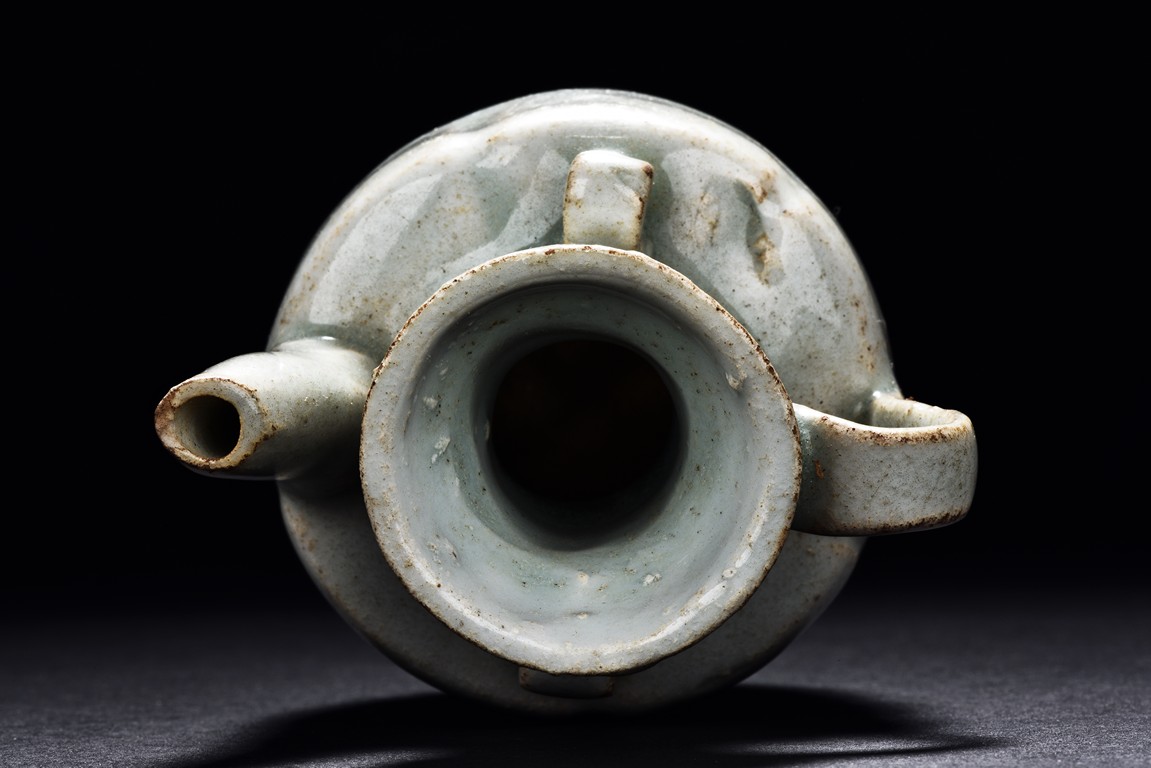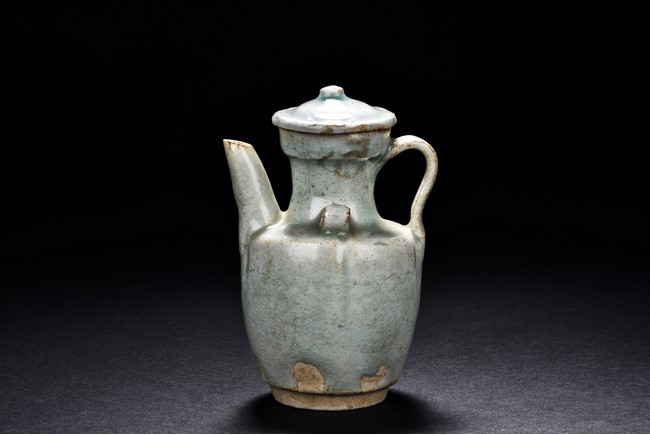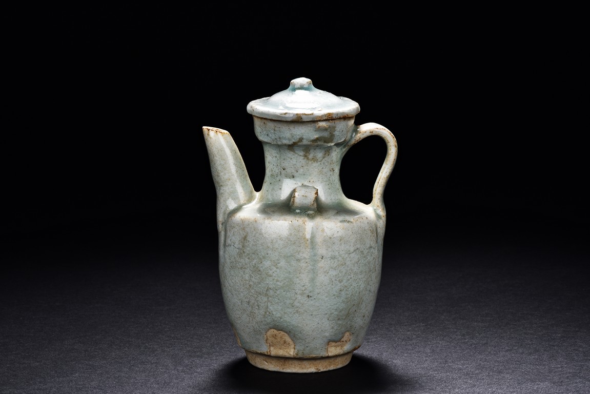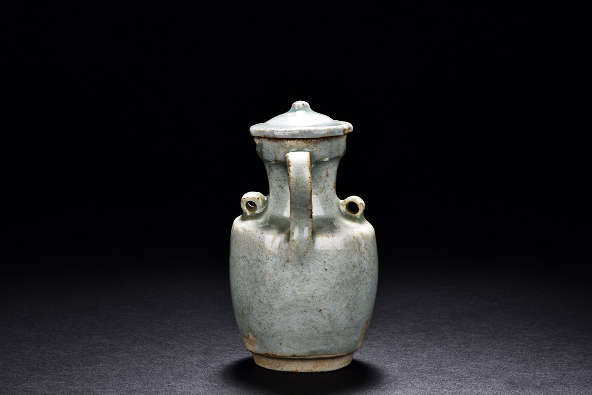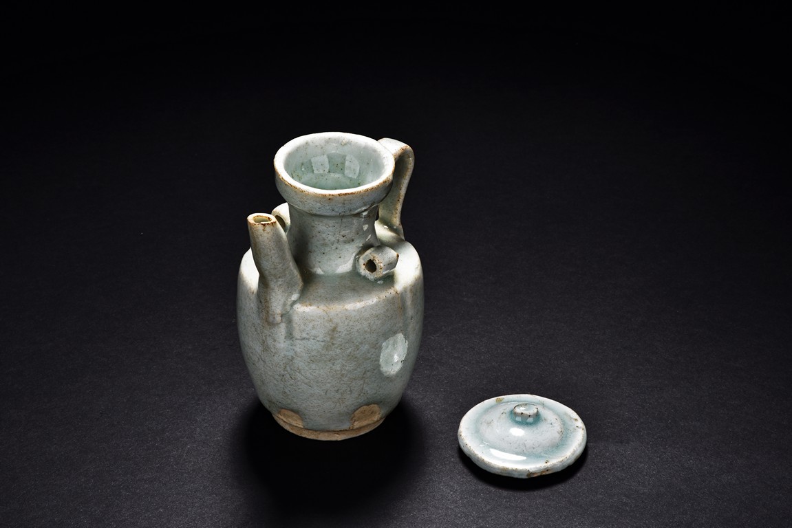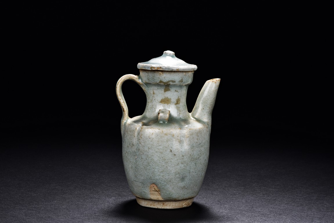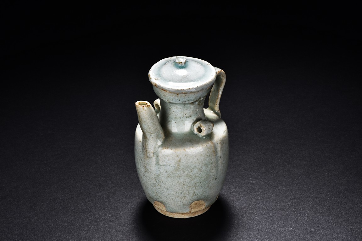 Of conical spout and grooved strap handle, the exterior covered in bluish celadon glaze, the cover of dome shape surmounted with a finial. Song Dynasty period.