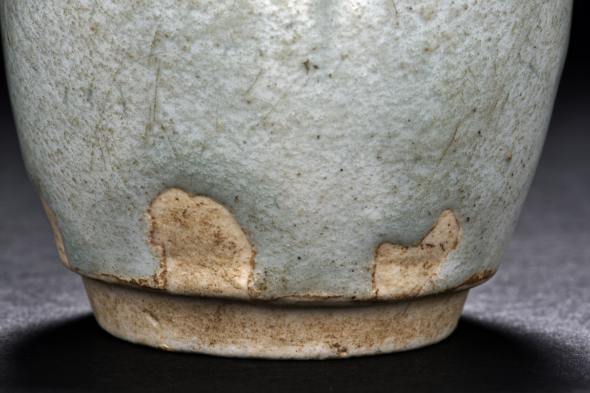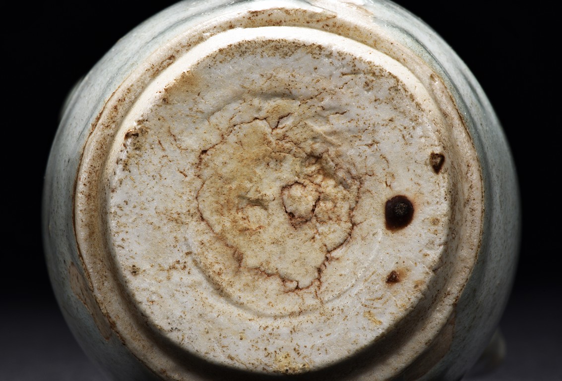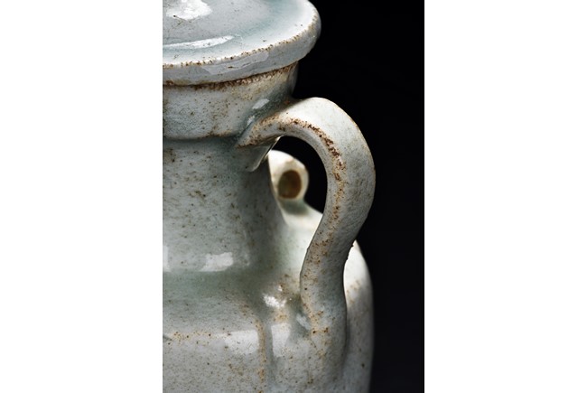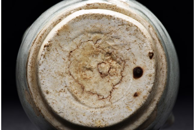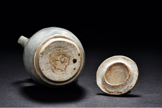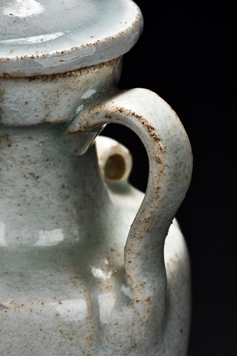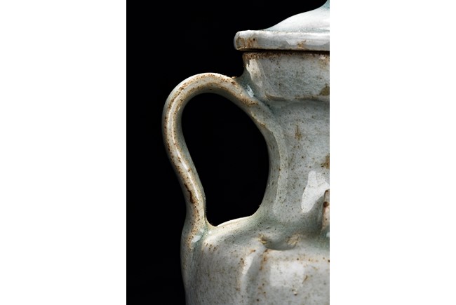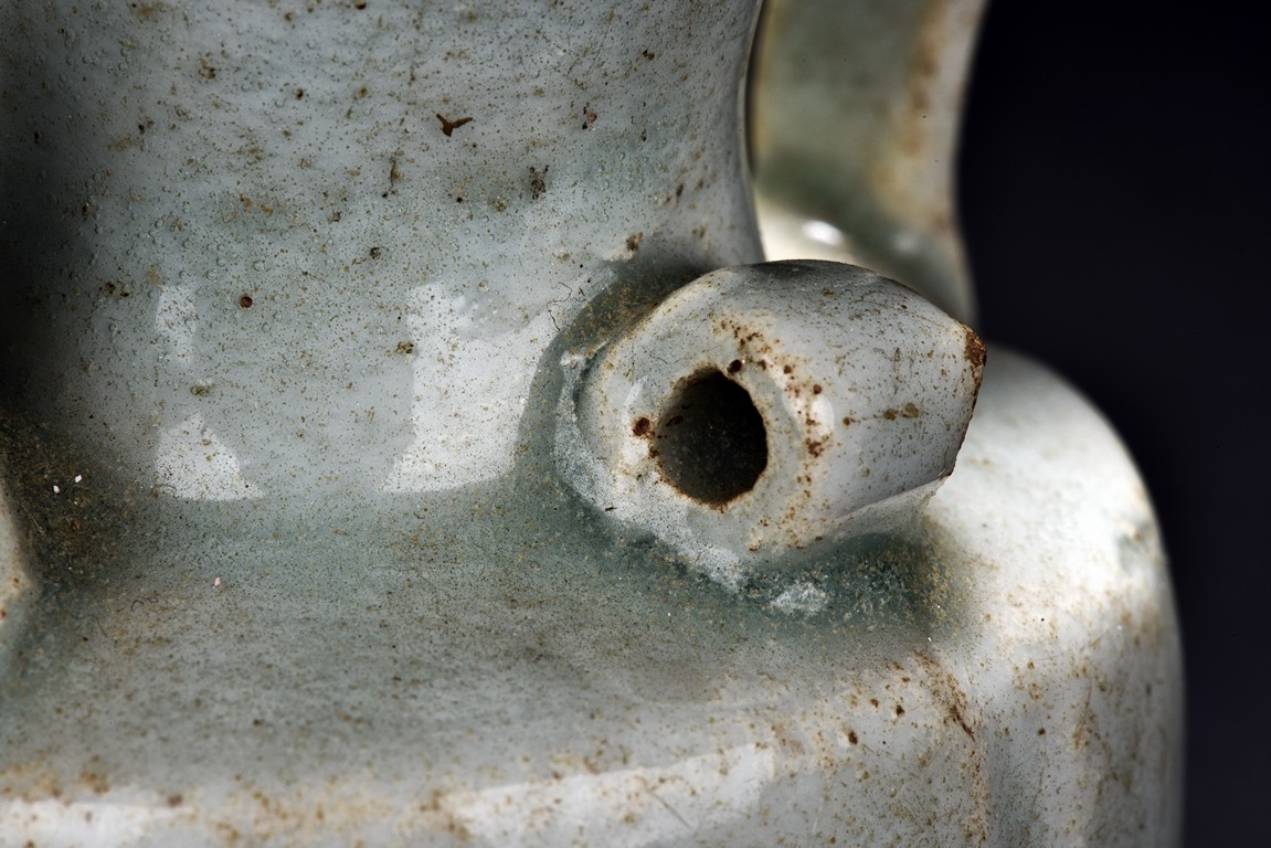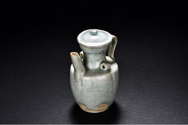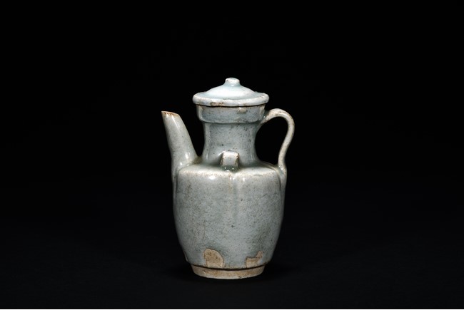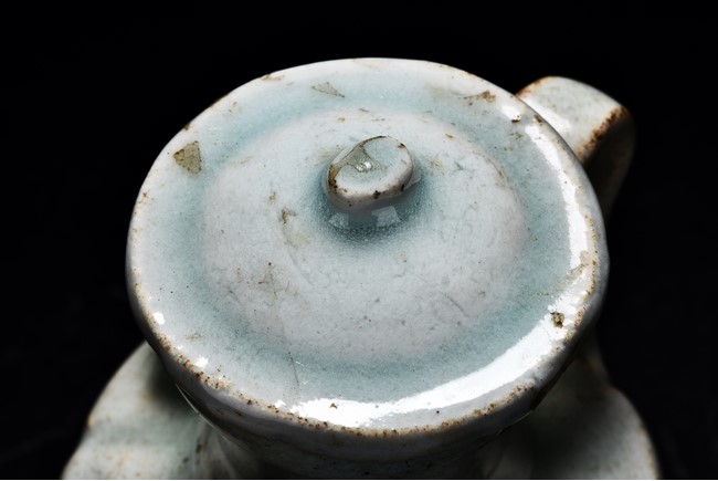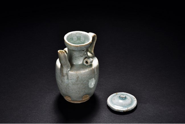 Of conical spout and grooved strap handle, the exterior covered in bluish celadon glaze, the cover of dome shape surmounted with a finial. Song Dynasty period.