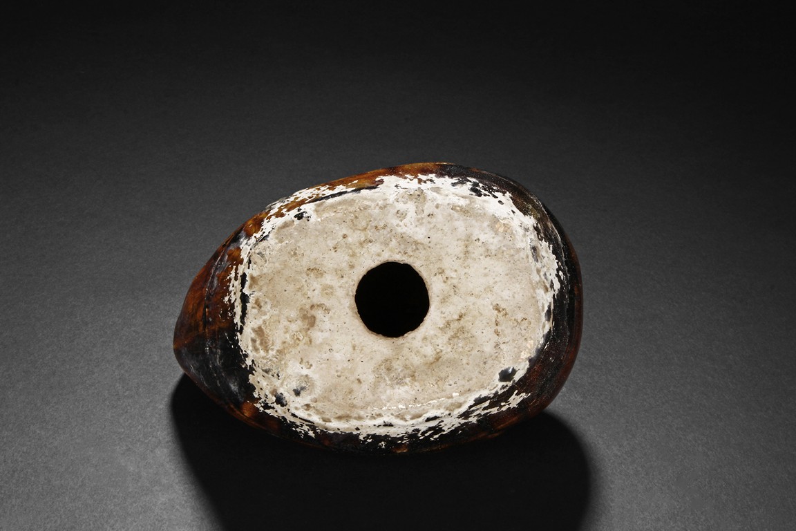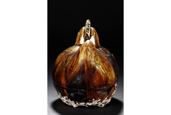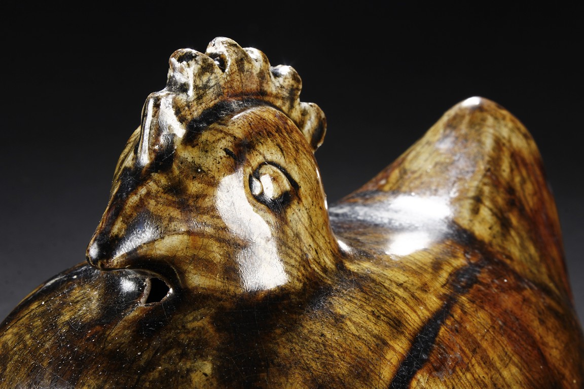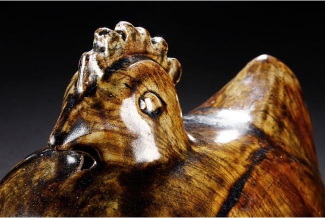 The figure depicts a chicken laying on the ground with its underside, wings by the side, and tail raised, glazed in brown and black color, and unglazed on the bottom with a hole. Song Dynasty period.
