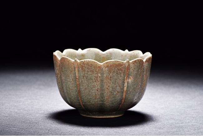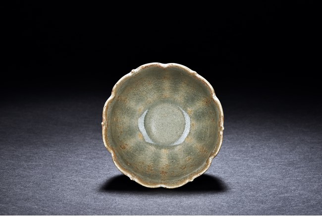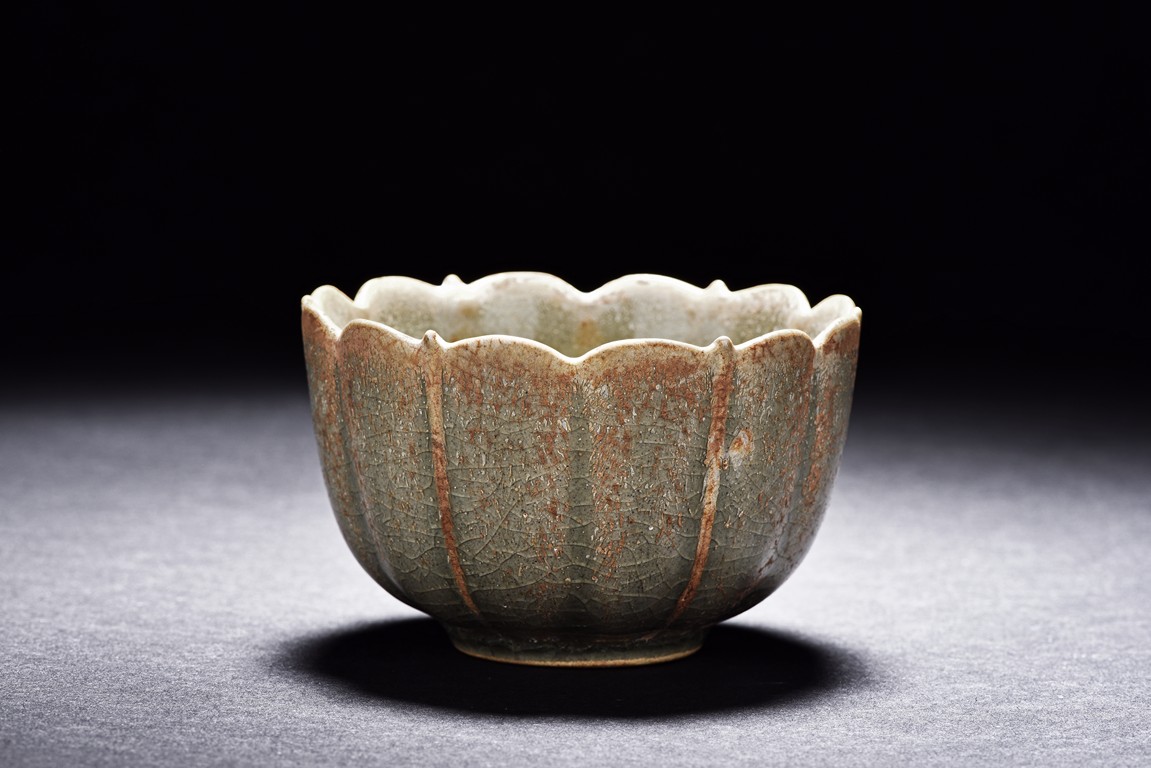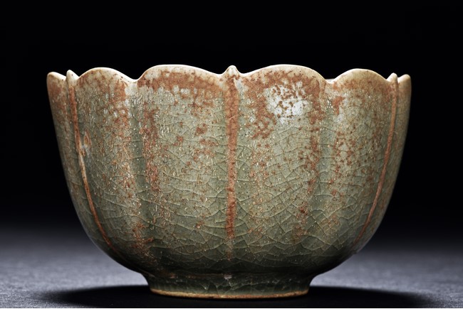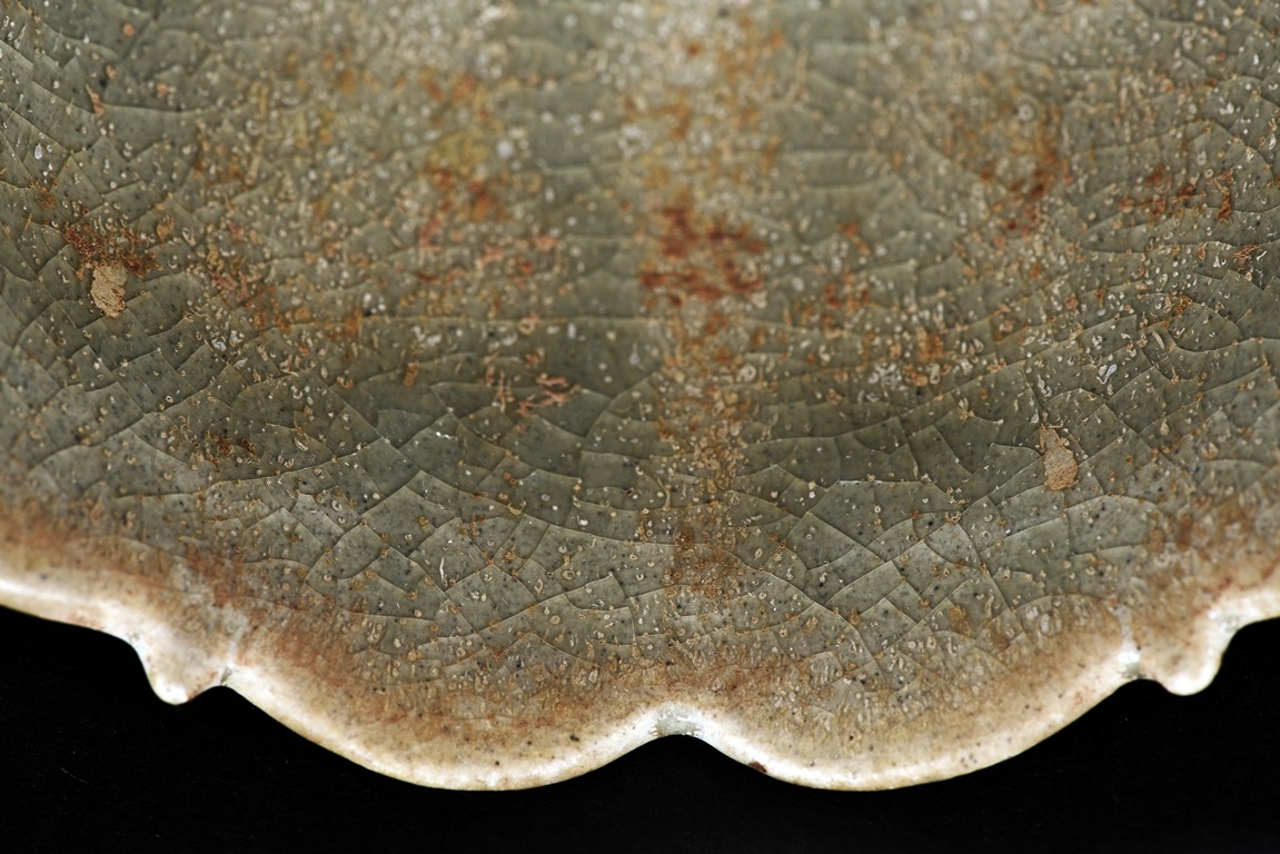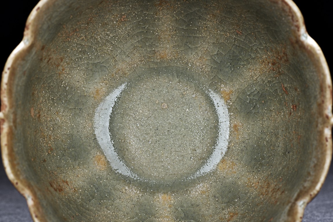 The bowl is of lotus shape of twelve lobes. The sides rise gently to the rims. It is overall covered in blue tone with fine crackling.