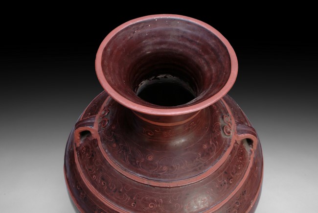 This jar features wide opening, short neck, and ovoid shaped body; two small handles on the side; circular rings on the body and neck. It is engraved with wave patterns. Han Dynasty period.