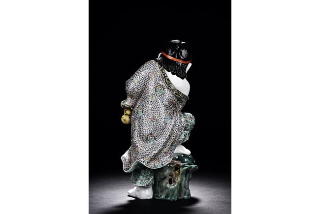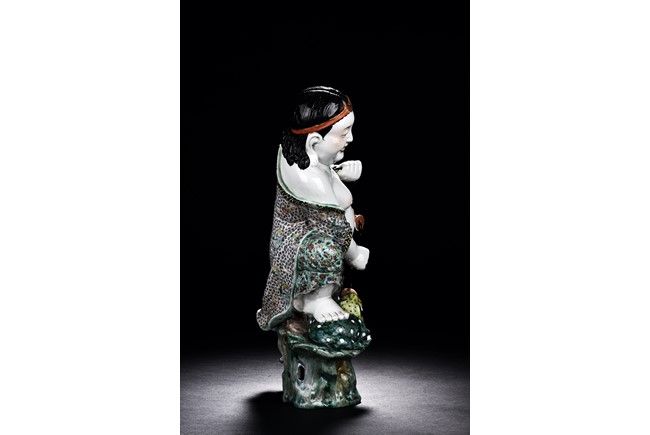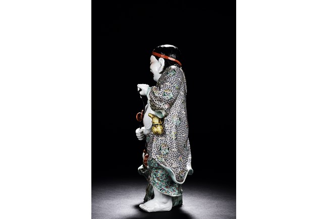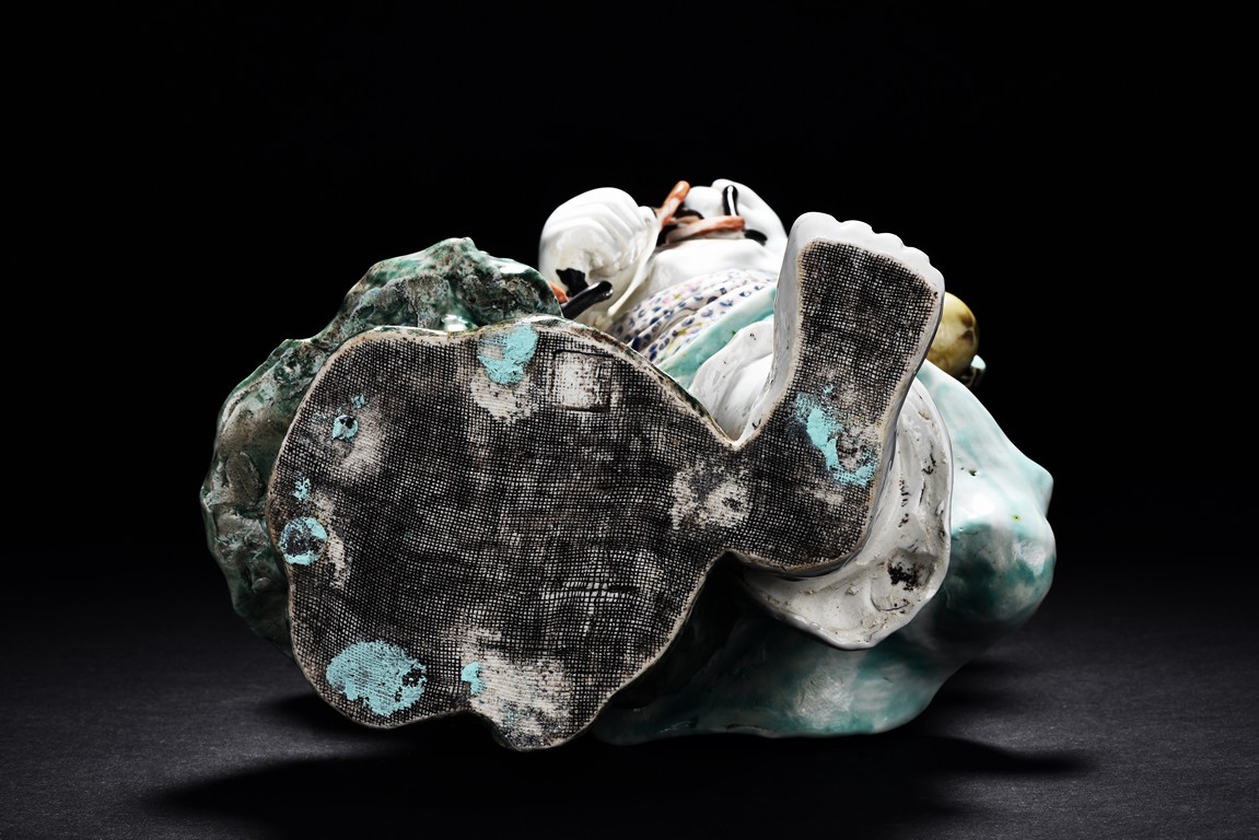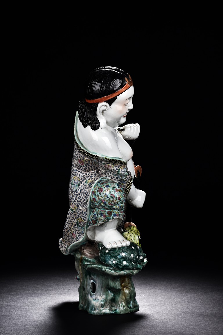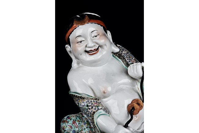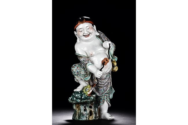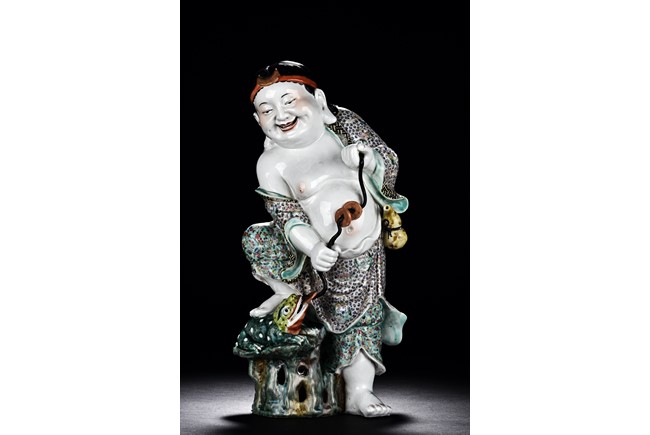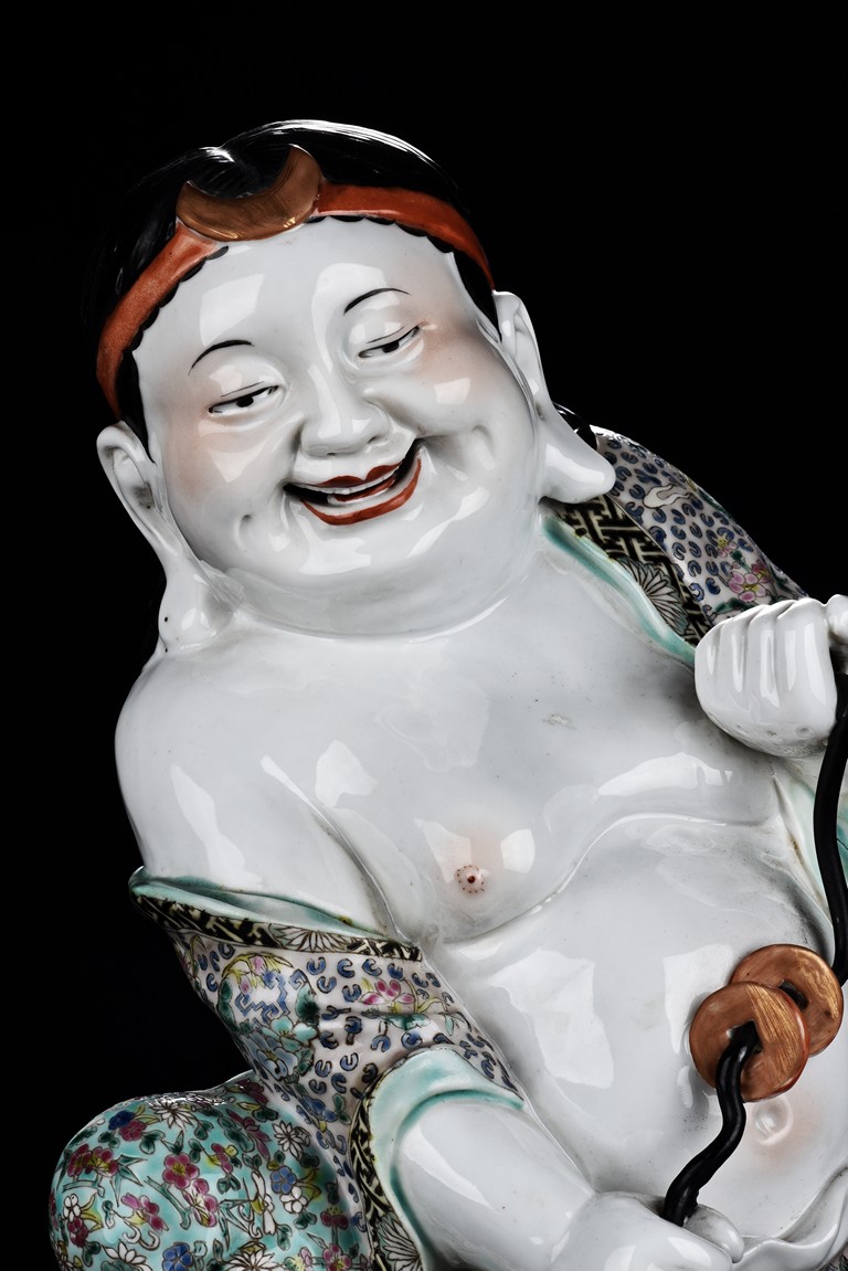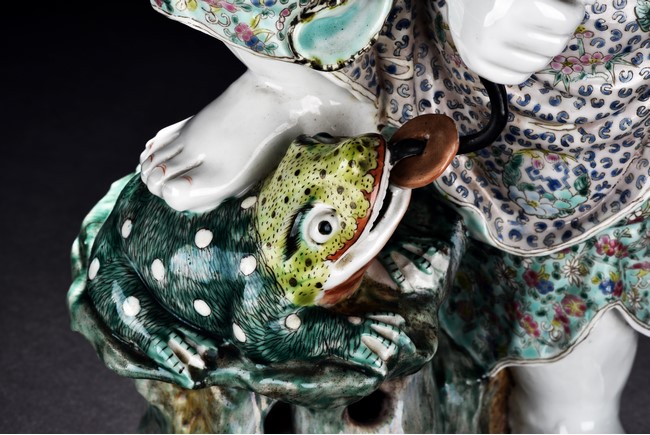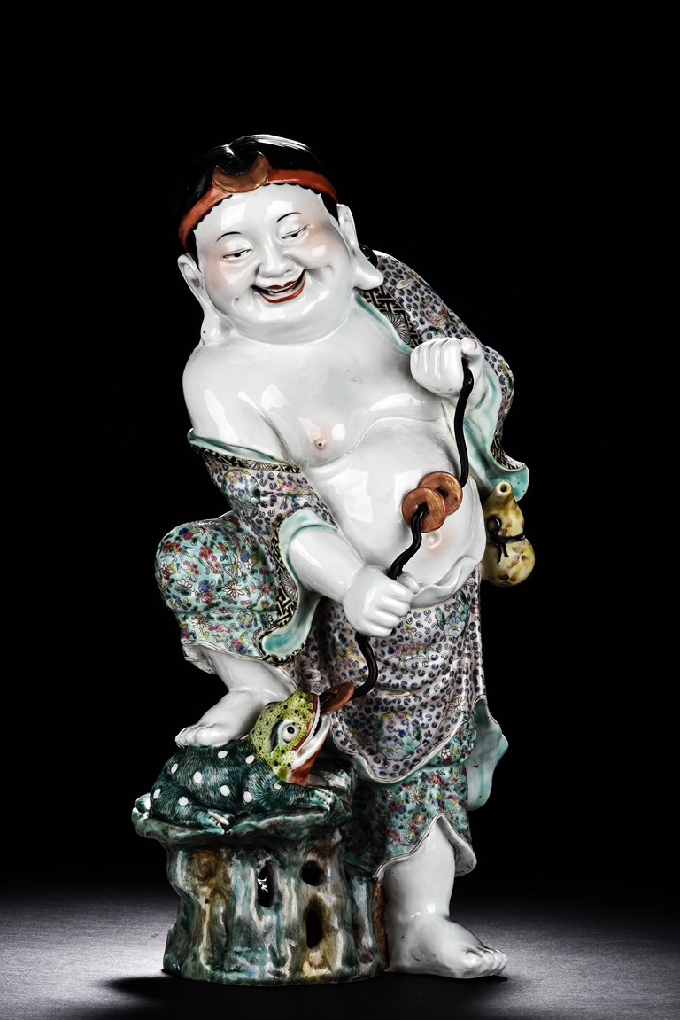 The figure is shown stepping one feet on his golden toad, with both hands holding a rope tied with coins, wearing long robe decorated with colorful floral pattern exposing belly, the face with smilling expression, the bottom bears a four character mark. Late Qing Dynasty period.