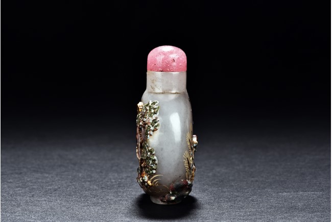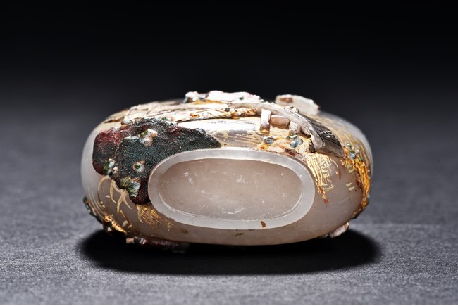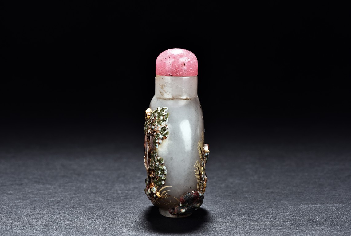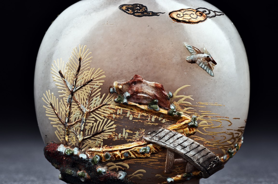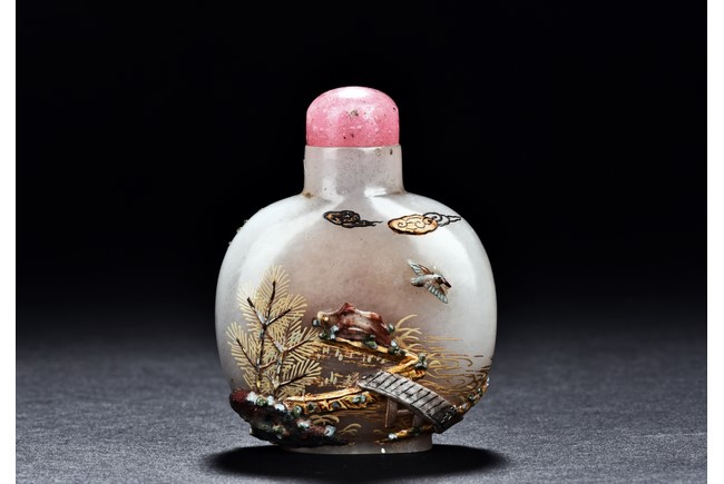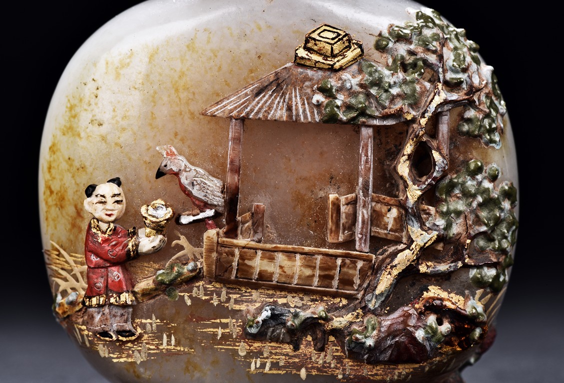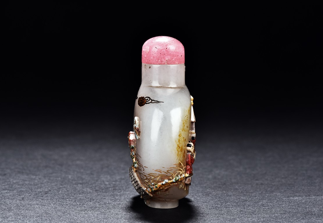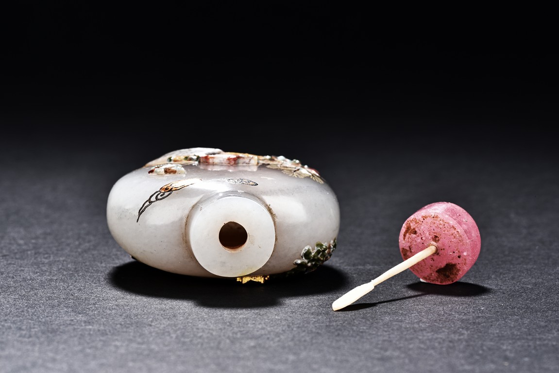 Of flattened, rounded square form, supported on an oval foot, the bottle delicately embellished with scene of a body feeding a parrot in a garden against the white jade ground with russet skin, the reverse with a riverside landscape with flying bird and auspicious clouds, all inlaid in gilt, lacquer, bones, mother-of-pearl, and hardstones. Qing Dynasty period.
