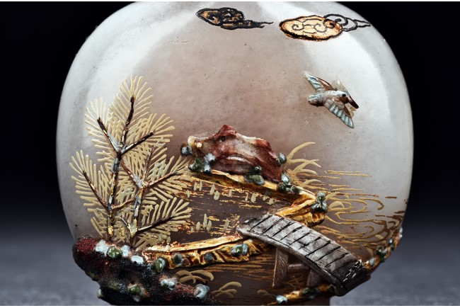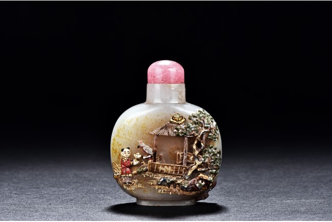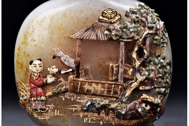 煙壺近於方形,一面帶皮,其上以百寶嵌成庭院嬰戲圖案。百寶嵌以金銀、寶石、珍珠、珊瑚、碧玉、翡翠、水晶、瑪瑙、玳瑁、青金、綠松石、螺鈿、像牙、蜜蠟、沉香等多種珍貴材料雕成各式花紋,在漆器上鑲嵌出色彩紛繁的畫面,因其為明代藝人周翥所創,故名“周制”,明清時流行。此種工藝傳至琉球,故多見琉球百寶嵌煙壺,然此煙壺的鑲嵌風格卻顯示這是中國百寶嵌。