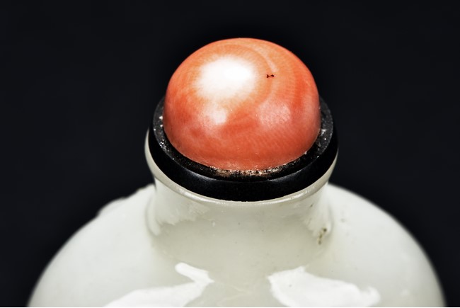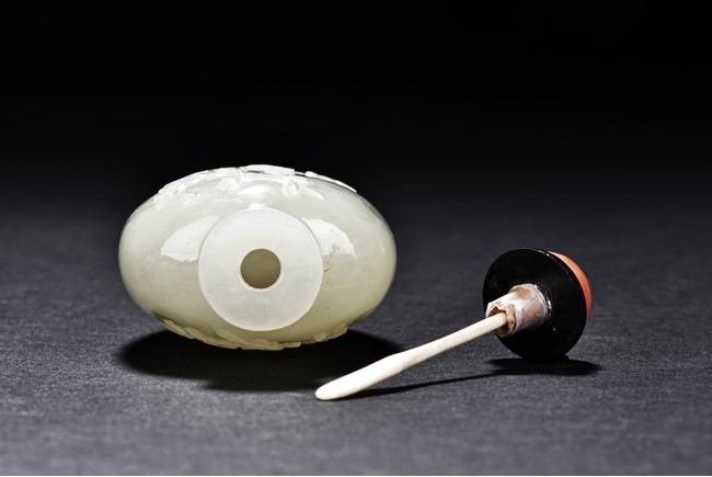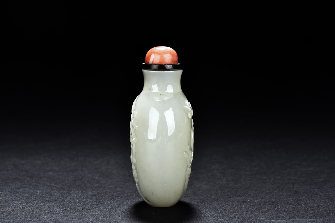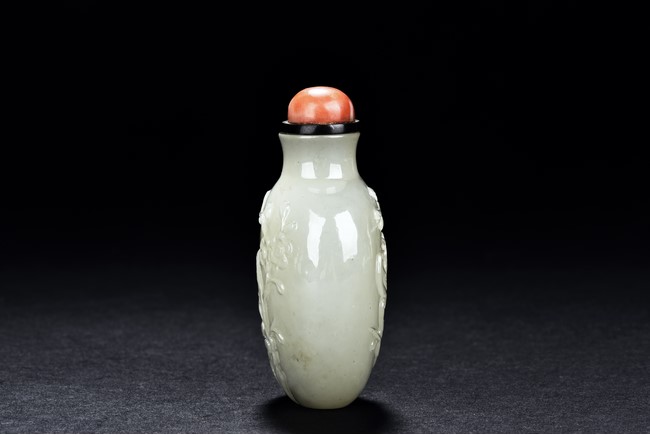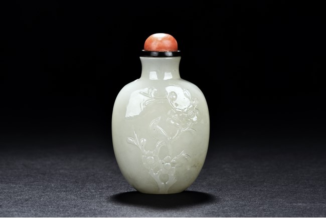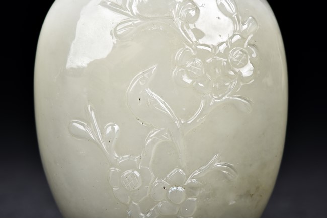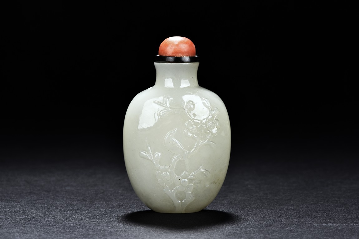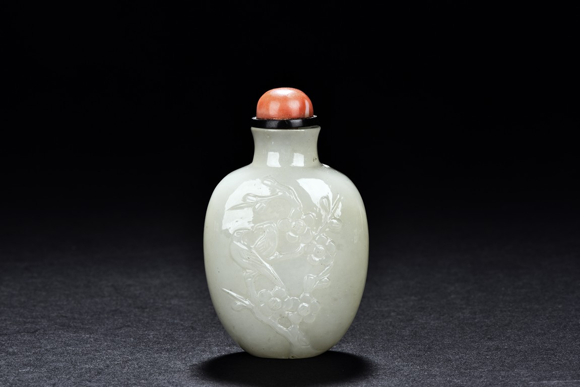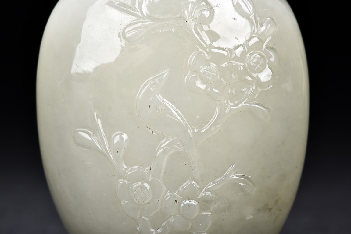 Of oval egg form and the straight neck rising to a flared rim, the bottle is carved in shallow relief with magpie atop plum tree on front body, the reverse carved with two magpies on plum tree. The stone is of translucent even white tone. Qing Dynasty period.