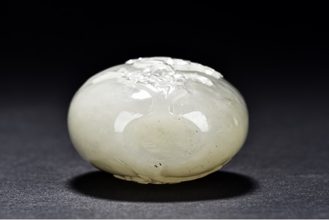 此壺為卵形,直頸,口微敞。兩面減地浮雕梅花喜鵲,取意“喜上眉梢”。玉質細膩,泛著翡翠一樣的光澤。