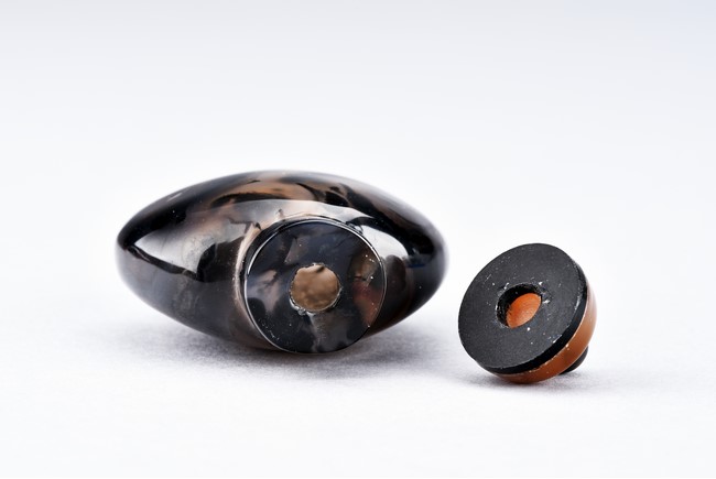Of rounded body and cylindrical neck, the well hollowed body is supported on ovoid foot base, the stone is of translucent matrix displaying black and brown patches. Republic period.