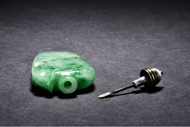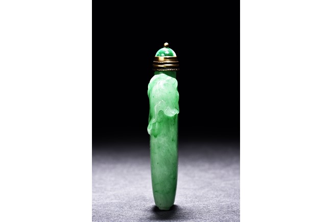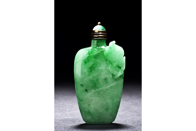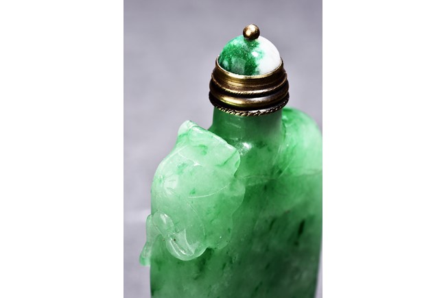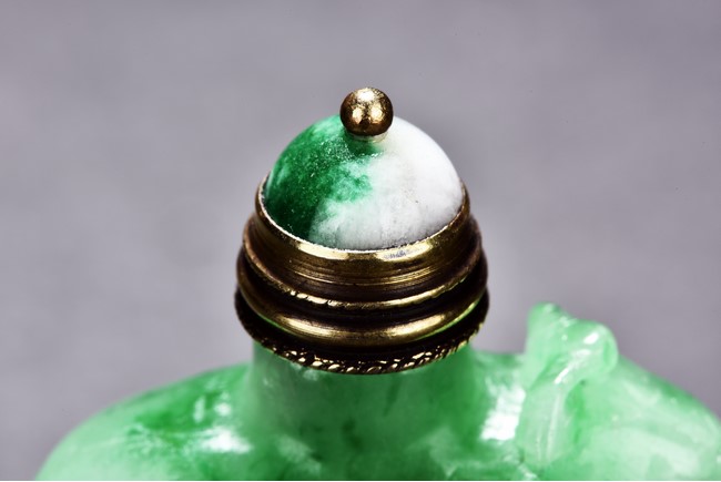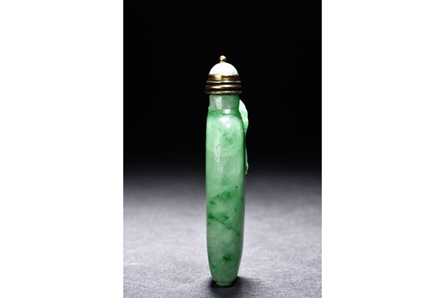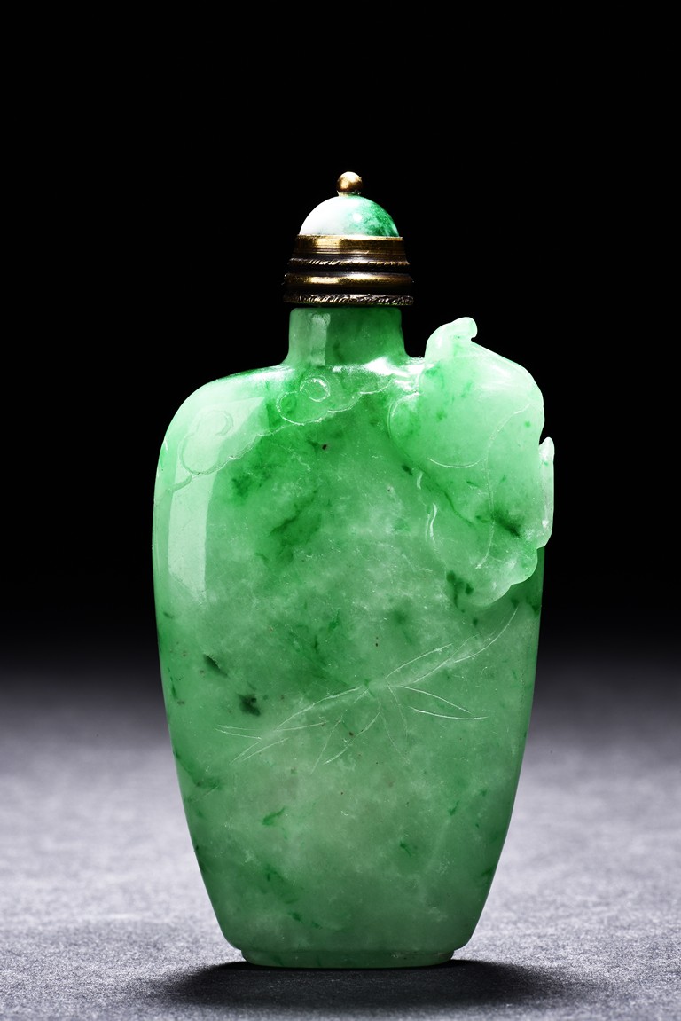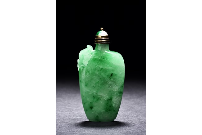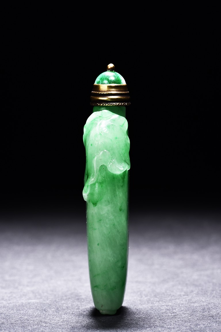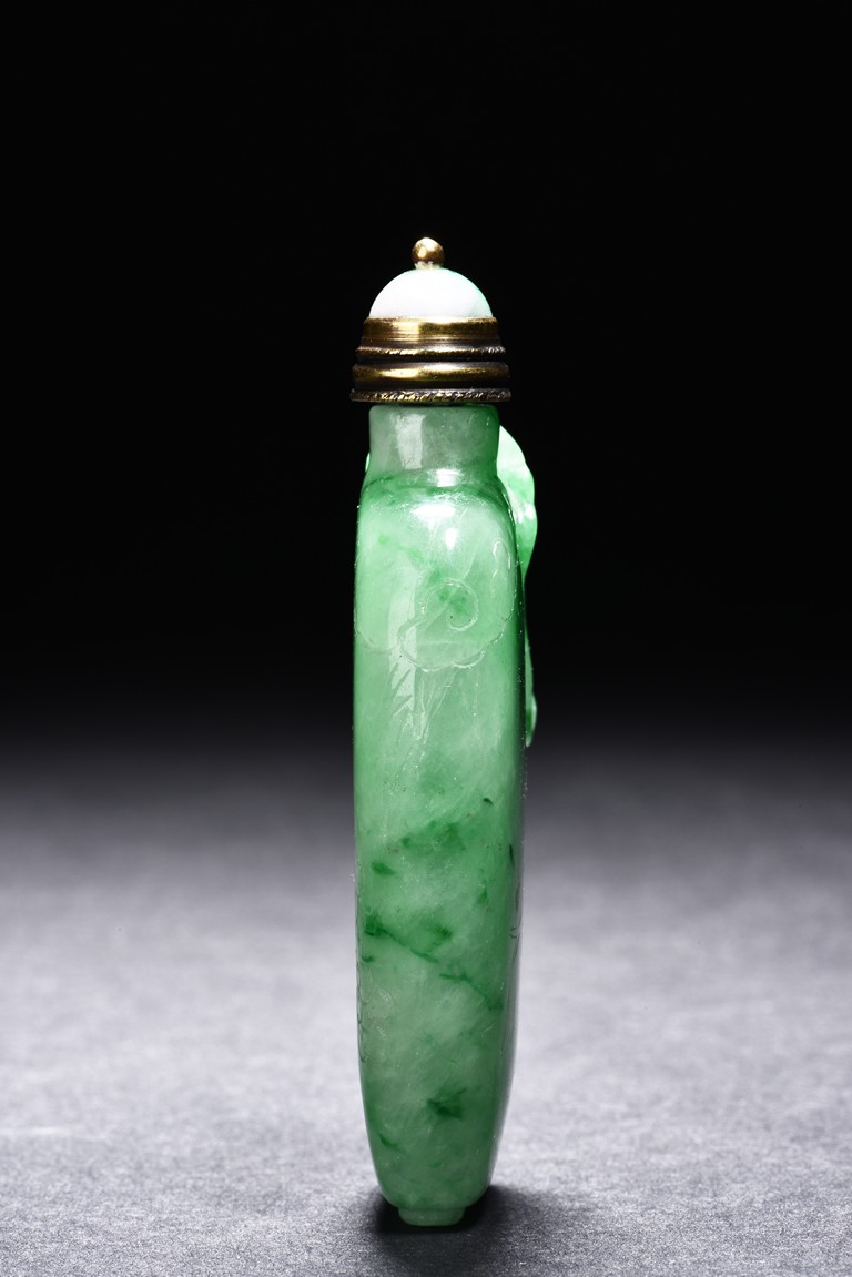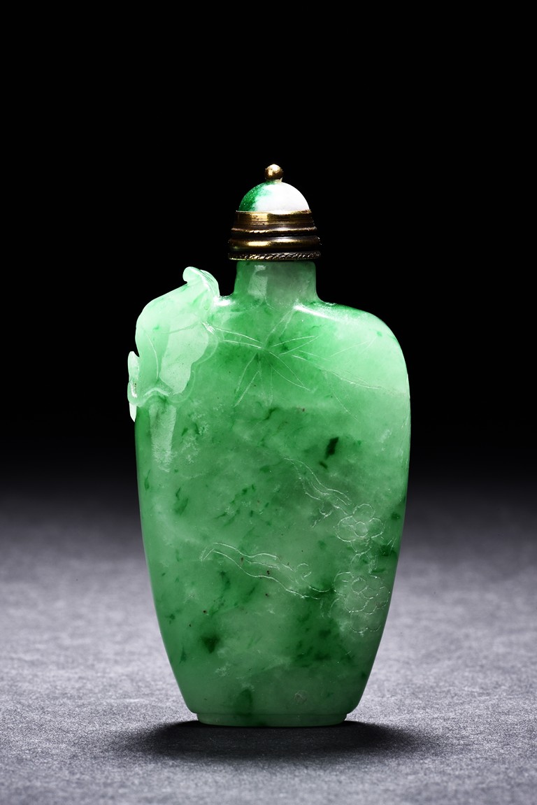The snuff bottle is carved with a flattened, ovoid form. The body incised with leafy flowers on both sides, the upper shoulder carved in relief with a lotus leaf, the top completed with a bulbous jadeite stopper. The stone is of translucent pale green tone suffused with cloud like emerald green mottling.