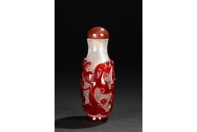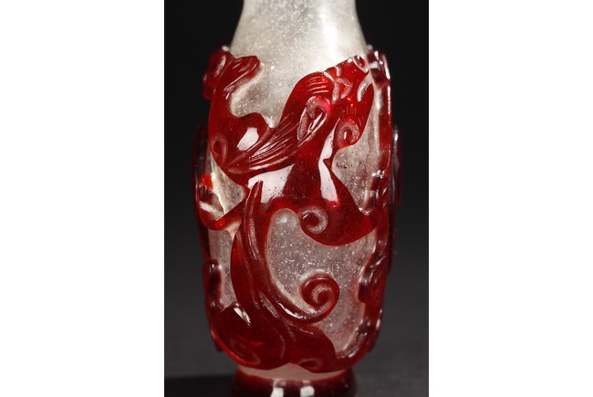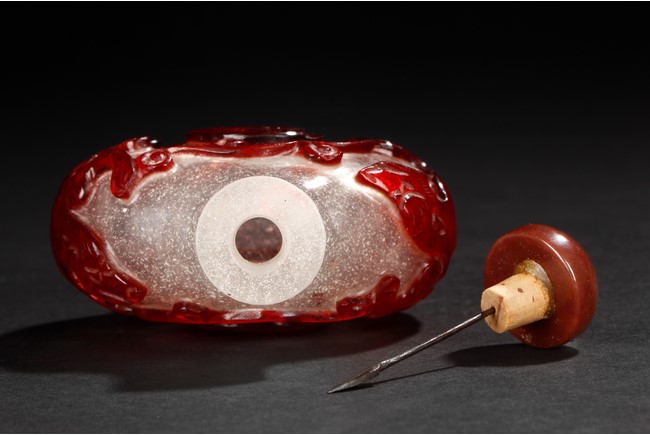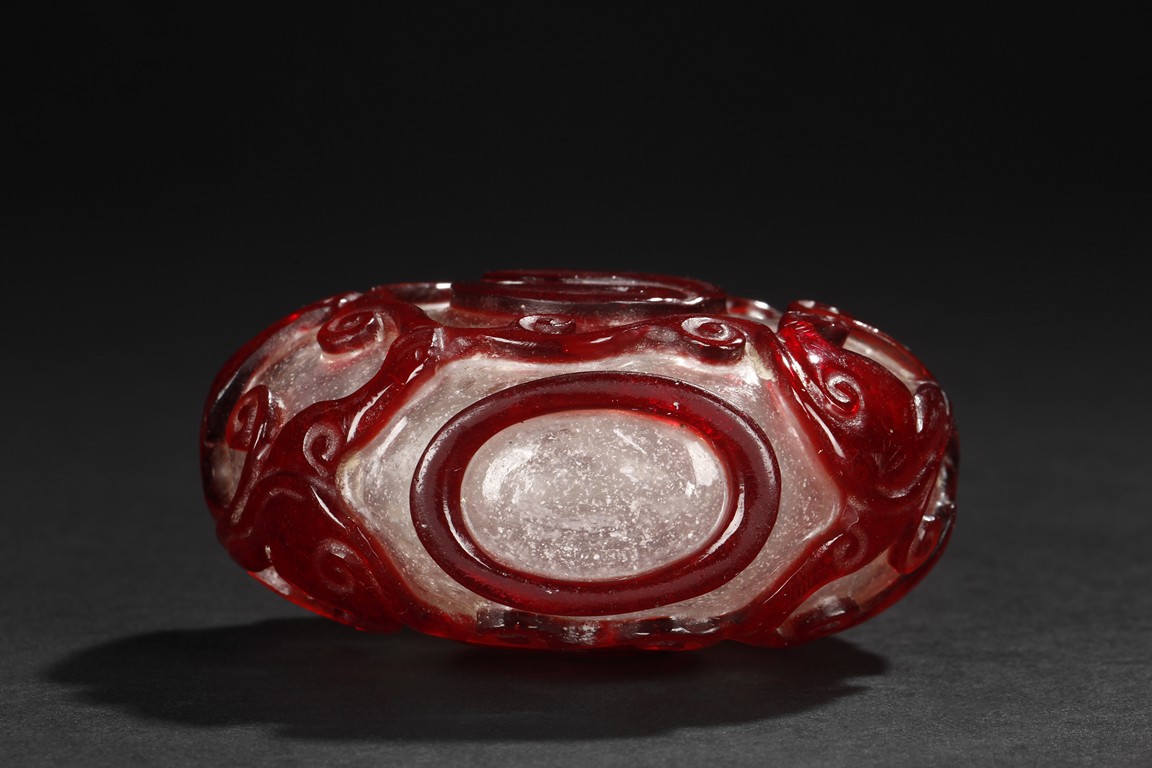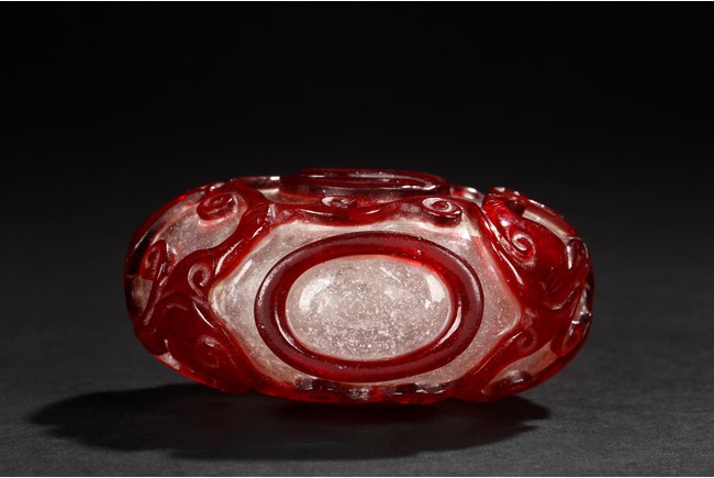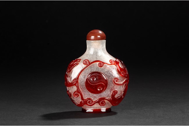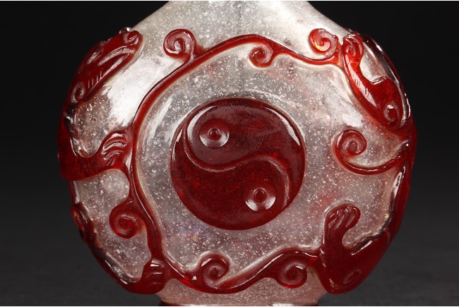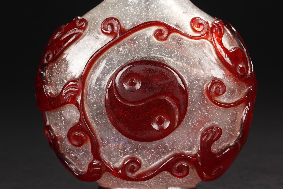 Of flattened rounded form rising from oval foot ring, it is carved through the layer of red overlay to the white glass, depicting a Taichi motif. Republic period.