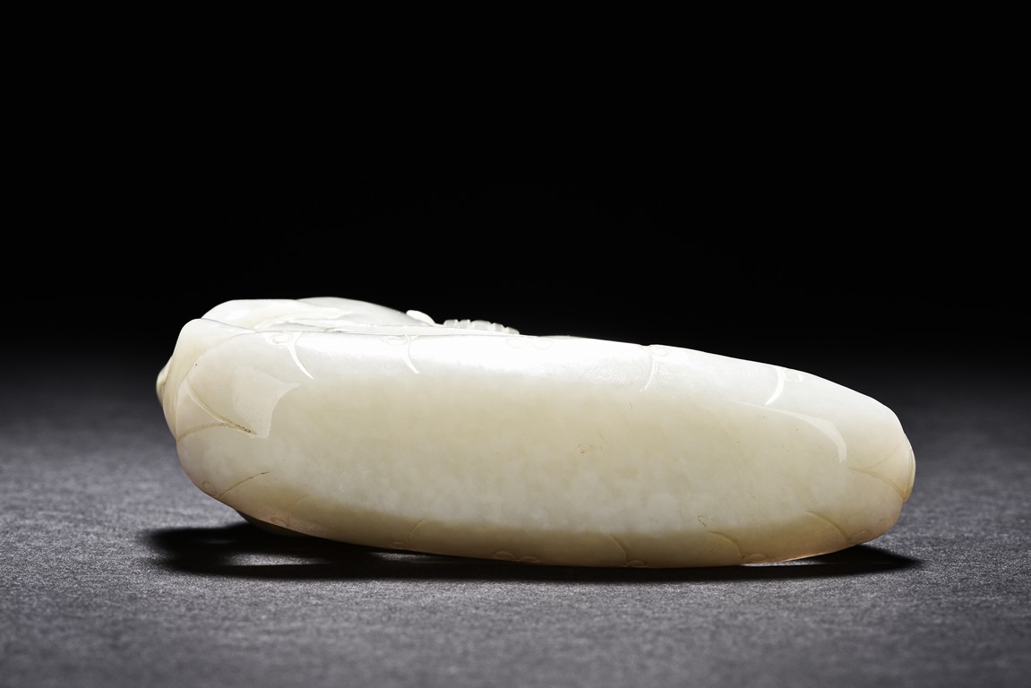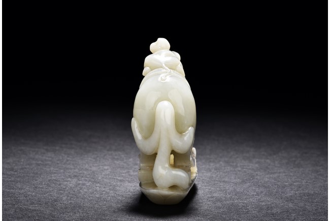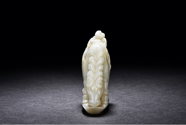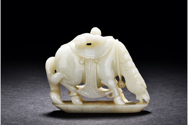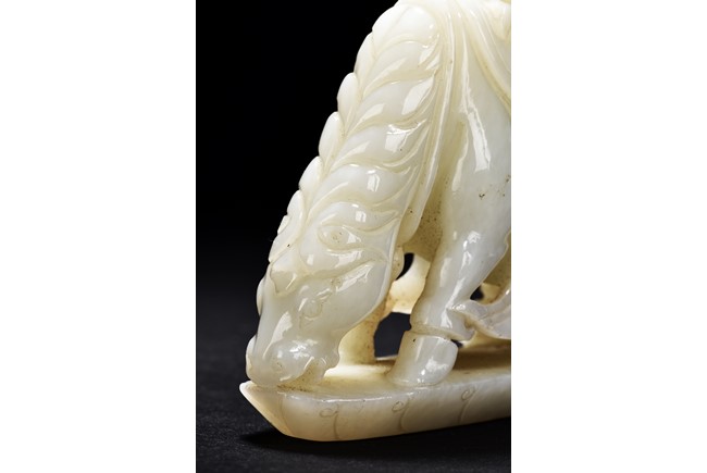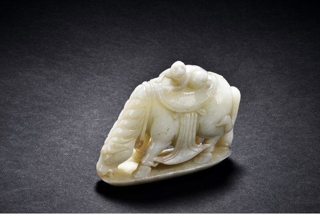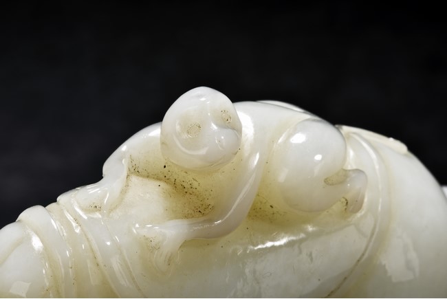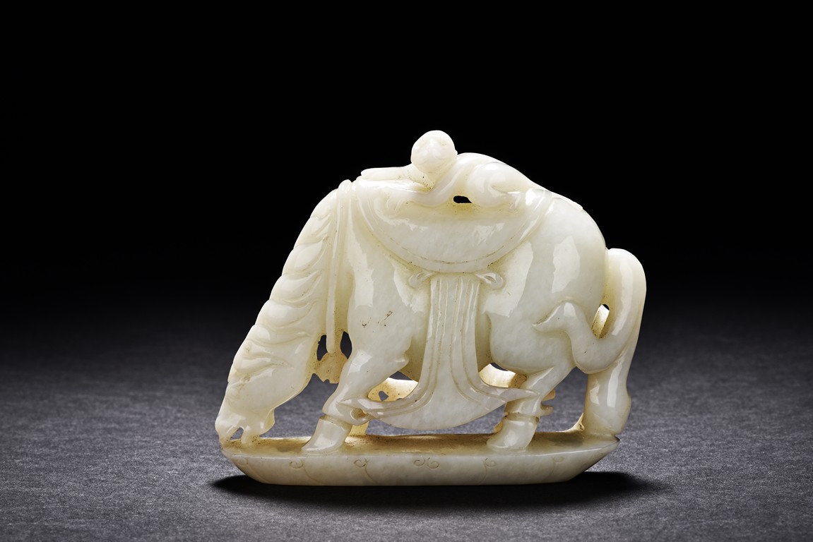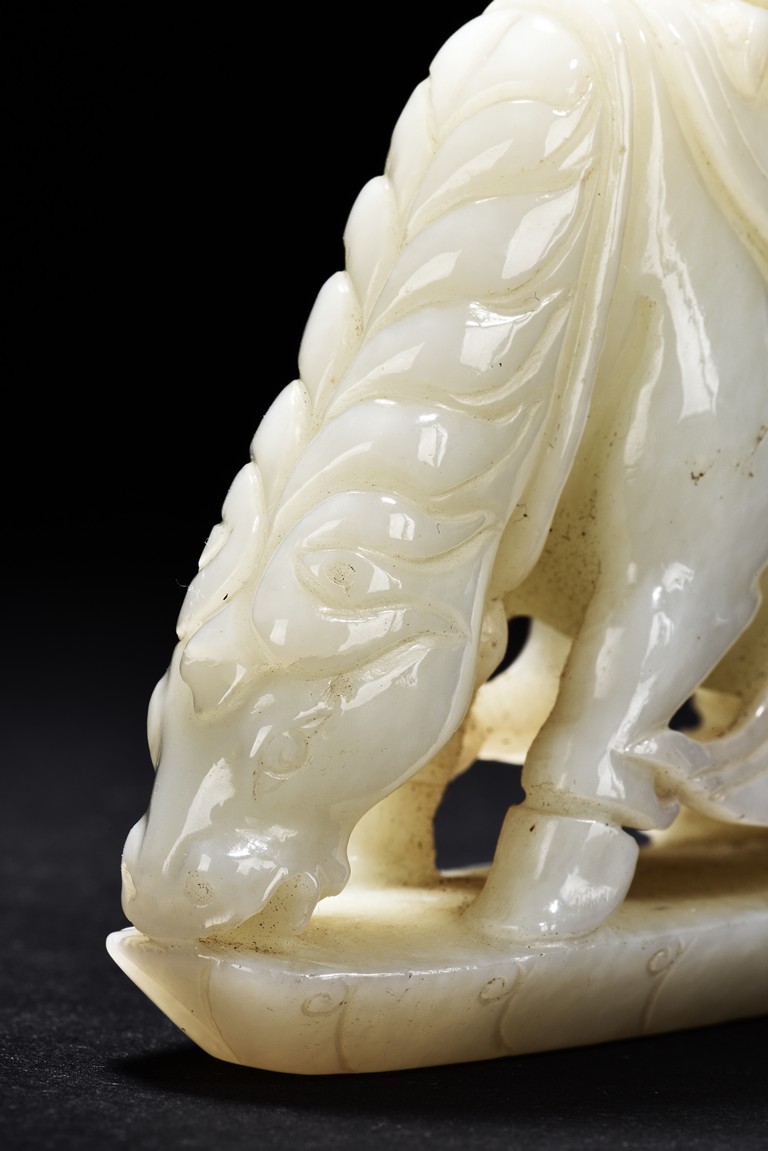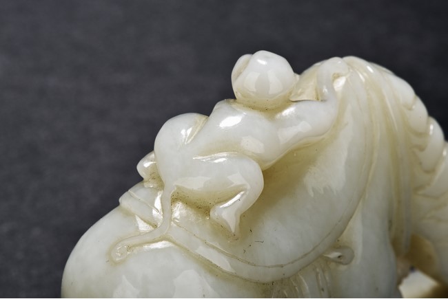 The monkey is carved playfully laying upon the back of horse, while the horse is standing foursquare eating grass, the mane detailed with carved-in lines. The stone is of well polished white tone. Qing Dynasty period