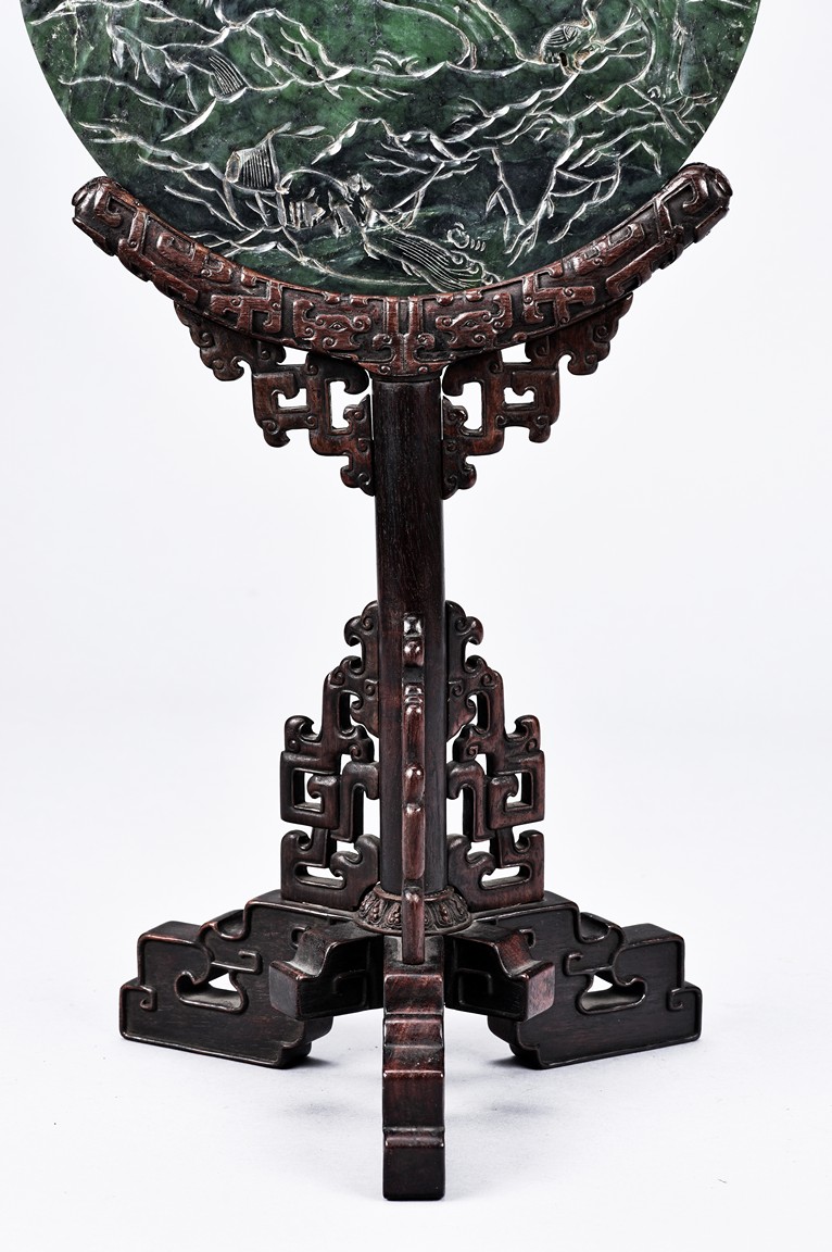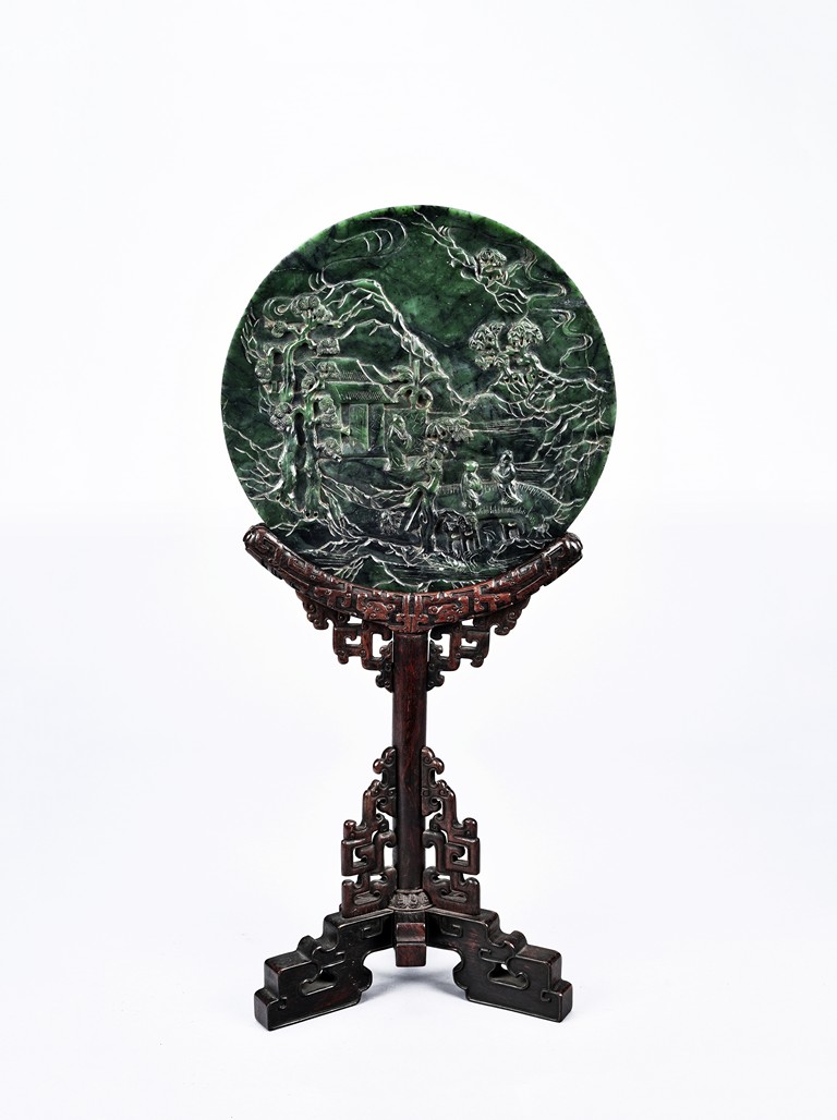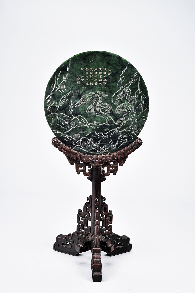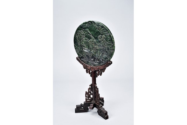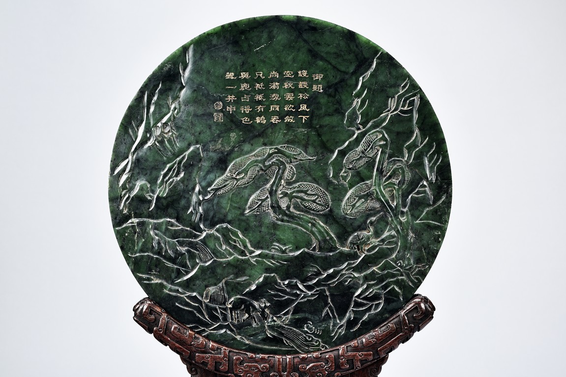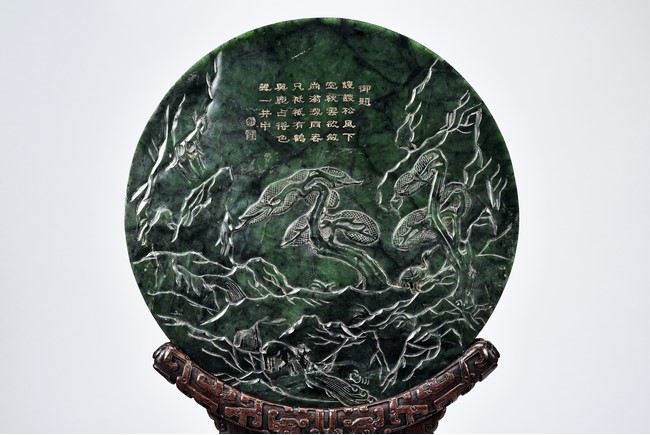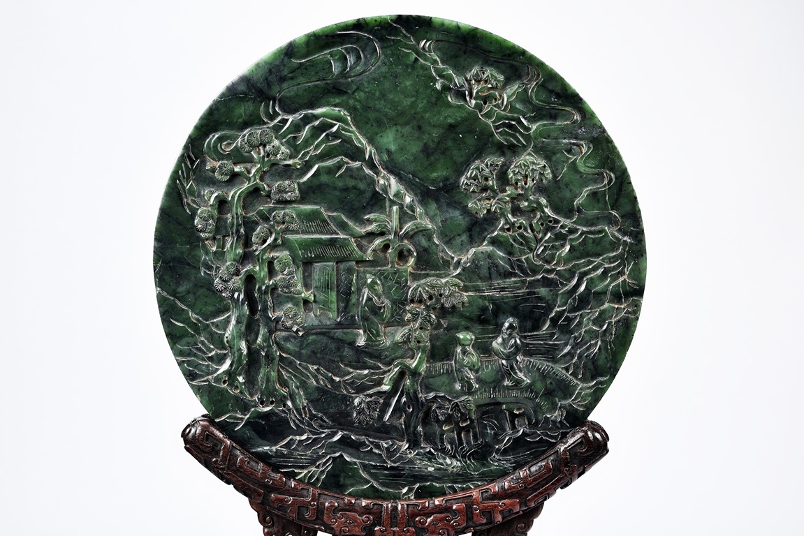 The spinach jade plaque is of round form, the front carved in details of a riverside village scene, with people, bridge, river, pine trees, bamboo tree, mountains, and house; the reverse carved with a mountain side scene, with animals gathered around the stream and trees, the top gild with Imperial poem with seal marks. Qing Dynasty period.