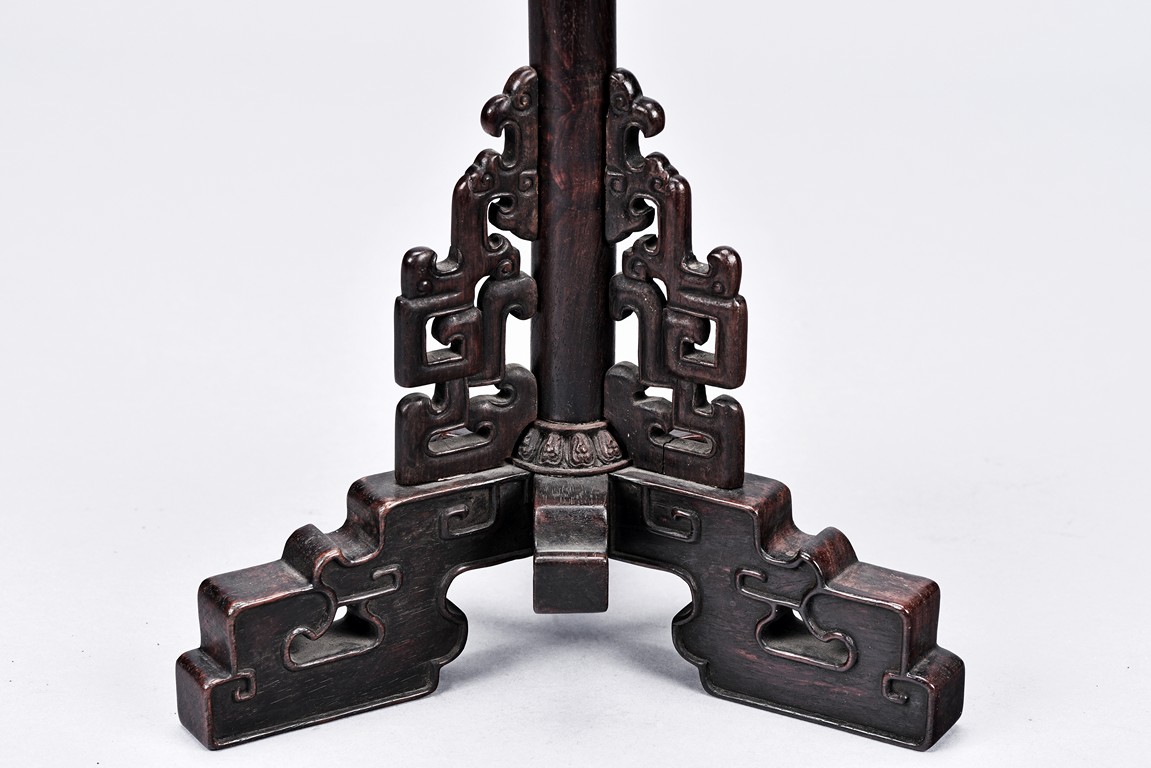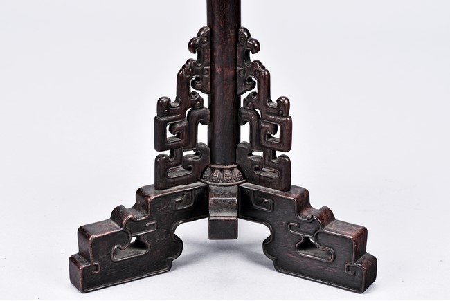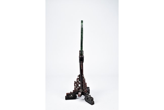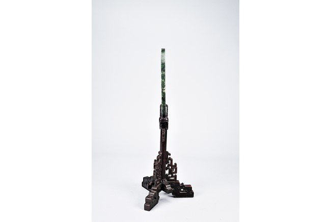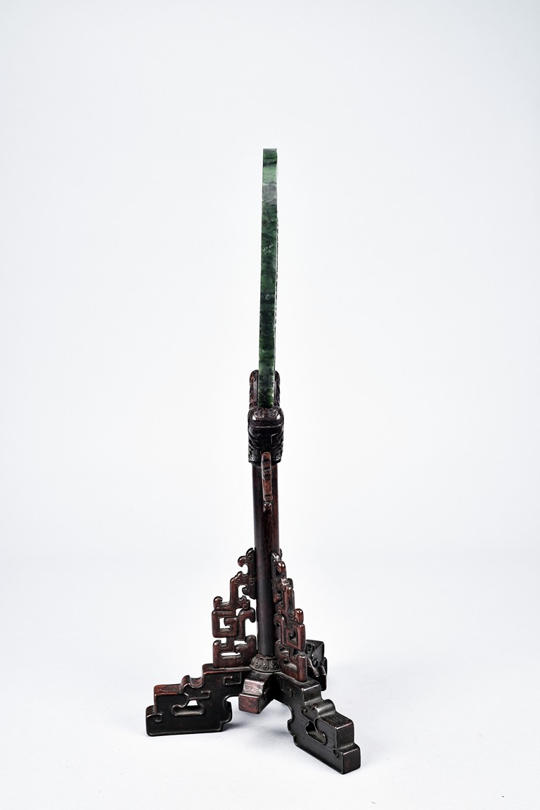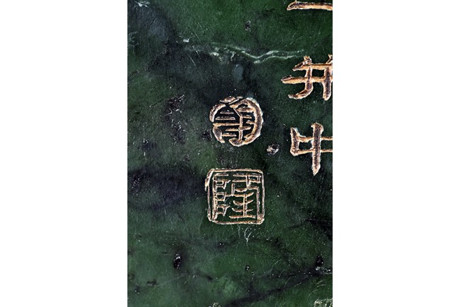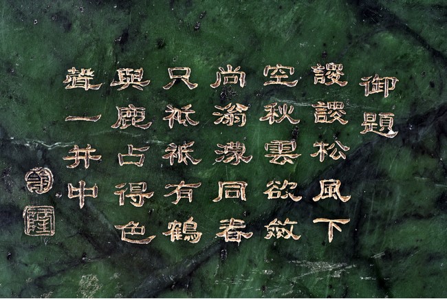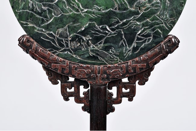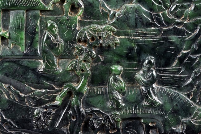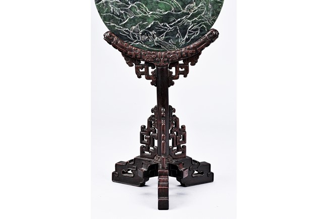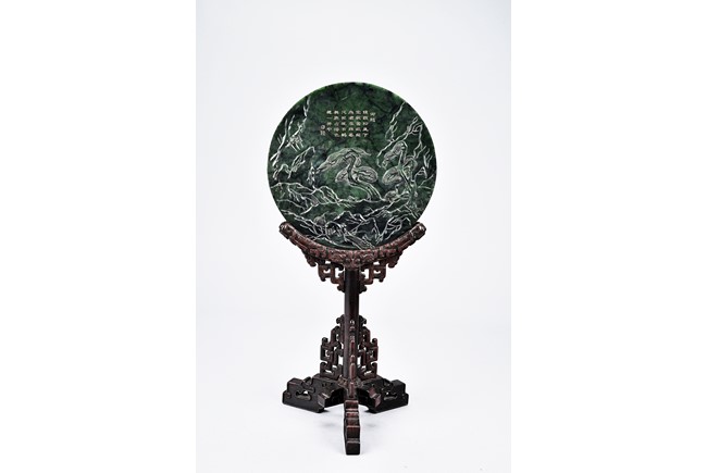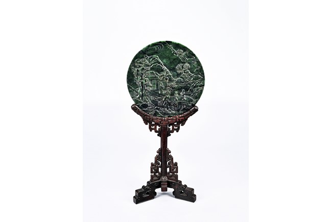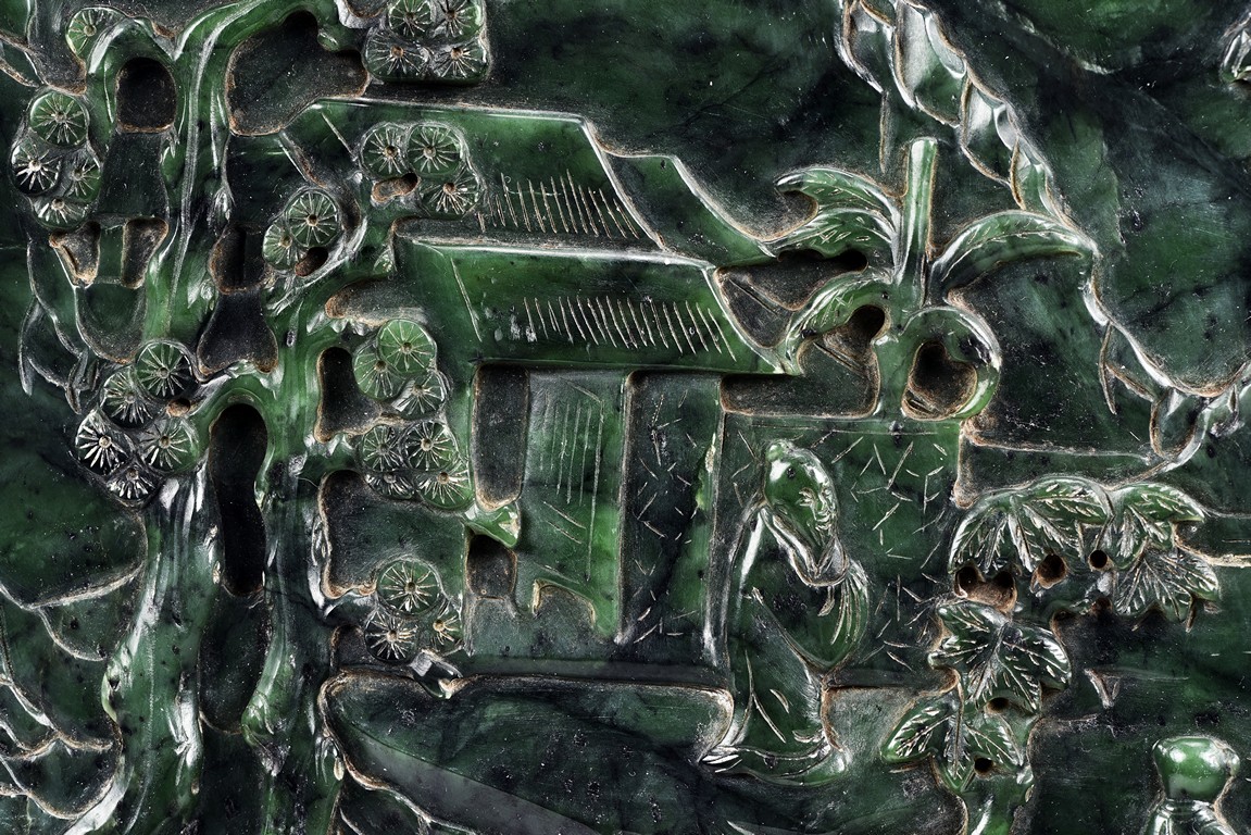 The spinach jade plaque is of round form, the front carved in details of a riverside village scene, with people, bridge, river, pine trees, bamboo tree, mountains, and house; the reverse carved with a mountain side scene, with animals gathered around the stream and trees, the top gild with Imperial poem with seal marks. Qing Dynasty period.