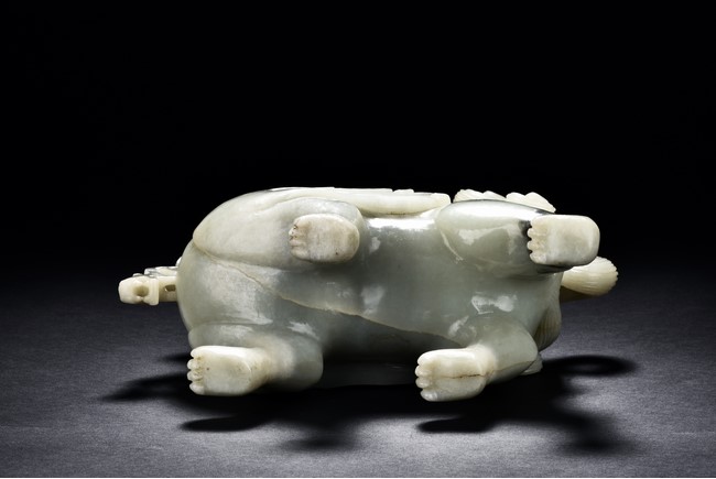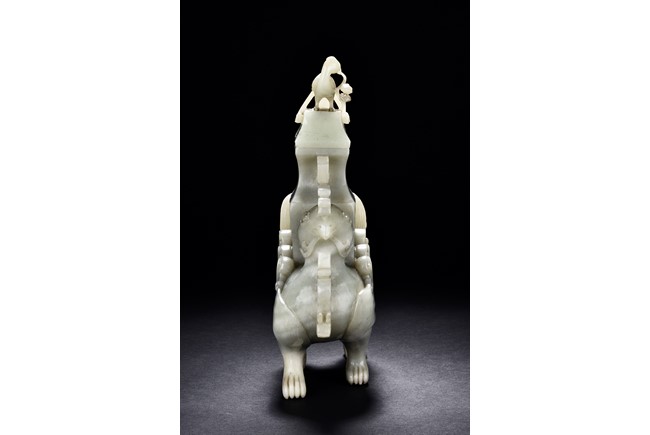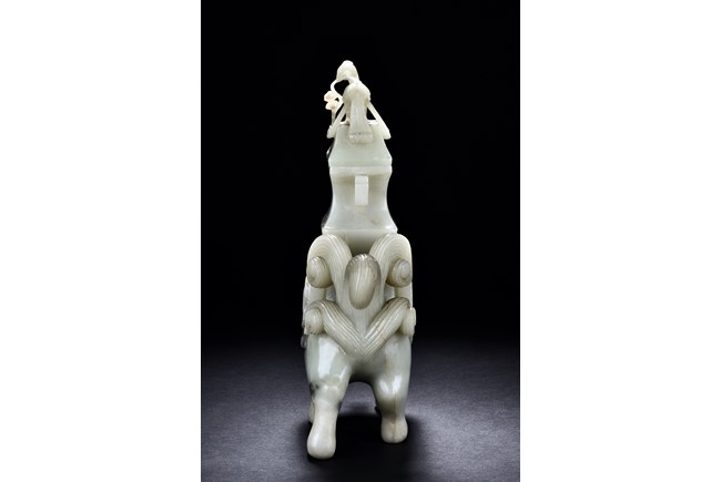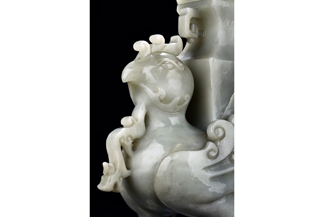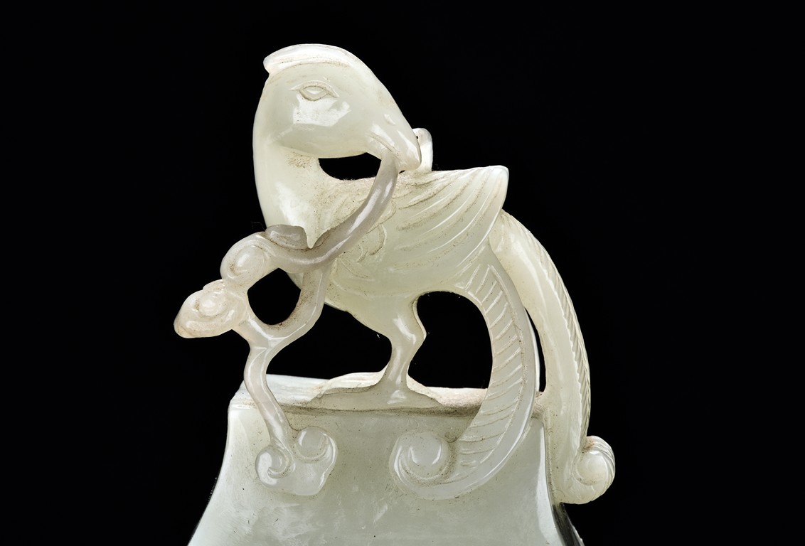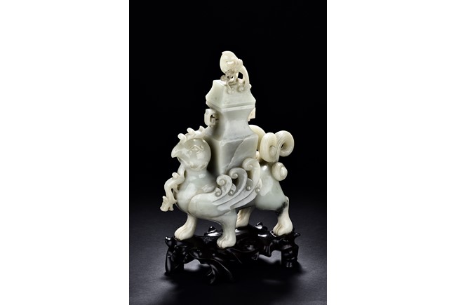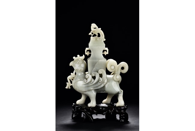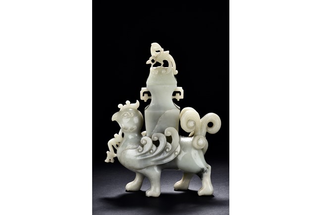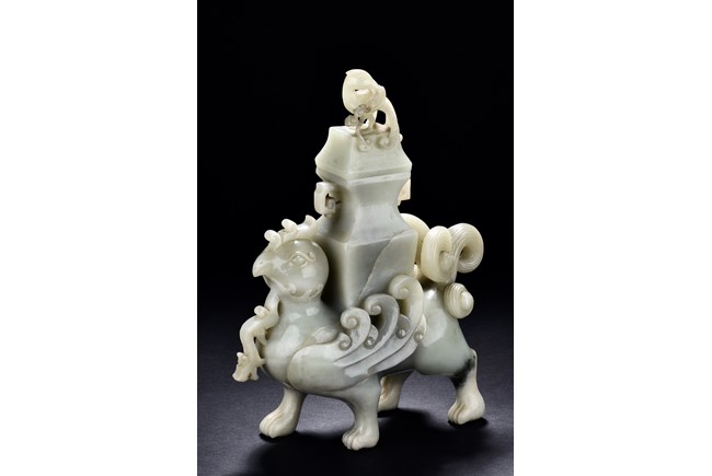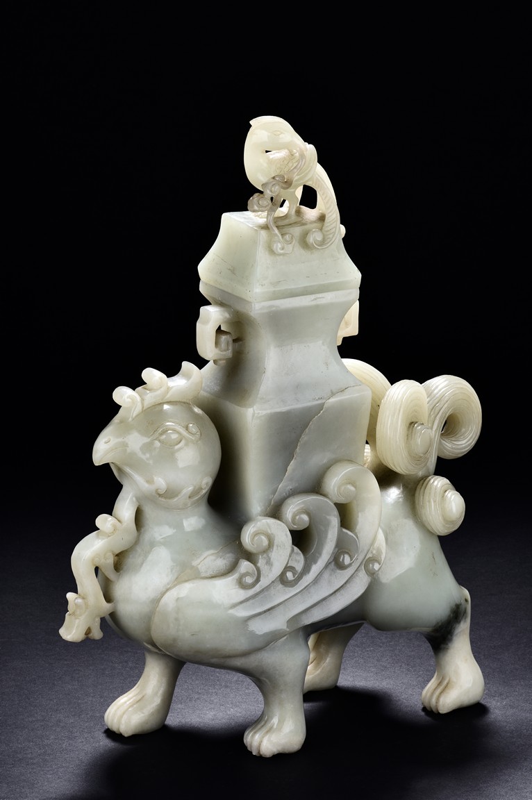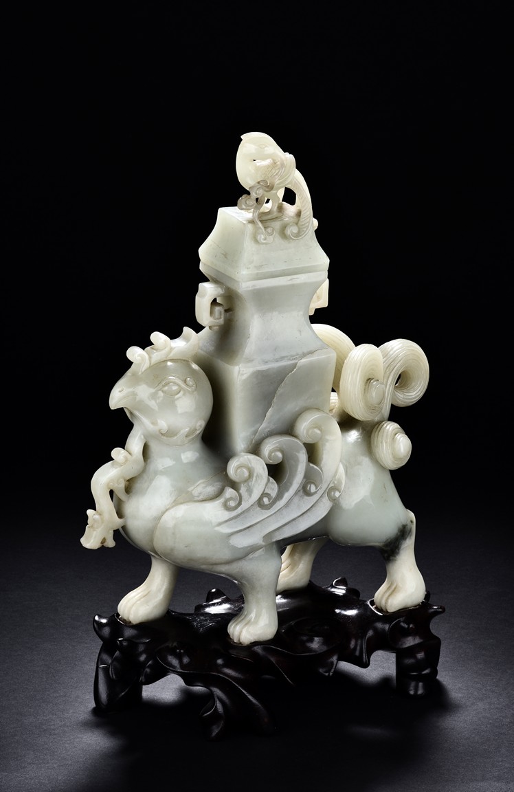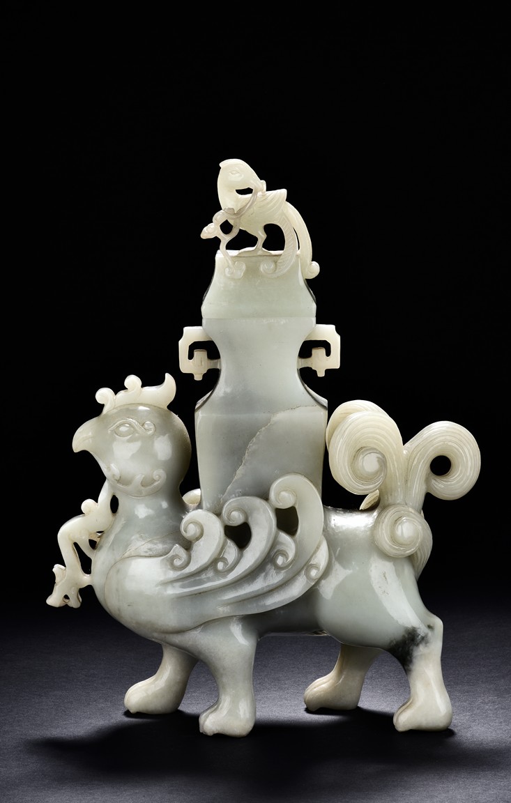 Modelled in the form of a mythical beast standing foursquare, looking straight forward, the wings curled up, the tails splitting into five curled branches , its back rests an lidded vase with recessed neck flanked by handles, the cover surmounted with a phoenix figure with long tails grasping a lingzhi branch in the mouth. Qing Dynasty period