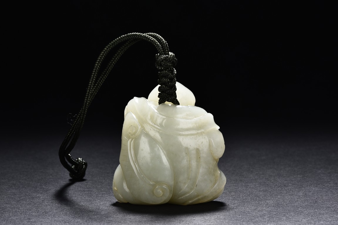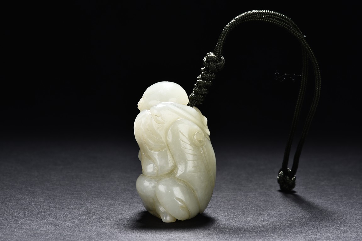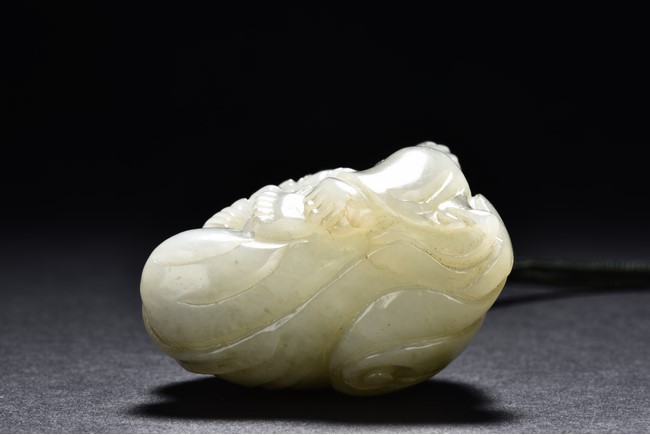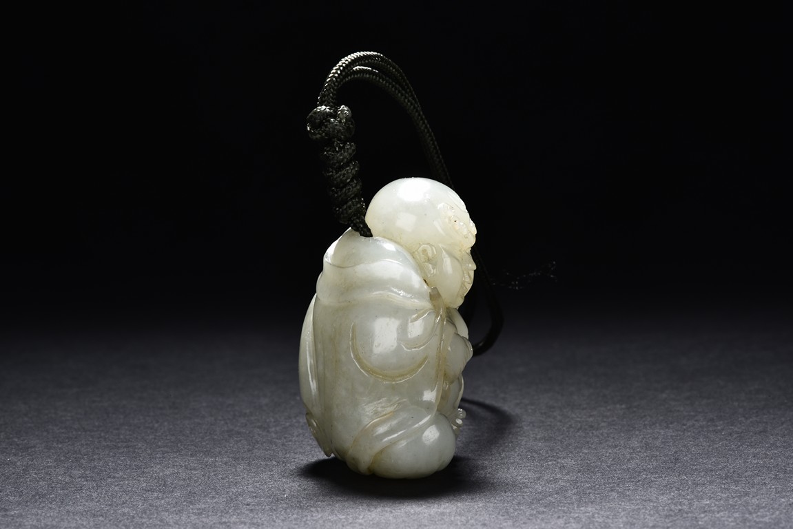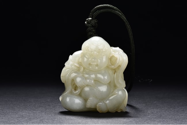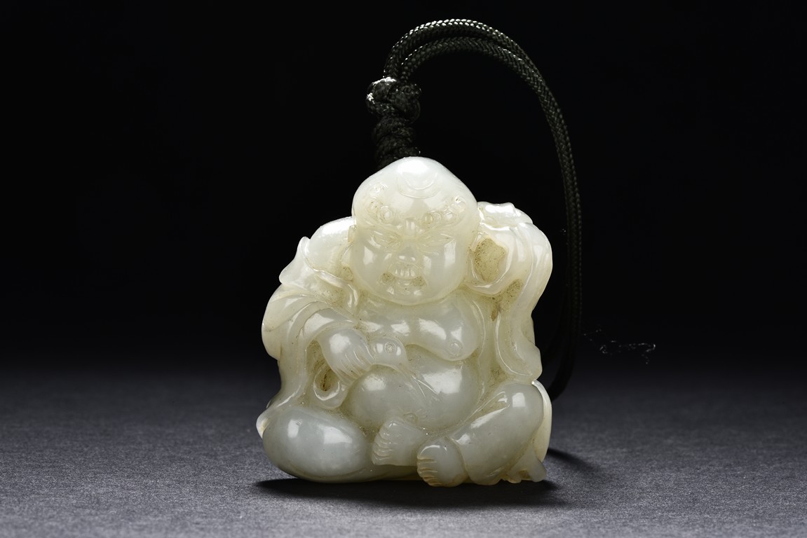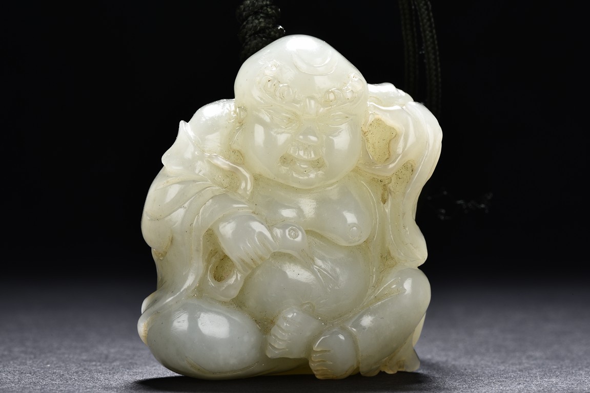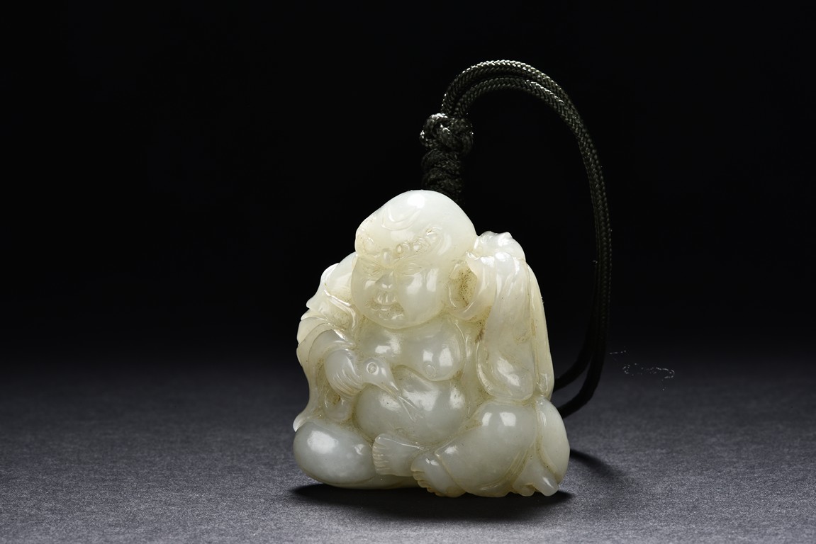The figure shown seated with left knee raised, dressed with long flowing robes exposing chest and belly,the right hand holding the neck of goose, left hand raises to ear, the face with joyful expression. Qing Dynasty period