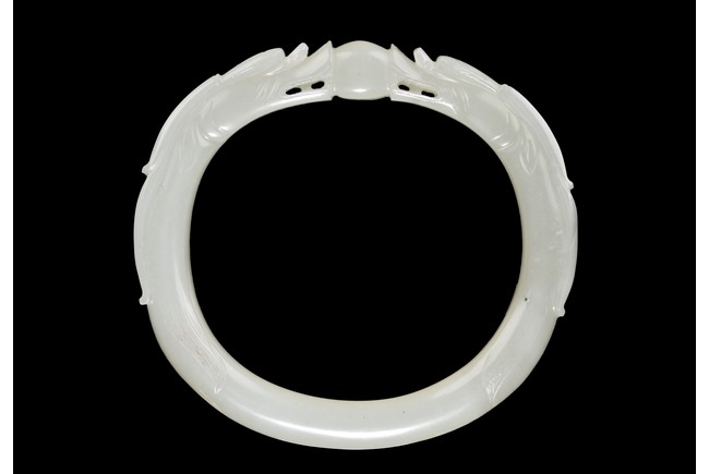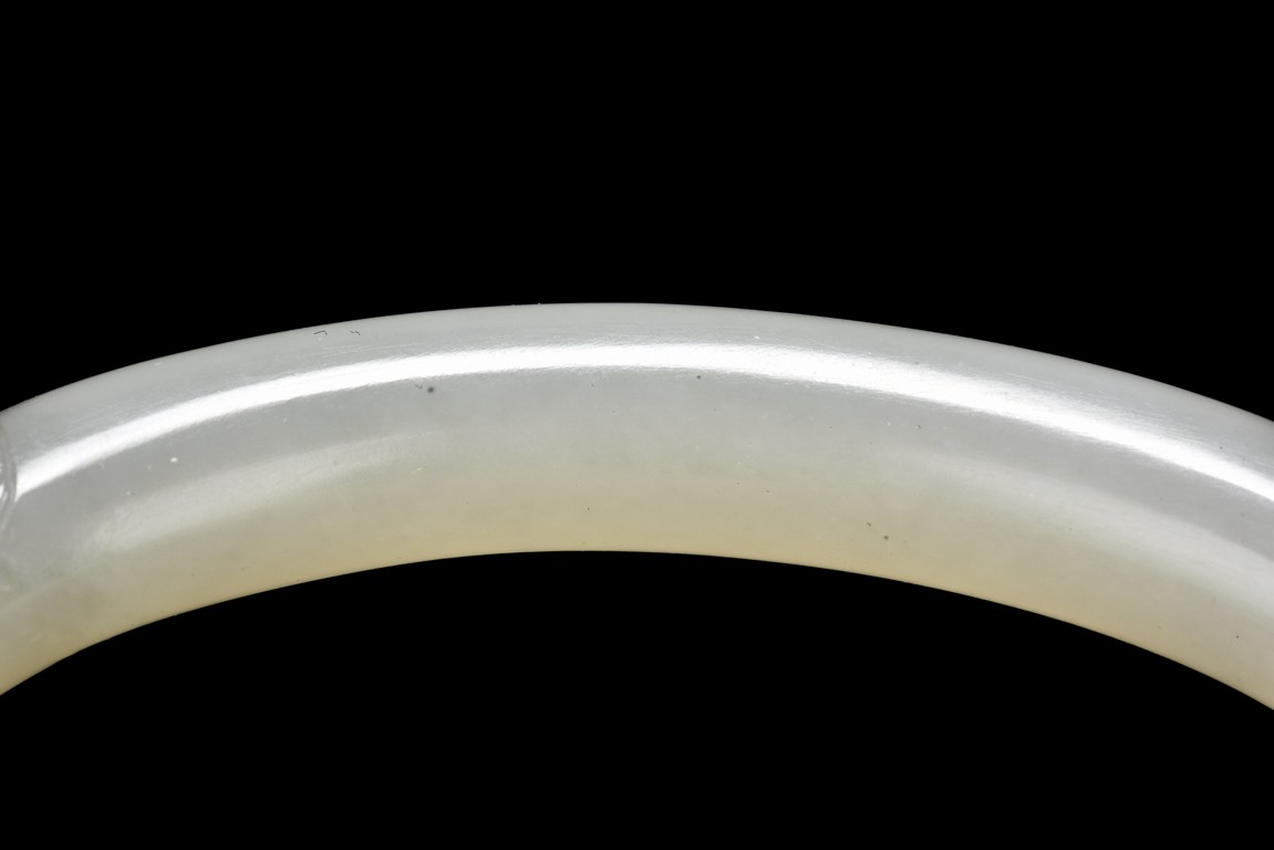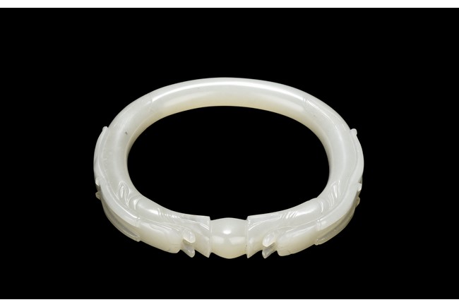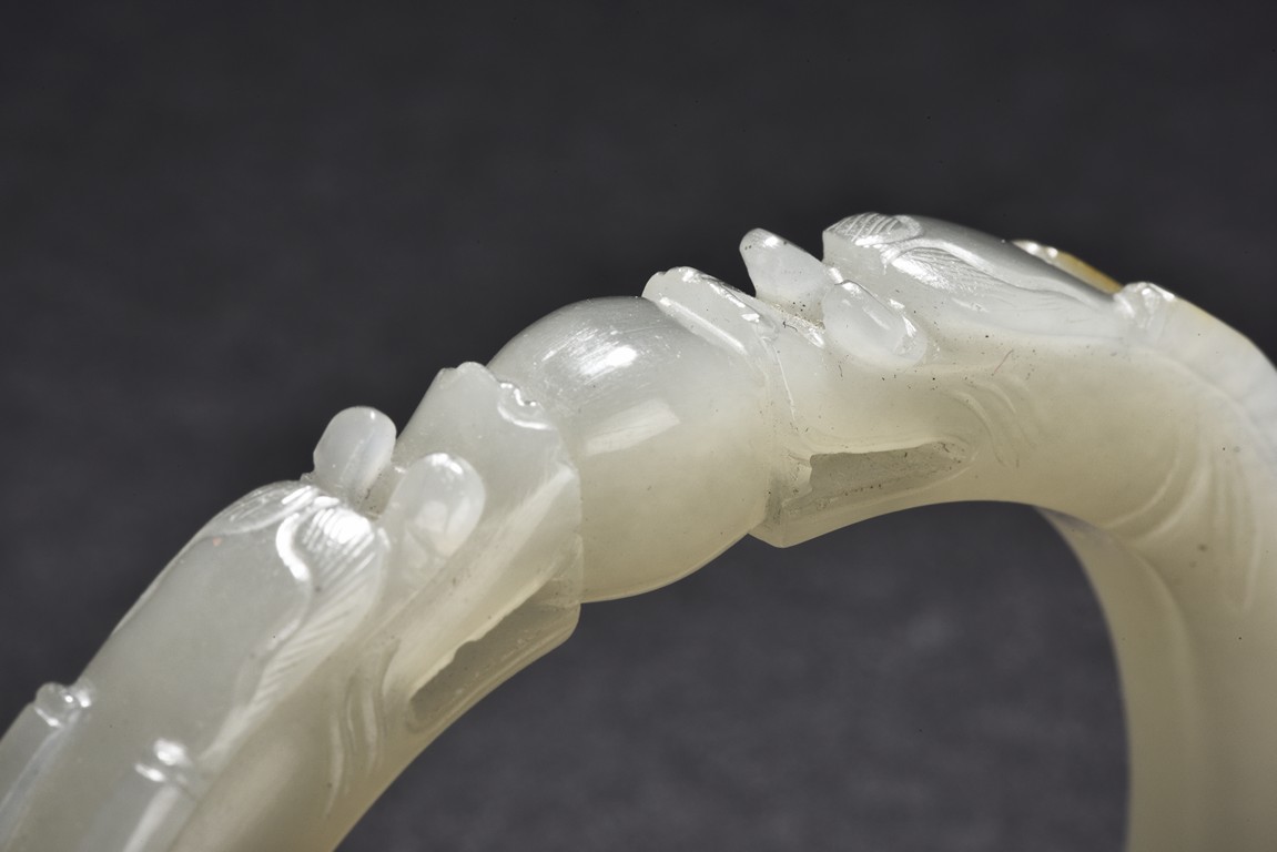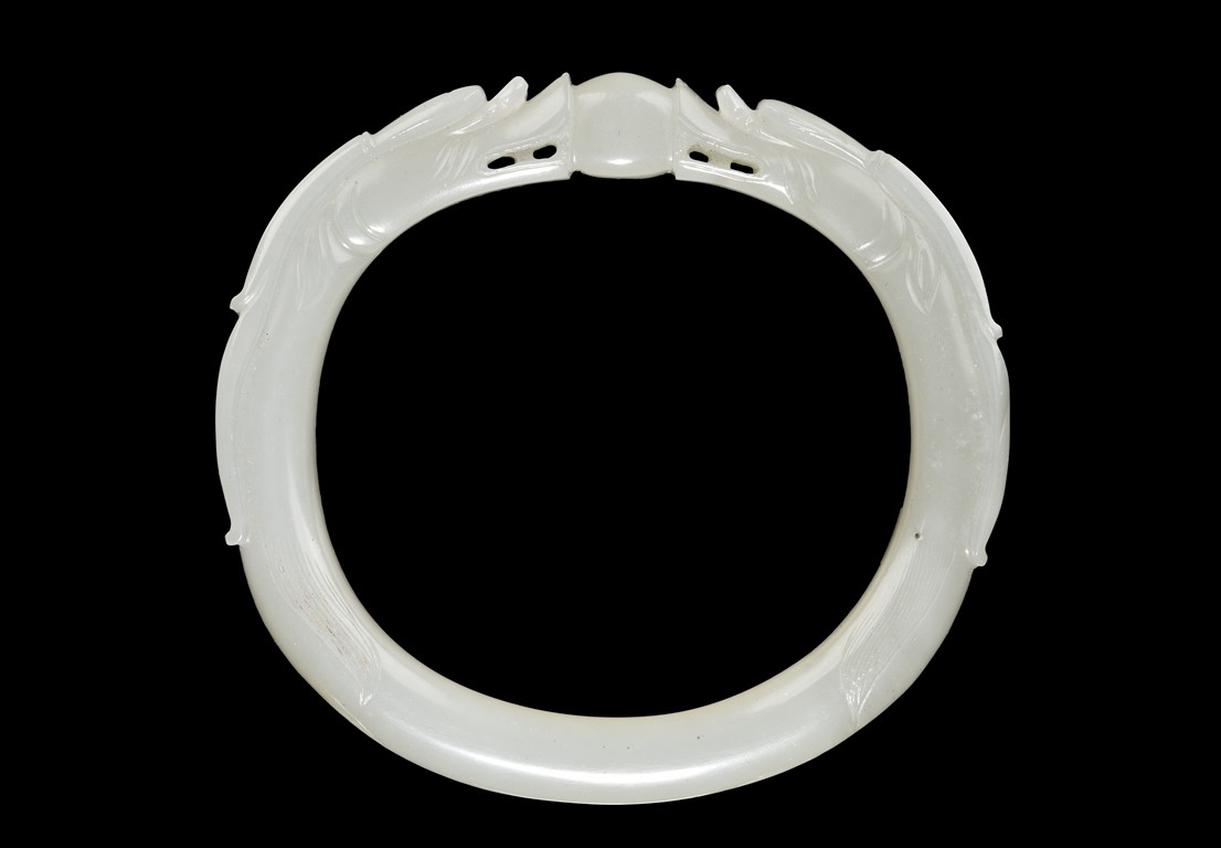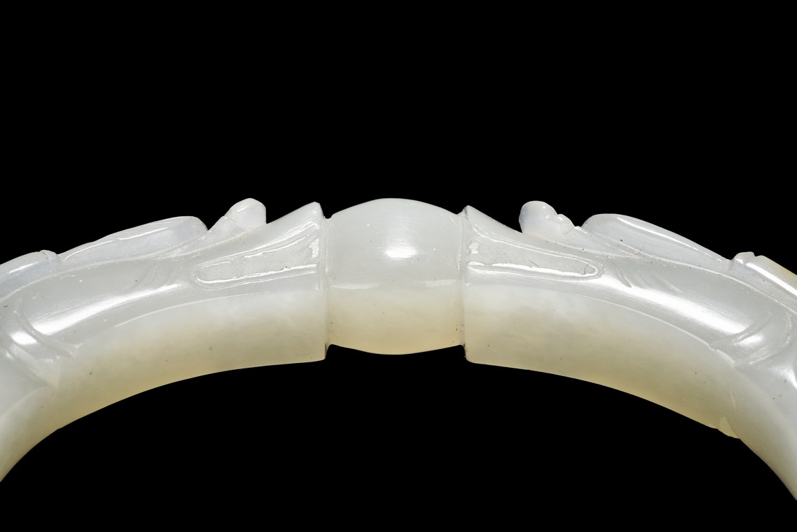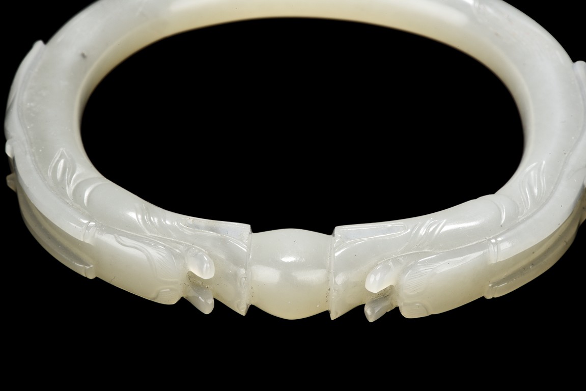 Of slightly compressed oval form, the bangle carved as two stylized confronting dragons aganist the pear. The stone is of translucent even white tone. Qing Dynasty period
