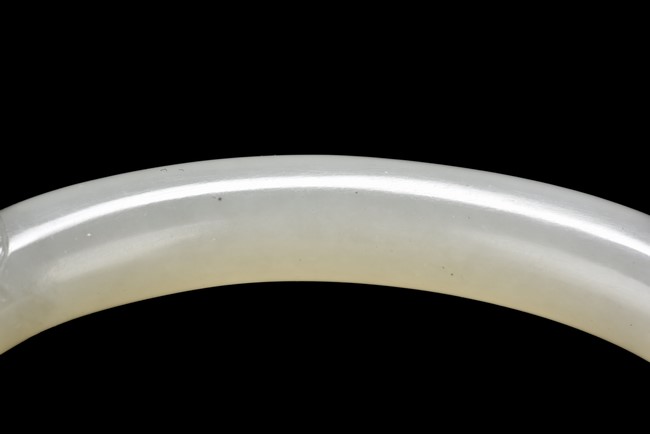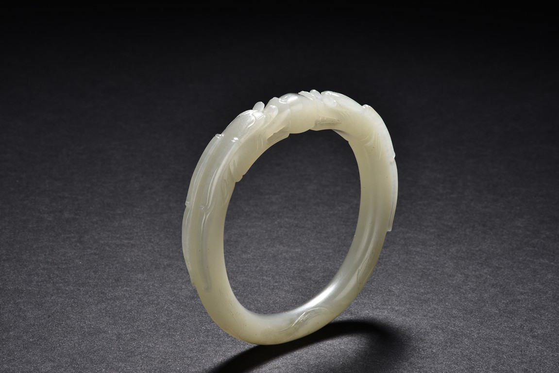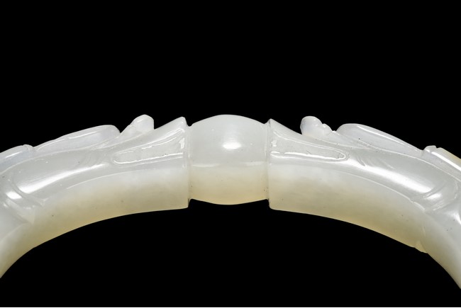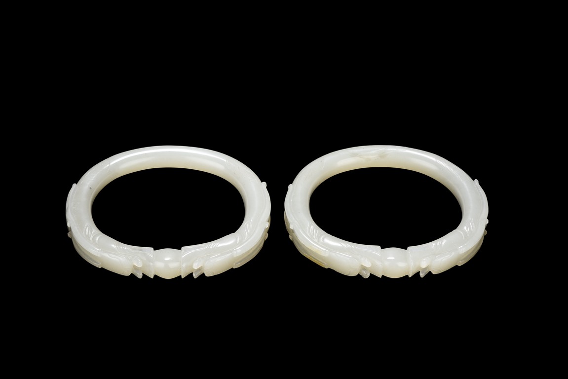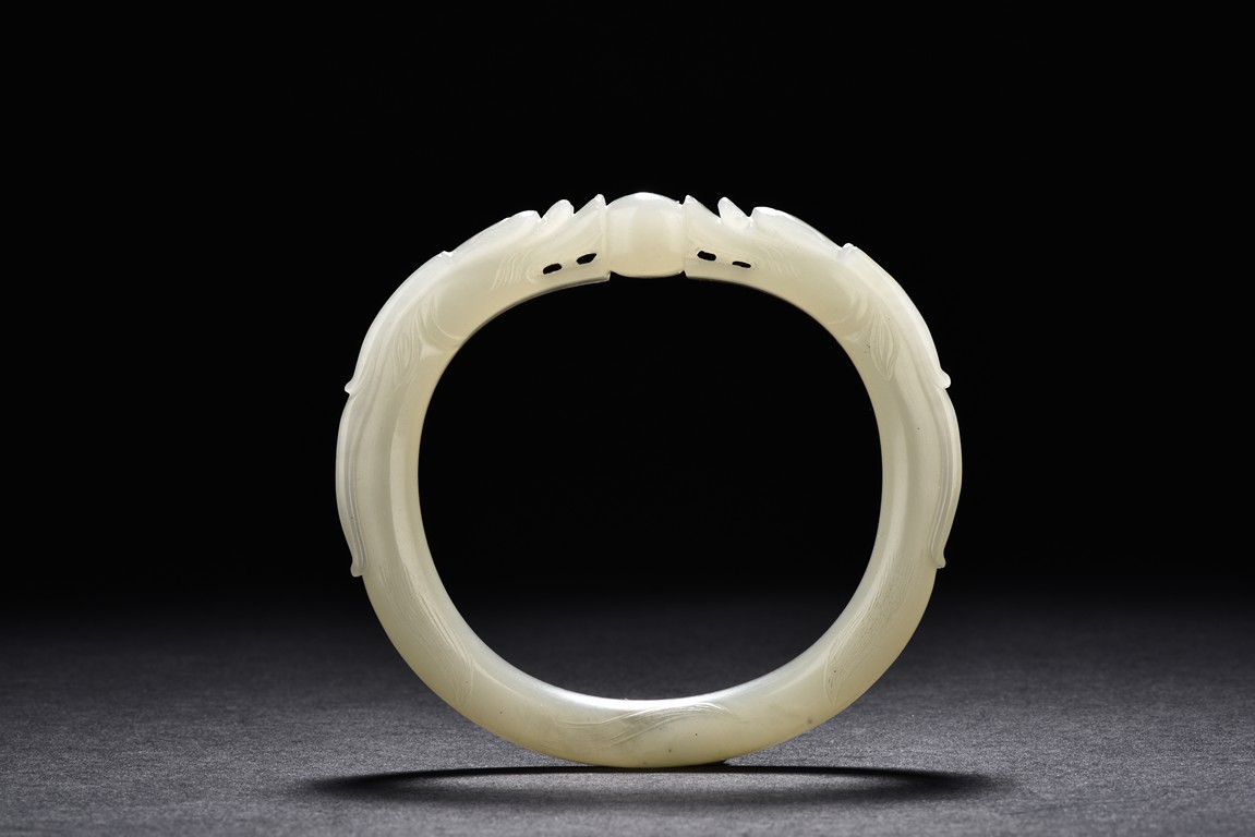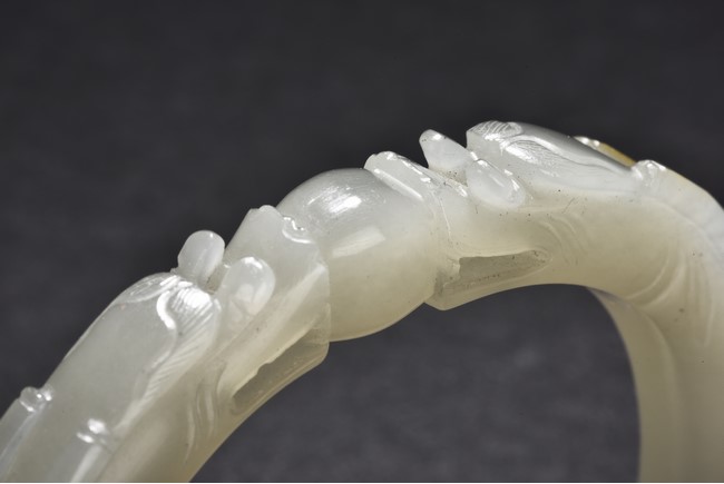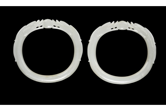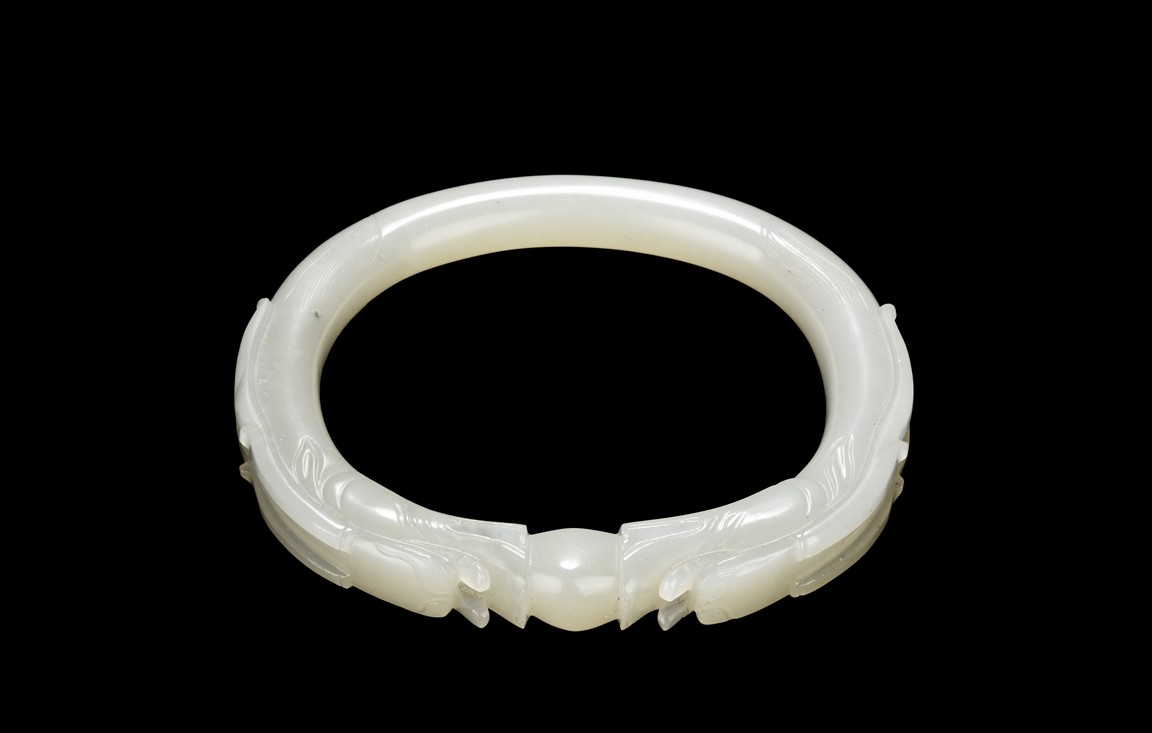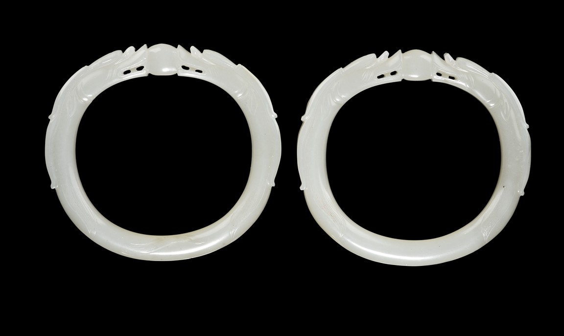 Of slightly compressed oval form, the bangle carved as two stylized confronting dragons aganist the pear. The stone is of translucent even white tone. Qing Dynasty period