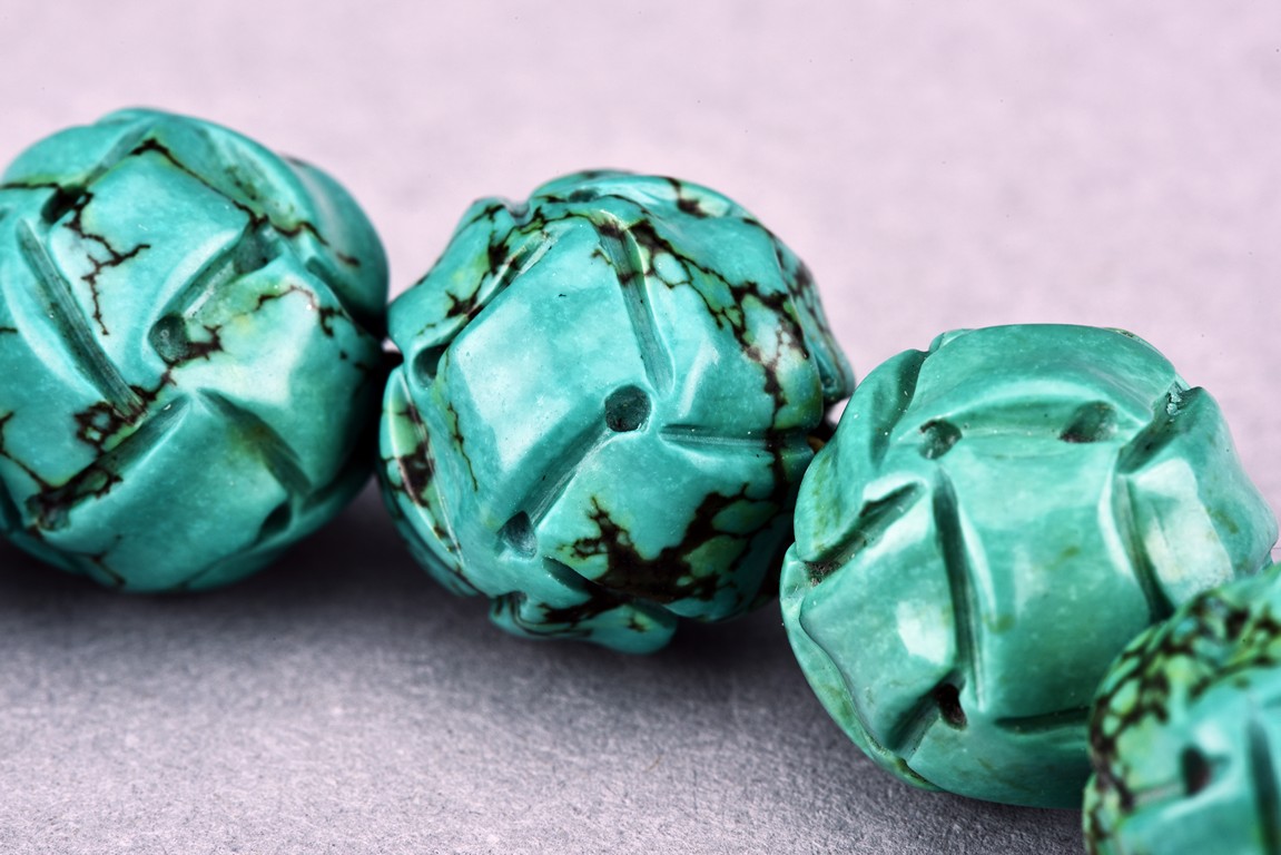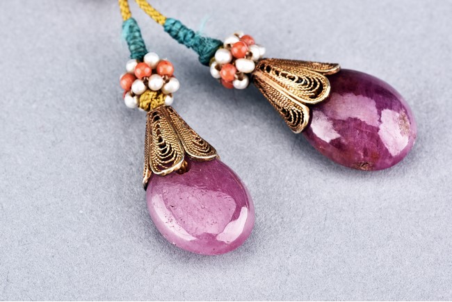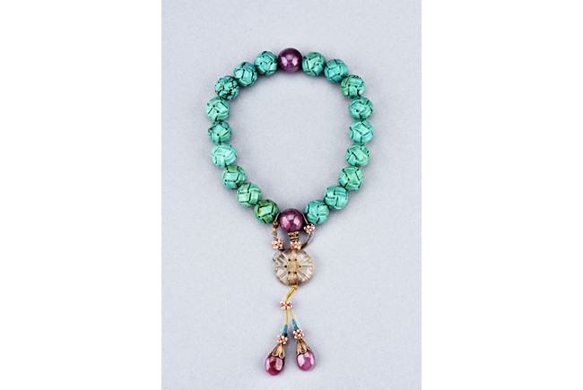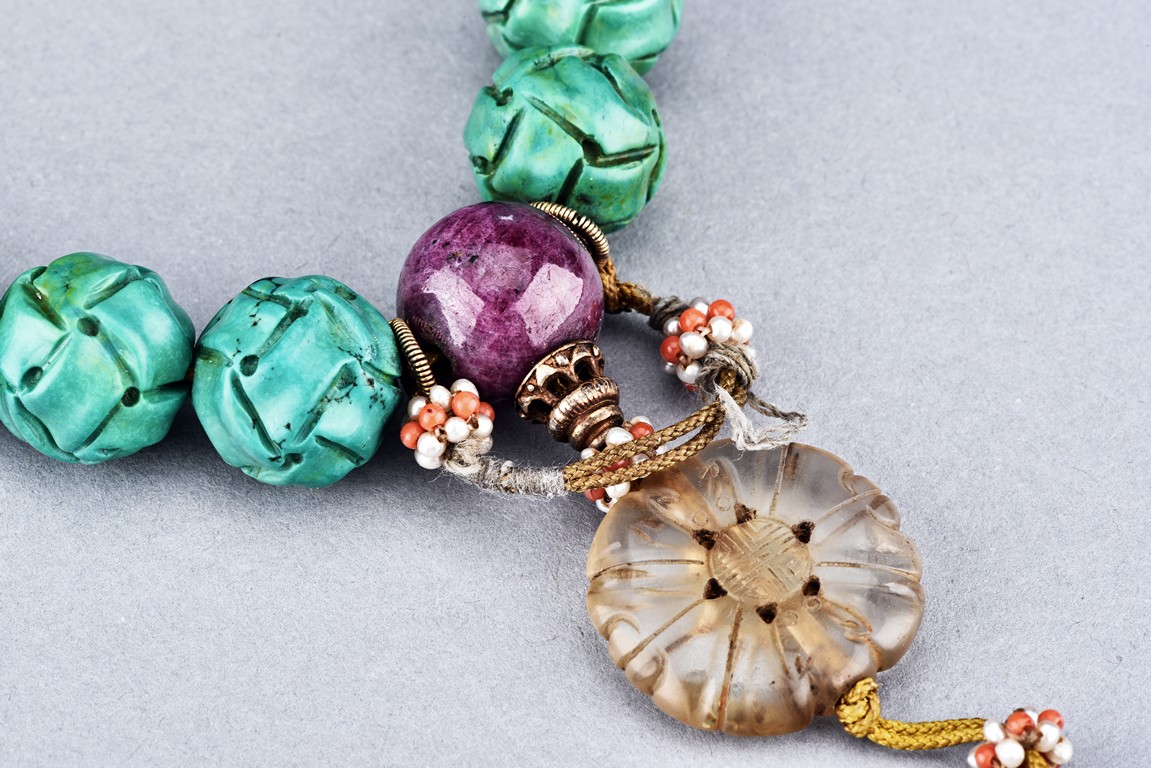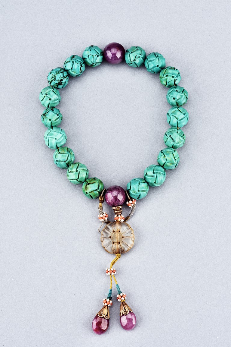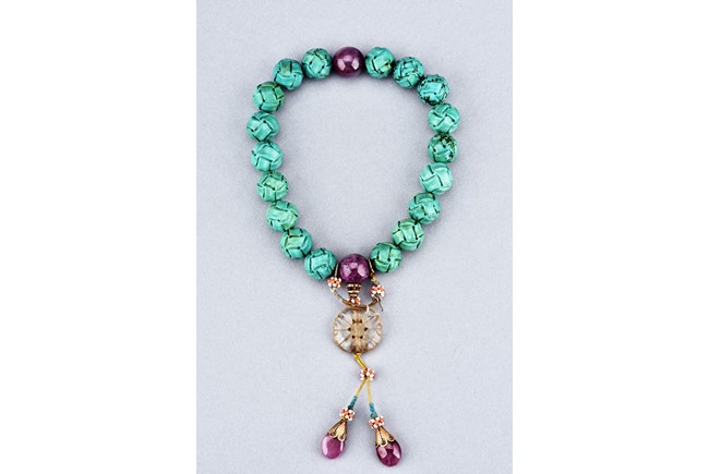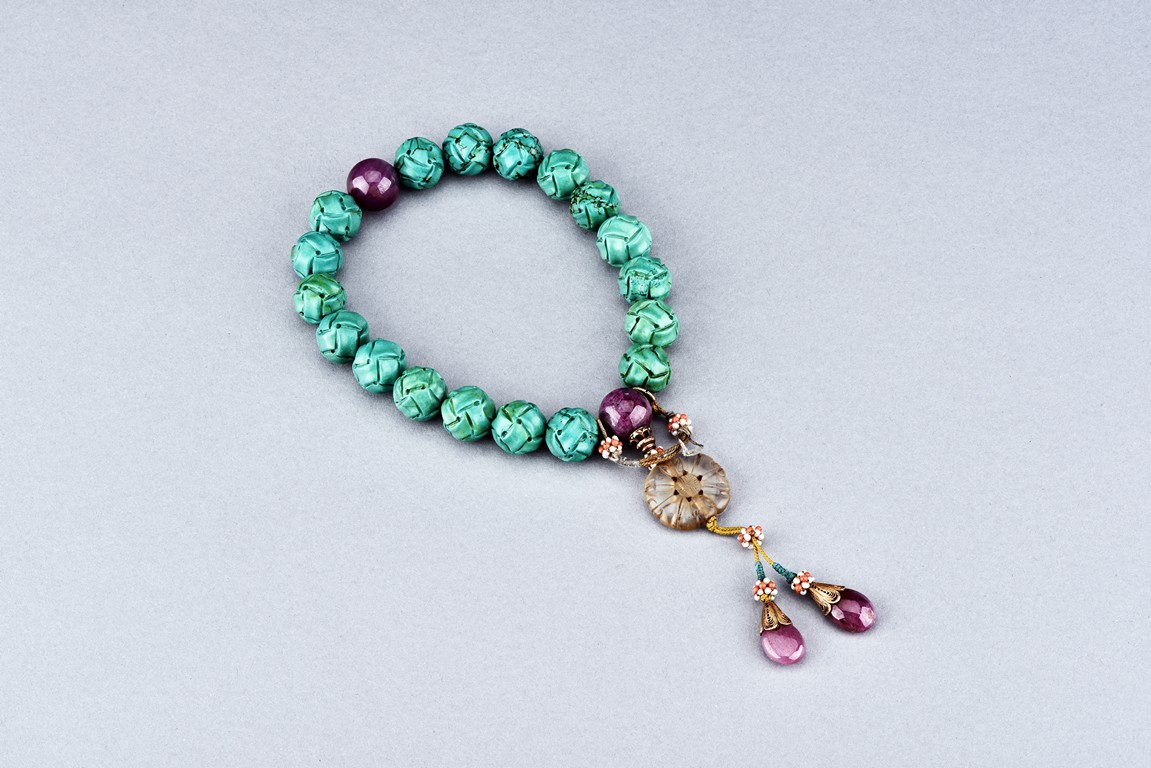 The rosary bracelet comprises of eighteen turquise beads, divided by two ruby beads, suspending a glass bead, terminating in two drop-shaped ruby beads, spaced with clusters of seed pearls. Qing Dynasty period.
