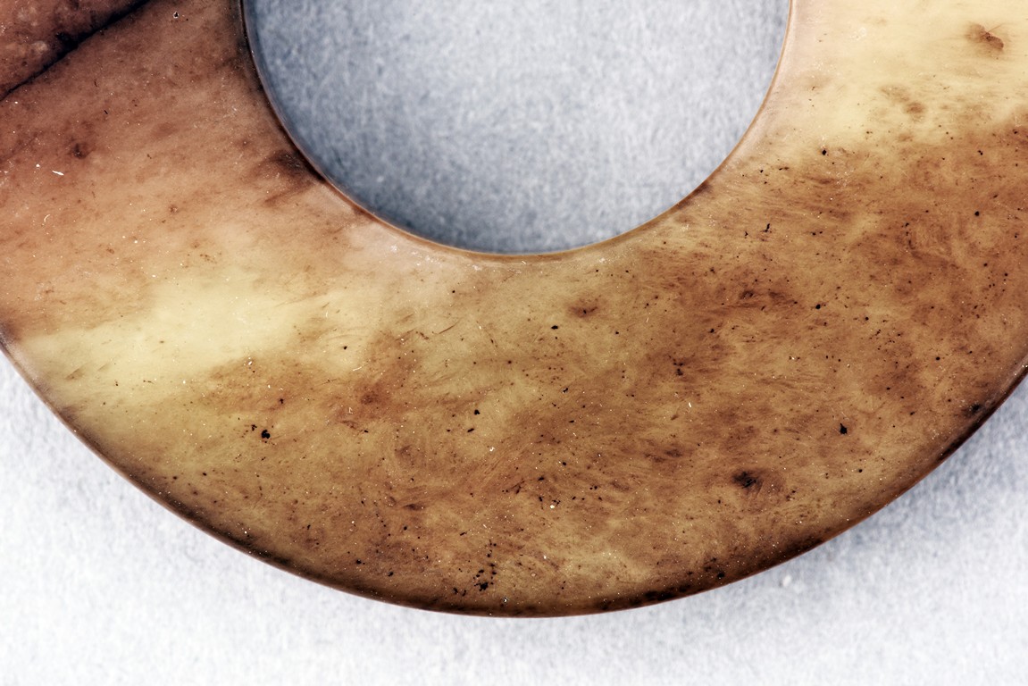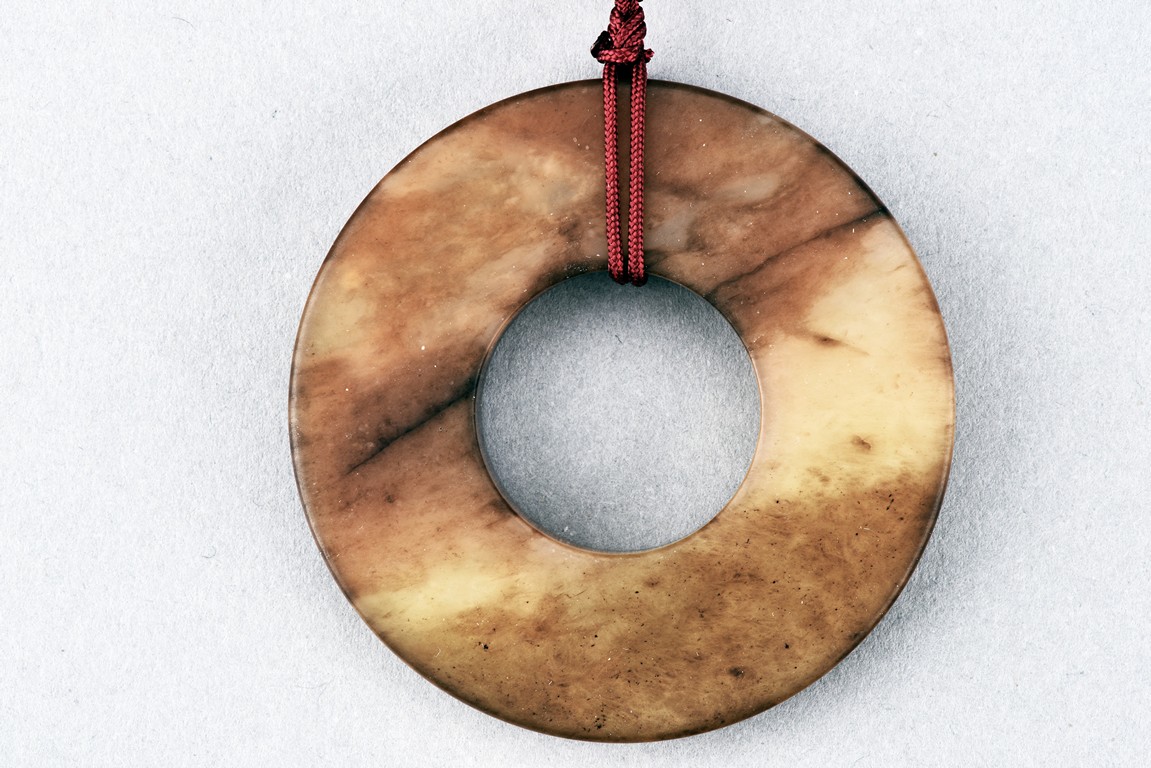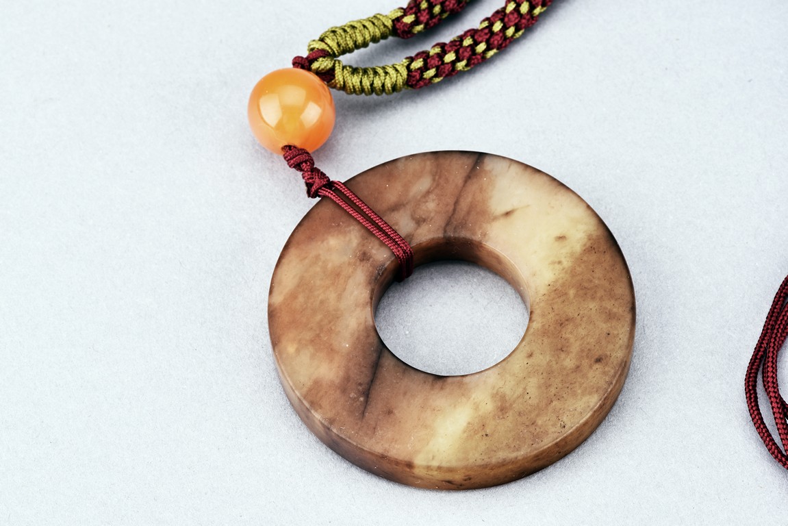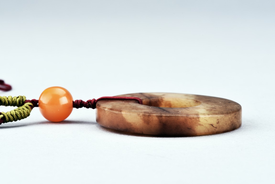 Comprising of a archaic opaque jade disc and a caramel tone amber bead. Warring State period.