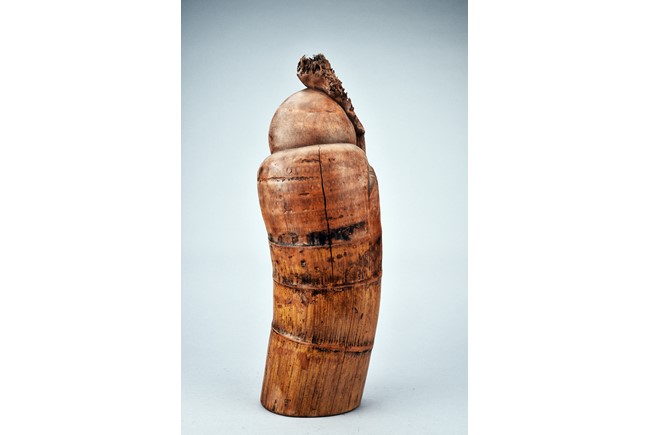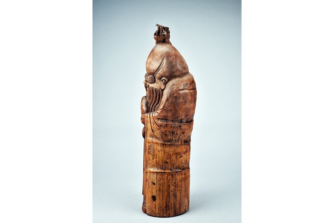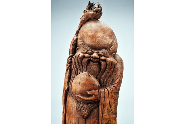 The smiling god of longevity carved standing, with characteristic protruding forehead, framed by long and finely combed beard, dressed in flowing robe, holding a staff in right hand and peach in left hand. Qing Dynasty period.
