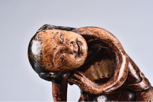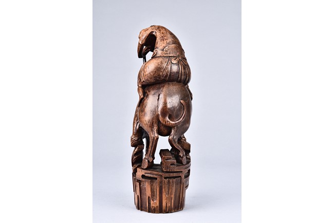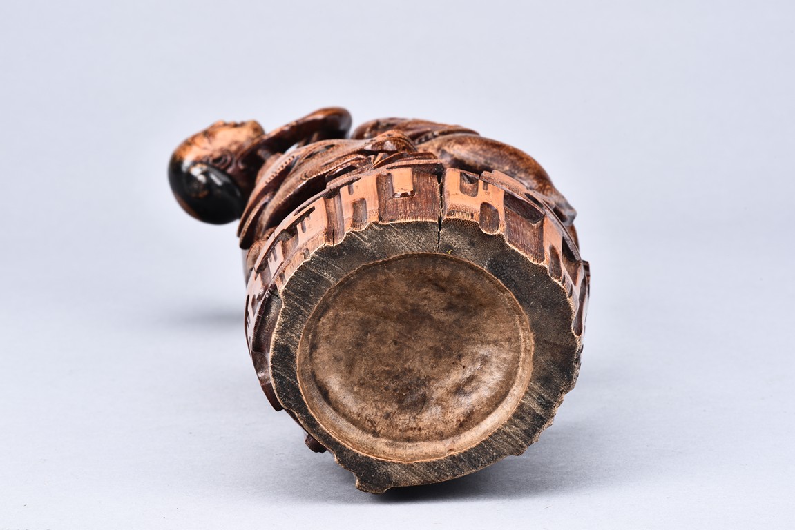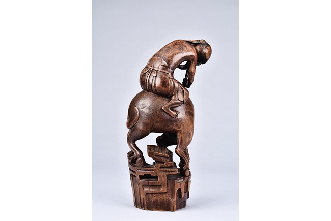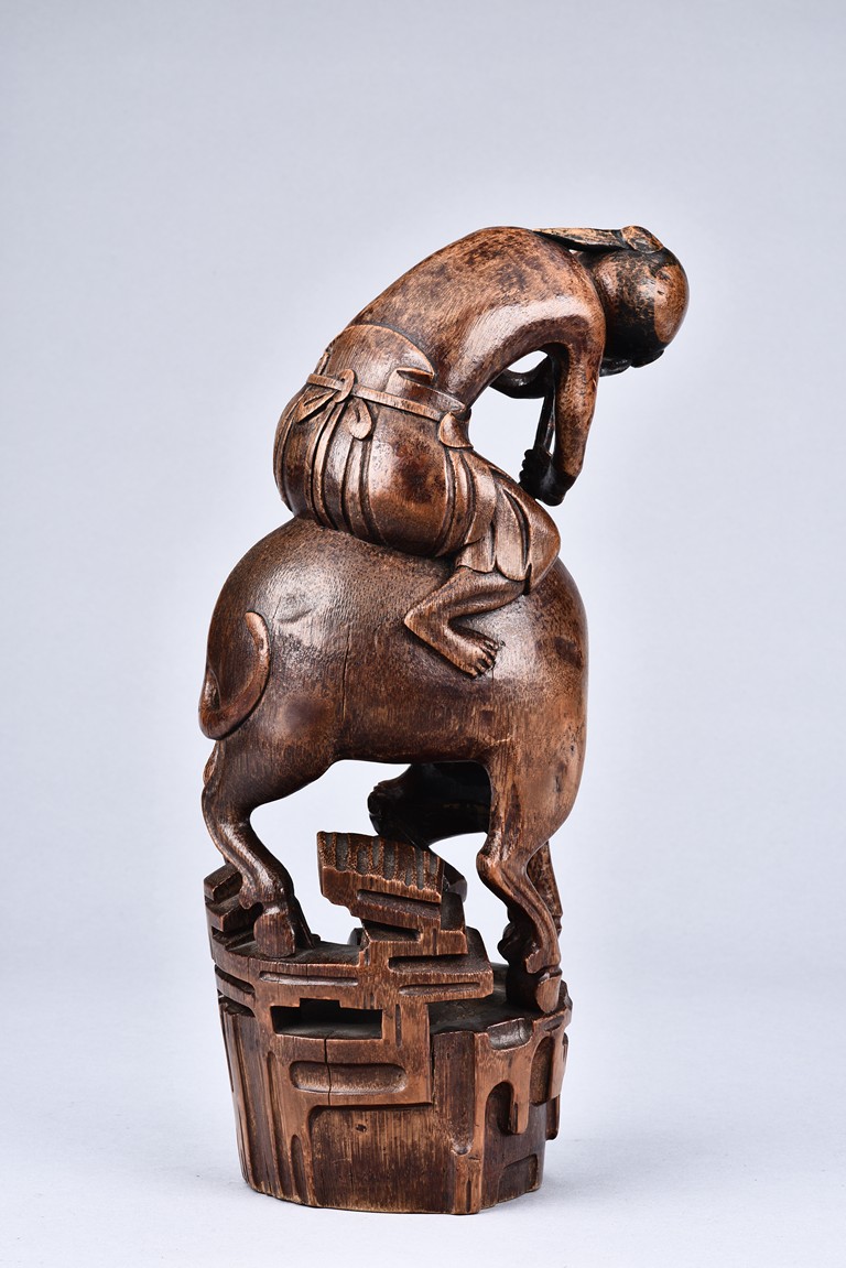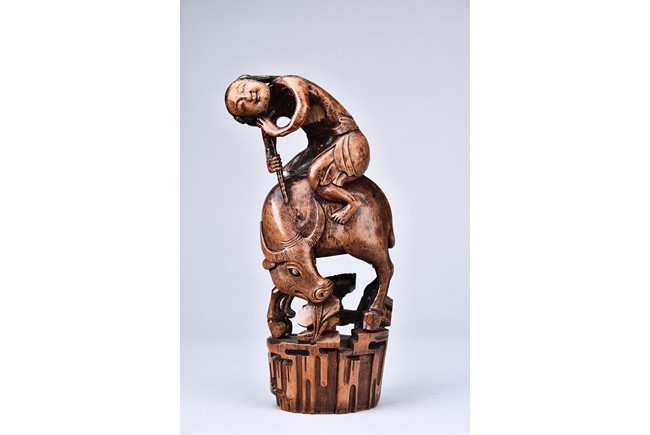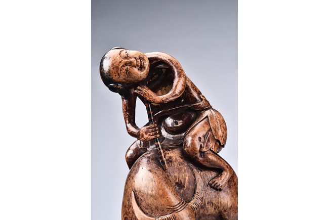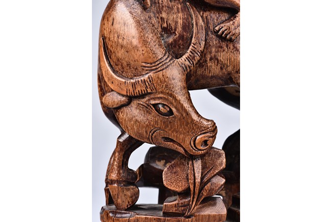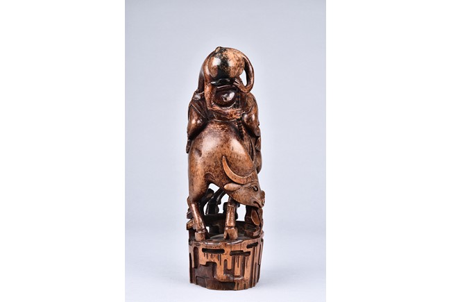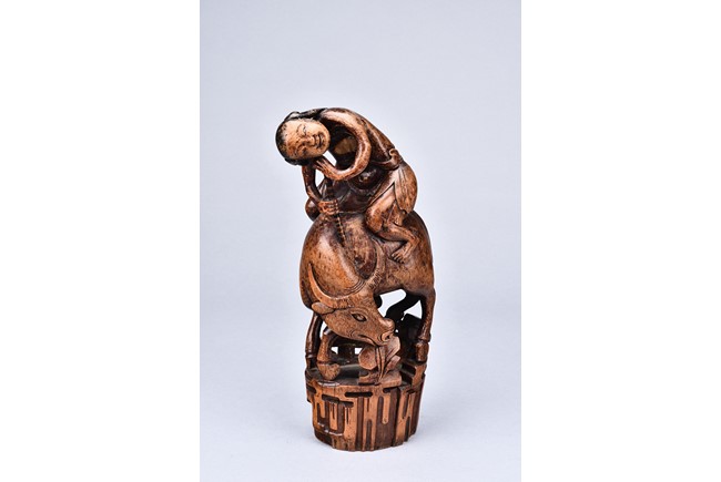 Carved out of bamboo as a boy sitting on the back of a buffalo, kneeling over and holding a flute, the face with joyful expression, and the buffalo shown eating grass, all supported on a cylindrical stand. Late Qing Dynasty period