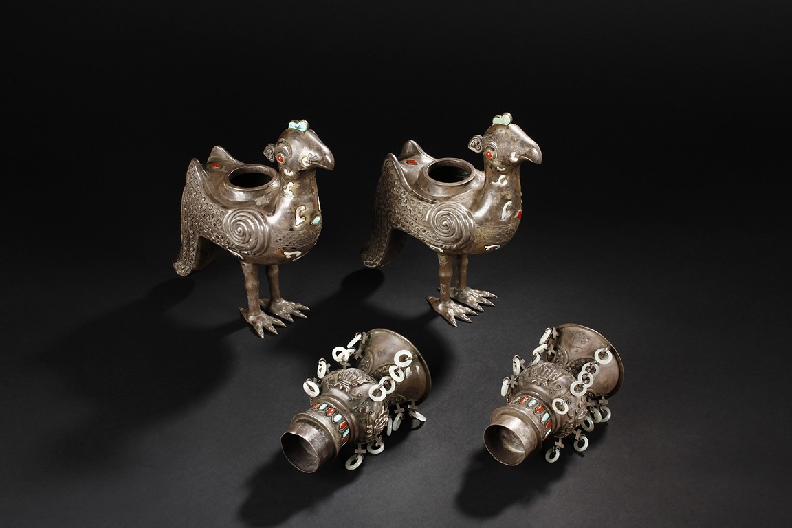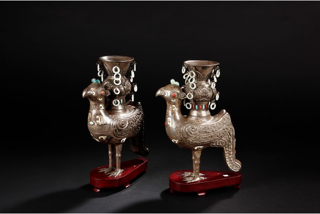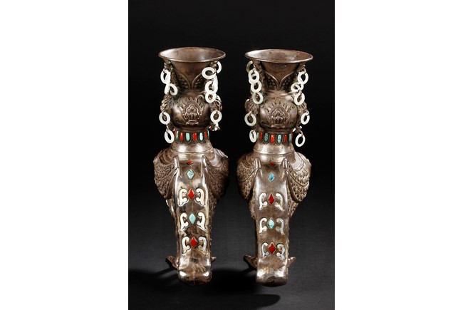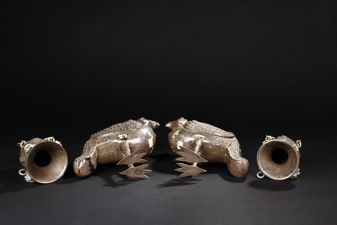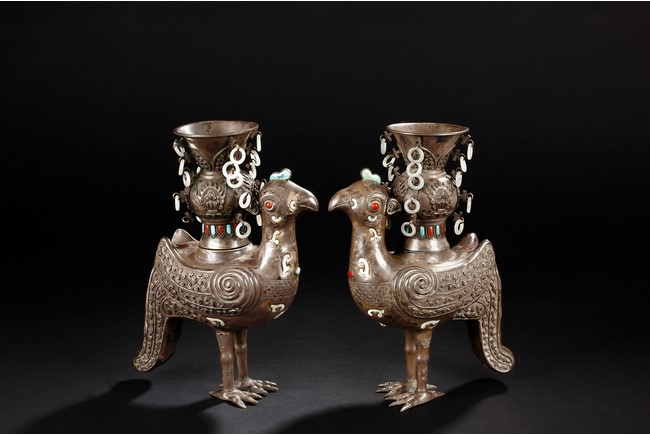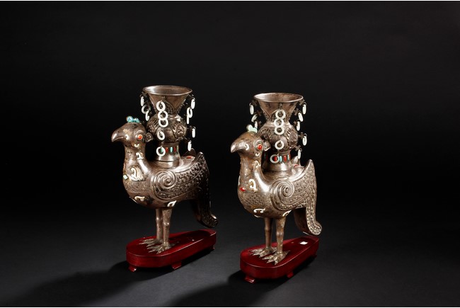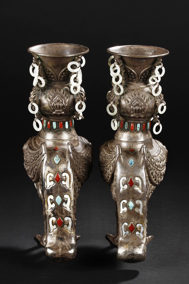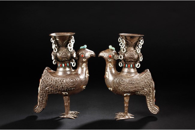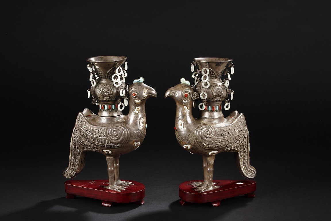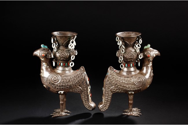 The silver phoenix is cast in pair and decorated with cloud motif in relief to represent the feathers. It is embellished with gems including turquoise and coral beads. Each phoenix carries a Zun-type vessel with numerous white glass rings hanging from the flanges and the body of the vessel cast with Buddhist emblem. Qing Dynasty period.
