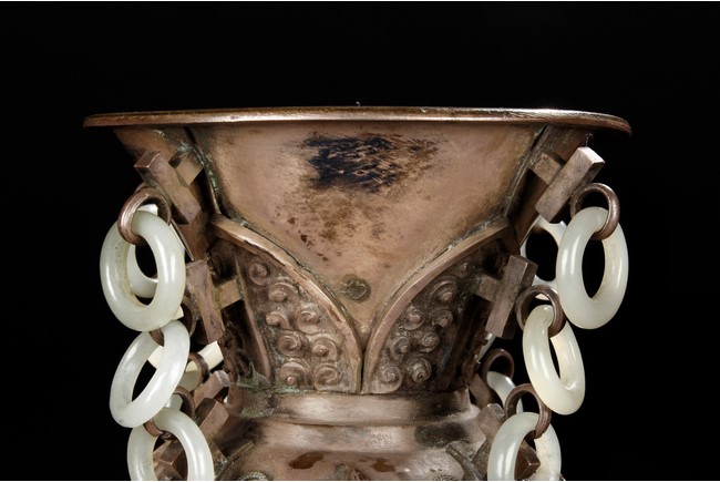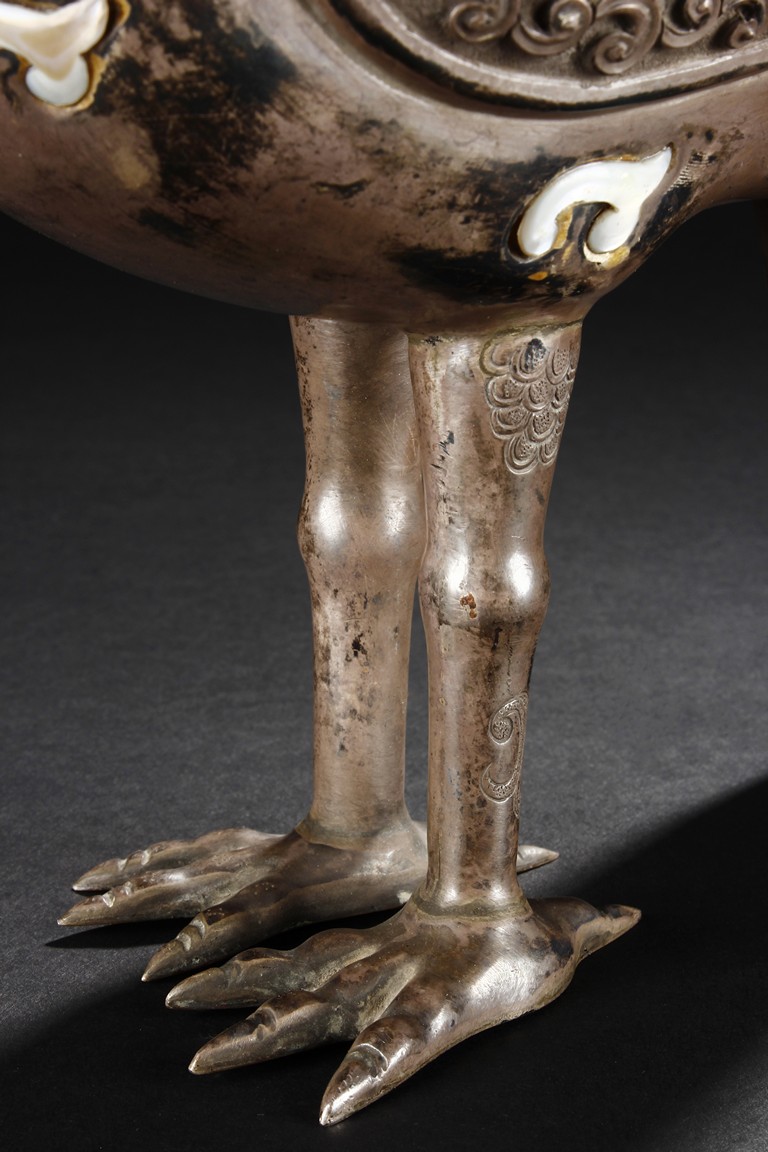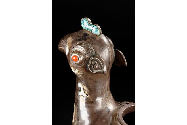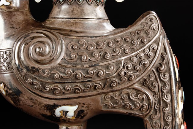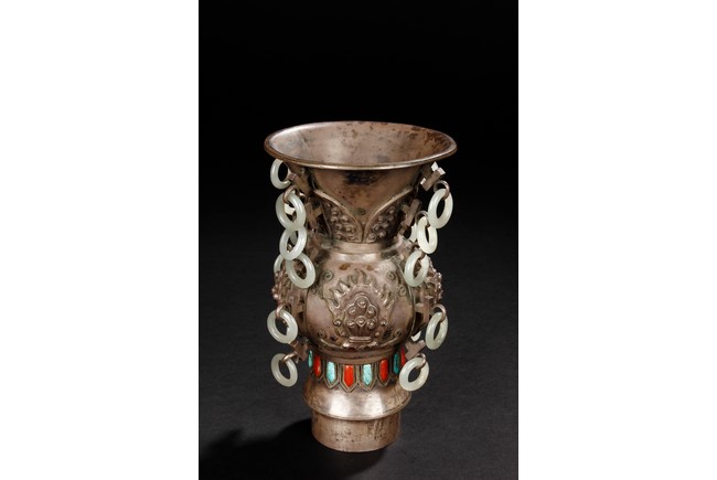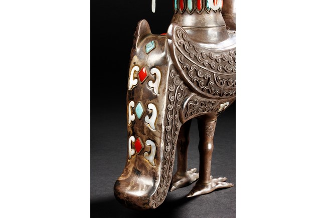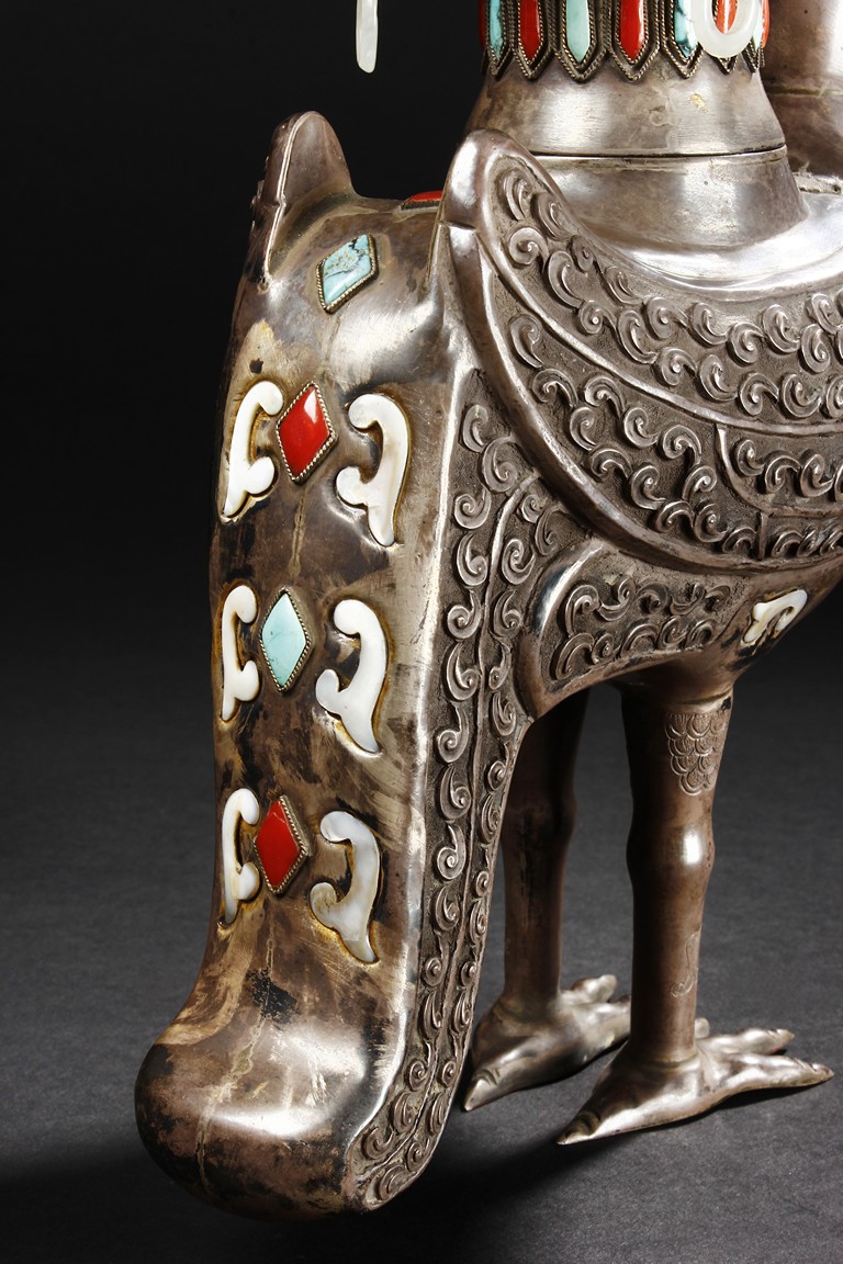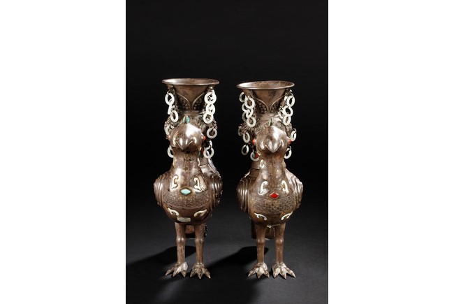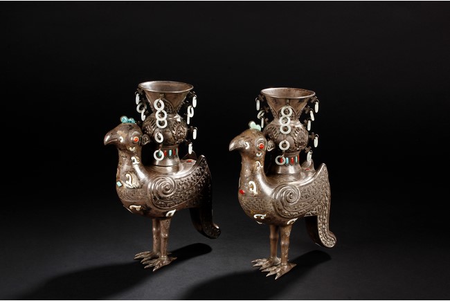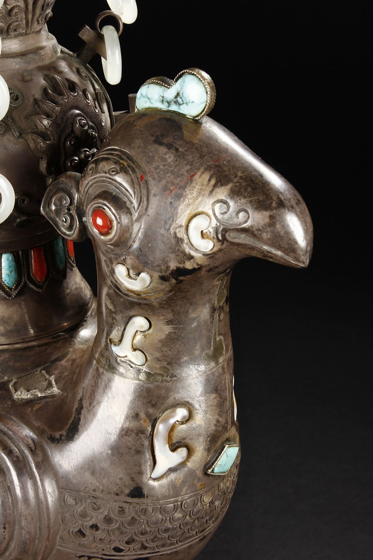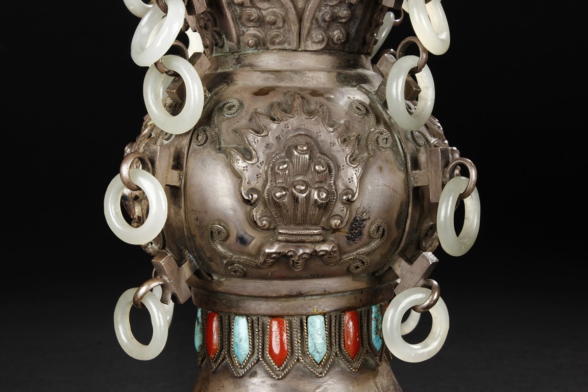 The silver phoenix is cast in pair and decorated with cloud motif in relief to represent the feathers. It is embellished with gems including turquoise and coral beads. Each phoenix carries a Zun-type vessel with numerous white glass rings hanging from the flanges and the body of the vessel cast with Buddhist emblem. Qing Dynasty period.